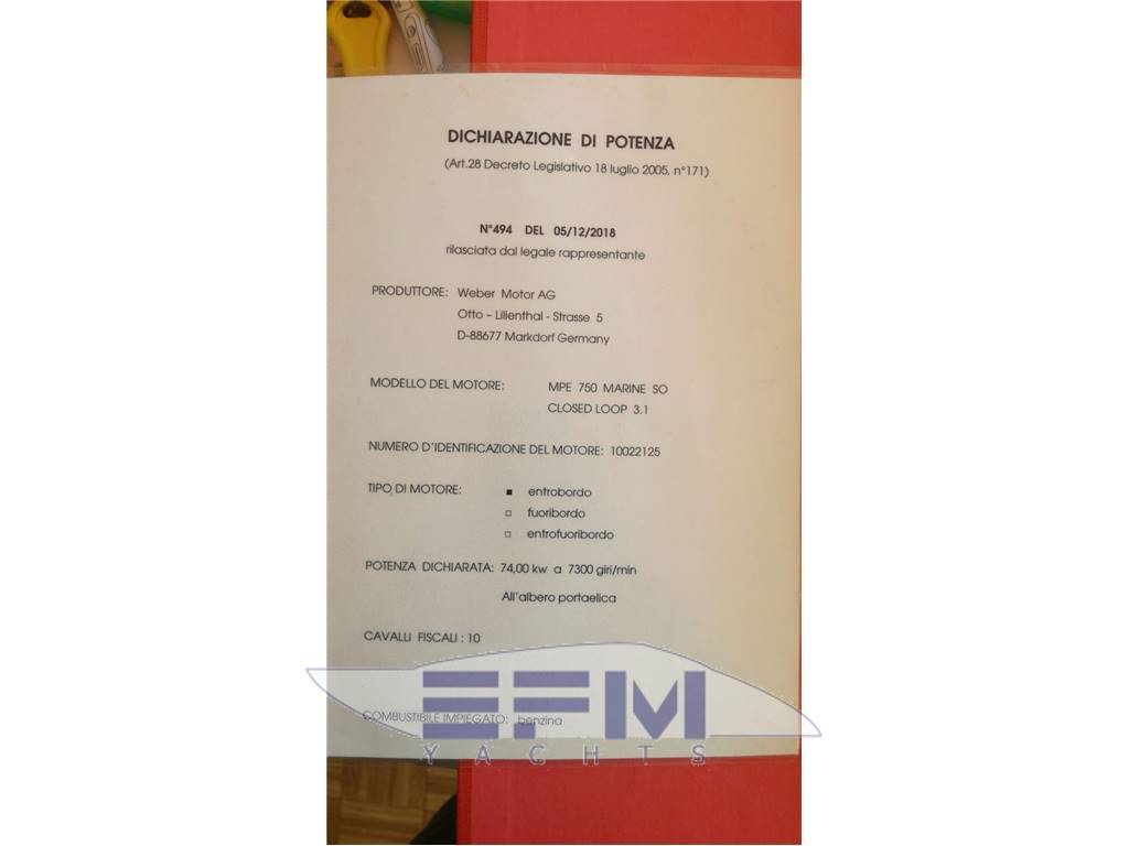 Notas de armamento- motore completamente rifatto nuovo zero ore a fine 2018 e rimesso in acqua a luglio 2020 - cuscinerie complete - telo copri tender - terminali tubolari revisionati 2021 - 2 selle + cinghie fissaggio