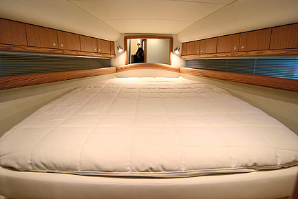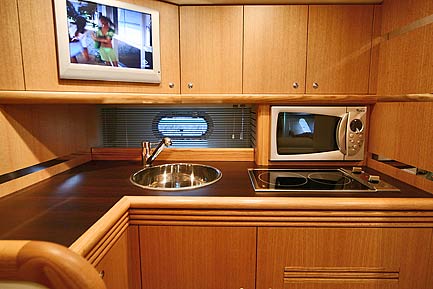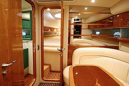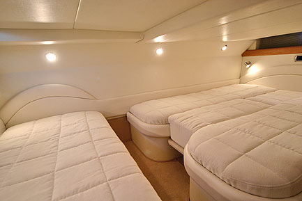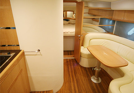 Notas internasCAMAS DE PISO DE LA CABINA HACIA ADELANTE CON DOBLE CAMAROTE CONVERTIBLES EN CAMA DE MATRIMONIO + CAMA INDIVIDUAL-COMEDOR CON SOFà Y MESA-BAÑO CON DUCHA-COCINA CON CRISTAL VITROCERÃMICA, NEVERA, MICROONDAS-PULIDO CEREZA INTERIORES MADERA