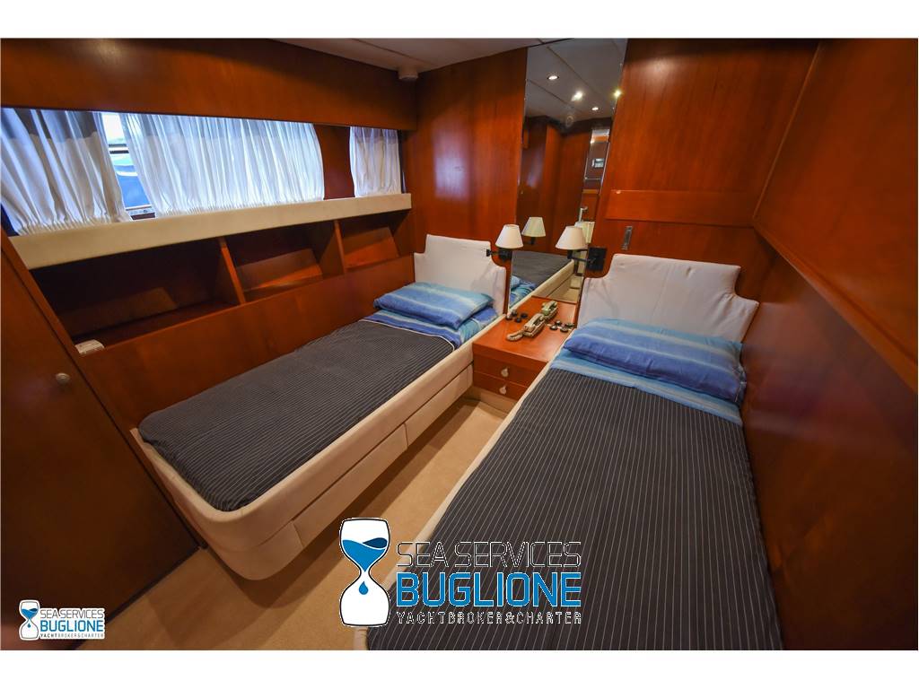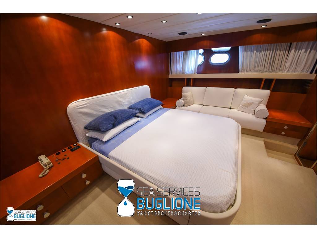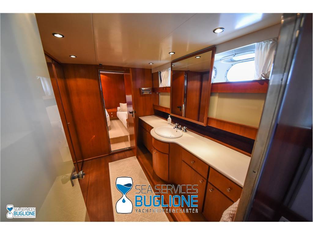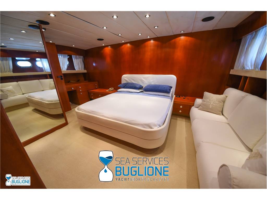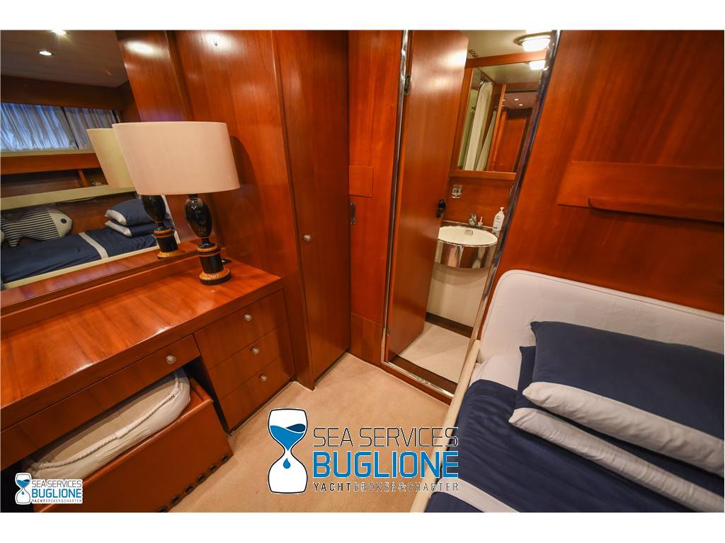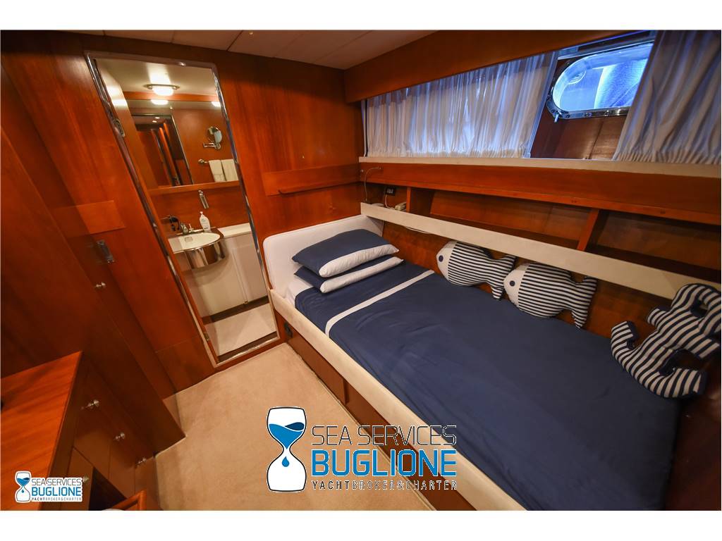 Notas internasCabina armatoriale dotata di letto king size e divano bianco presenti n°4 oblò che garantisco il riciclo dell'aria, inoltre l'impianto dell'aria condizionata è nuovo e sovradimensionato, calpestio in moquette chiara, celino bianco, presenti tanti punti luce di forma circolare. L'ambiente bagno e cabina armadio sono caratterizzati dalla presenza di un lungo corridoio caratterizzato dalla presenza del lavabo e da mobili in vetro contrapposti. Ampio vano doccia dotato di tutti i confort. Cabina studio adiacente alla cabina armatoriale vi è una una cabina con letto singolo dotata di scrittoio e bagno privato. Cabina ospiti con letti in piano calpestio in moquette chiara celino chiaro, armadio in legno, n°2 oblò. bagno privato. Cabina ospiti con letti in piano, n°2 oblò, armadio in legno, calpestio in moquette e celino chiaro. Notas de la instrumentaciónGpsEcoscandaglio Autopilota Vhf Bussola Radar Notas de armamentoPasserella idraulica2 Generatori da 20kw e 15kw Aria Condizionata Dissalatore 300 l/h Inverter Verricelli di manovra a prua ed a poppa Vetrina dei vini in dinette Elica di prua Impianto videocamere sala macchine e poppa |
