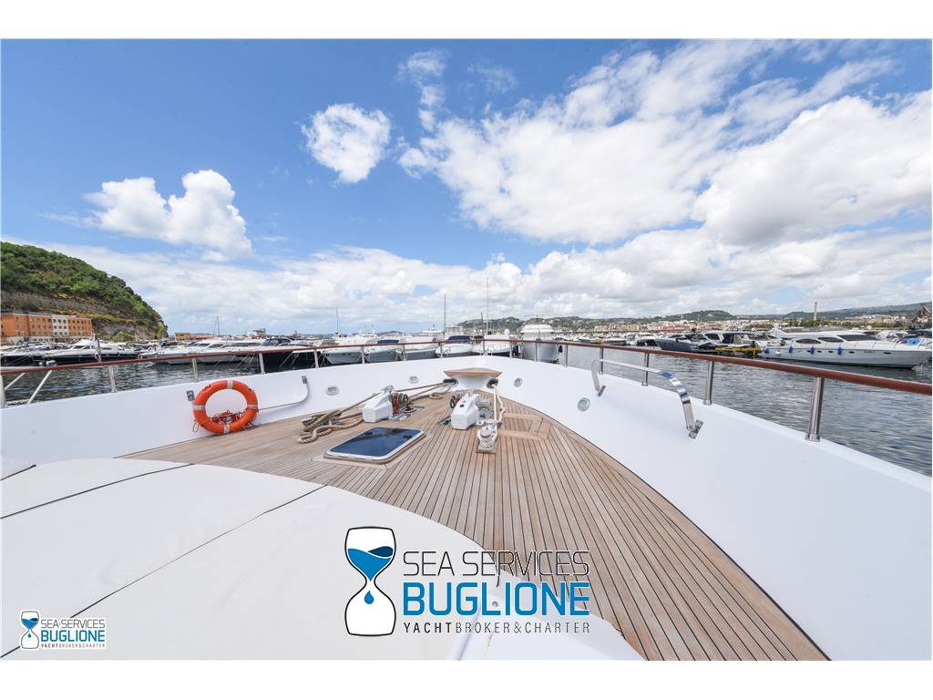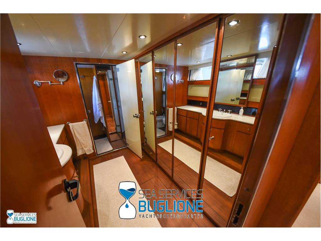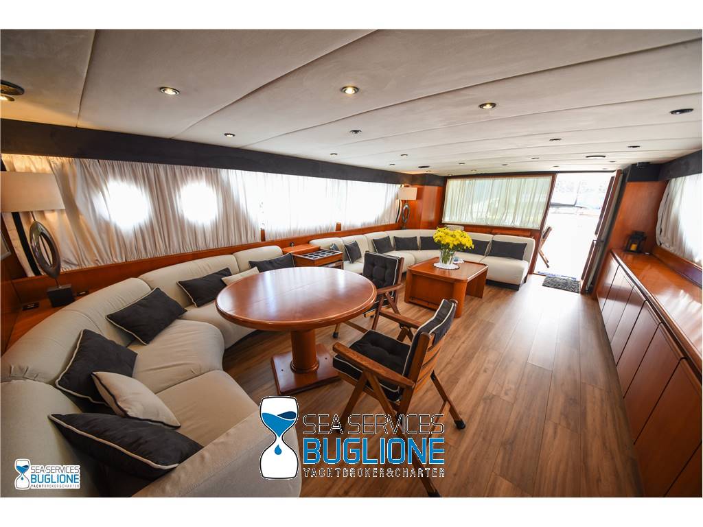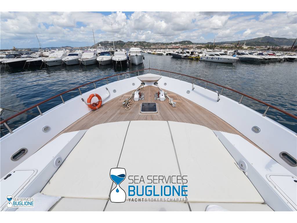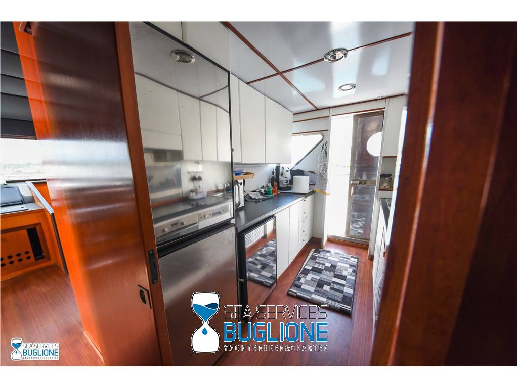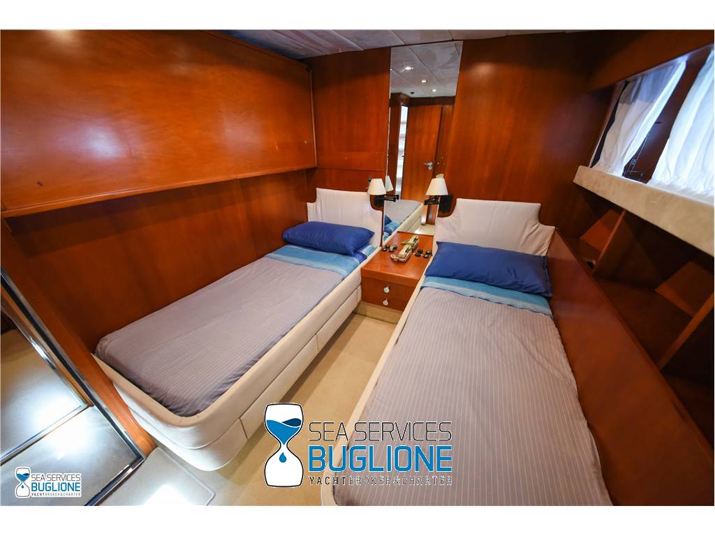 Notas internasCabina armatoriale dotata di letto king size e divano bianco presenti n°4 oblò che garantisco il riciclo dell'aria, inoltre l'impianto dell'aria condizionata è nuovo e sovradimensionato, calpestio in moquette chiara, celino bianco, presenti tanti punti luce di forma circolare. L'ambiente bagno e cabina armadio sono caratterizzati dalla presenza di un lungo corridoio caratterizzato dalla presenza del lavabo e da mobili in vetro contrapposti. Ampio vano doccia dotato di tutti i confort. Cabina studio adiacente alla cabina armatoriale vi è una una cabina con letto singolo dotata di scrittoio e bagno privato. Cabina ospiti con letti in piano calpestio in moquette chiara celino chiaro, armadio in legno, n°2 oblò. bagno privato. Cabina ospiti con letti in piano, n°2 oblò, armadio in legno, calpestio in moquette e celino chiaro. Notas de la instrumentaciónGpsEcoscandaglio Autopilota Vhf Bussola Radar Notas de armamentoPasserella idraulica2 Generatori da 20kw e 15kw Aria Condizionata Dissalatore 300 l/h Inverter Verricelli di manovra a prua ed a poppa Vetrina dei vini in dinette Elica di prua Impianto videocamere sala macchine e poppa |