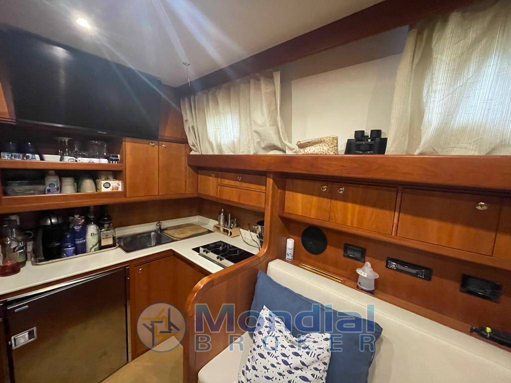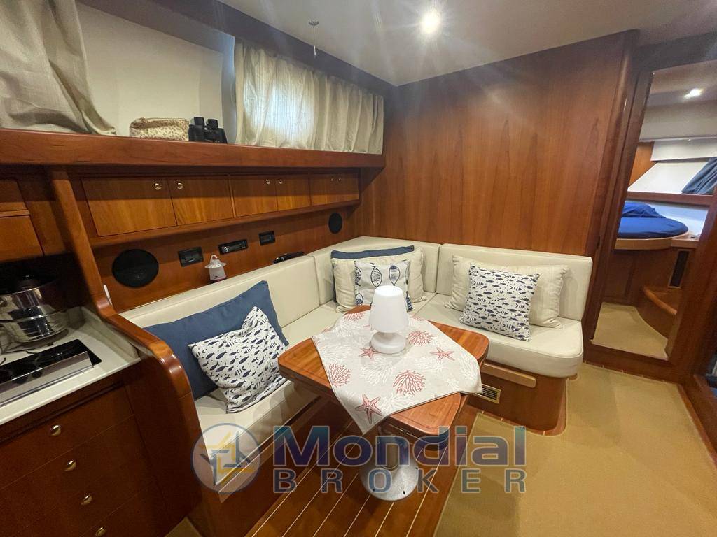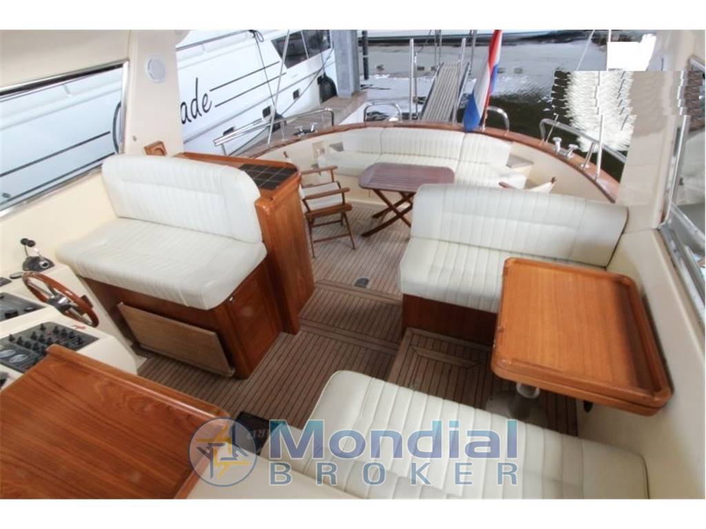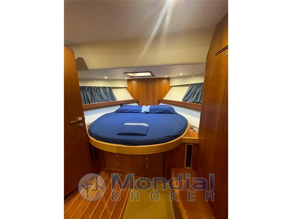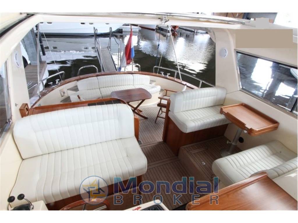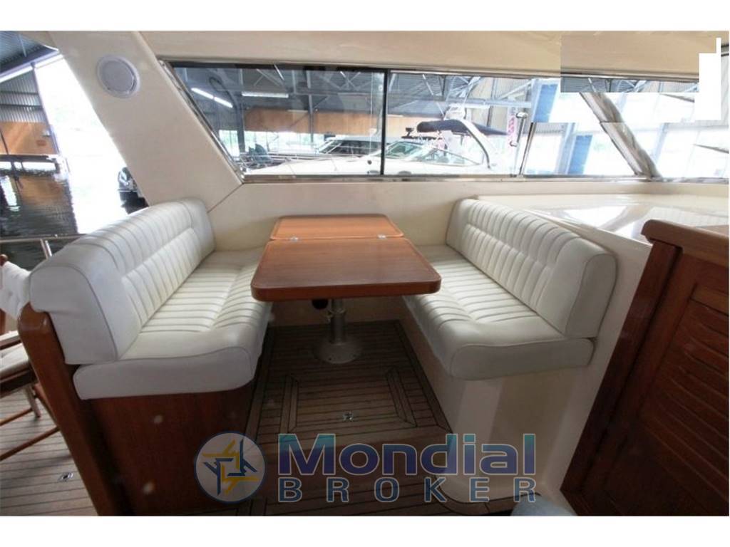 Notas internasPozzetto esterno con divano verso poppa, softop apribile, doppio divanetto e tavolo trasformabile in prendisole a sinistra del cockpit di guida, anch'esso con divanetto. Ampio prendisole a prua con divano. Dinette interna con cucina, doppio bagno con box doccia, cabina matrimoniale a prua e cabina con doppi letti in piano e prolunga centrale nella cabina di poppa.