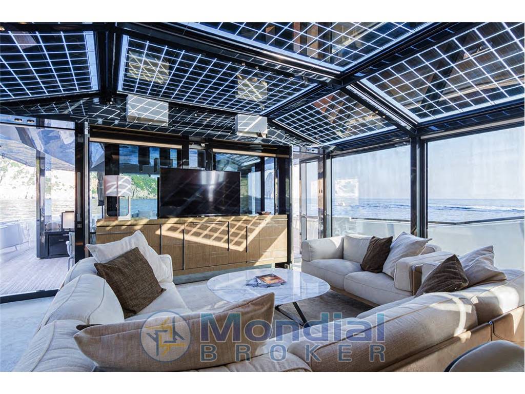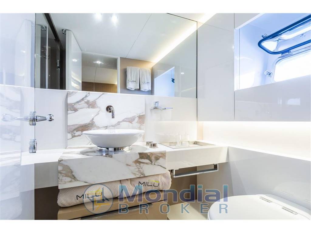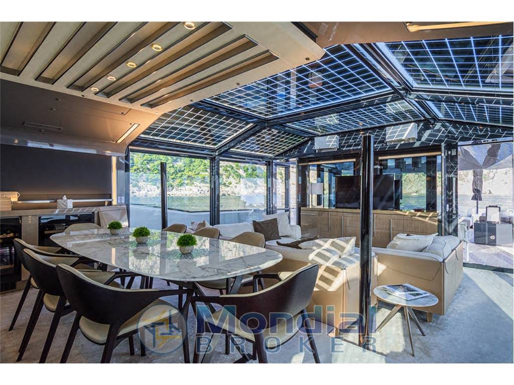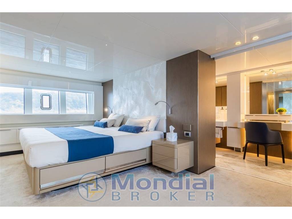 Notas internasExterior living is exceptionally spacious. Stepping aboard, the aft deck is immense, offering a full exterior lounge, al fresco dining table, fold out balcony, comfortable sunbathing areas and partial shade. 8 Guests in 4 en-suite staterooms Guest Cabin Configuration: Owner: Large Master suite with walk-in wardrobe, en-suite His & Hers bathroom and shower on the lower deck Guests: 1 VIP double cabin, 2 Twins, each with its own private bathroom on the lower deck Crew Accommodation: 2 x Double cabins for 4 with bunk beds and bathroom All cabins have their independent A/C and A/V systems Poltrona Frau interiors - bleached oak parquet living room and owner's bedroom Notas de la instrumentaciónCOMMUNICATION SYSTEMSVHF: Raymarine RAY90/91 Cellular Phone System: Fritz NAVIGATION SYSTEMS Radars: Raymarine quantum 2 Gyrocompass: Airmar Auto Pilot: Raymarine p70s – Evolution EV1 and ACU Depth Sounder: Raymarine CP100 Night Vision: Thermal Camera Flir – Raymarine T350 GPS: Raymarine RS150 Notas de armamentoAnchor Windlass: Lofrans – Project X4 R/OAft Warping Capstans: Lofrans – T. 1700 Anchors: 80kg Anchor Chain: 150m/12mm diameter chain Boat Crane and Davits: Opacmare Passerelle: Opacmare 4,0 m/150kg Swimming Platform: Extra to UP & DOWN 900kg |