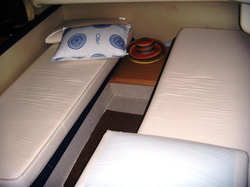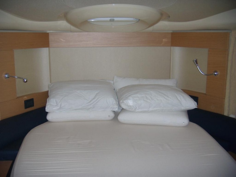 Notas internasCamarote del propietario es adelante, salida de luz de las ventanas laterales y la puerta de la escotilla en el techo, es el camarote con dos camas individuales en el centro de la embarcación; uno de ellos es la diapositiva para convertirse en cama doble. La vista exterior es asegurada por la puerta, a la izquierda es la cocina que crea una asimetrÃa intencional y agradable. Impresiona el tamaño de dos baños, ambos con cabina de ducha separada. Los acabados son de madera de roble decapado. Agradar a los juegos generados entre los muebles claros y oscuros y recubrimientos claros. La cocina está en un nivel intermedio entre el salón y dormitorio, sigue siendo bastante aislada y esto es bueno en un barco. El piso es de madera bajo la olla es una de las dos bombas de achique de emergencia.