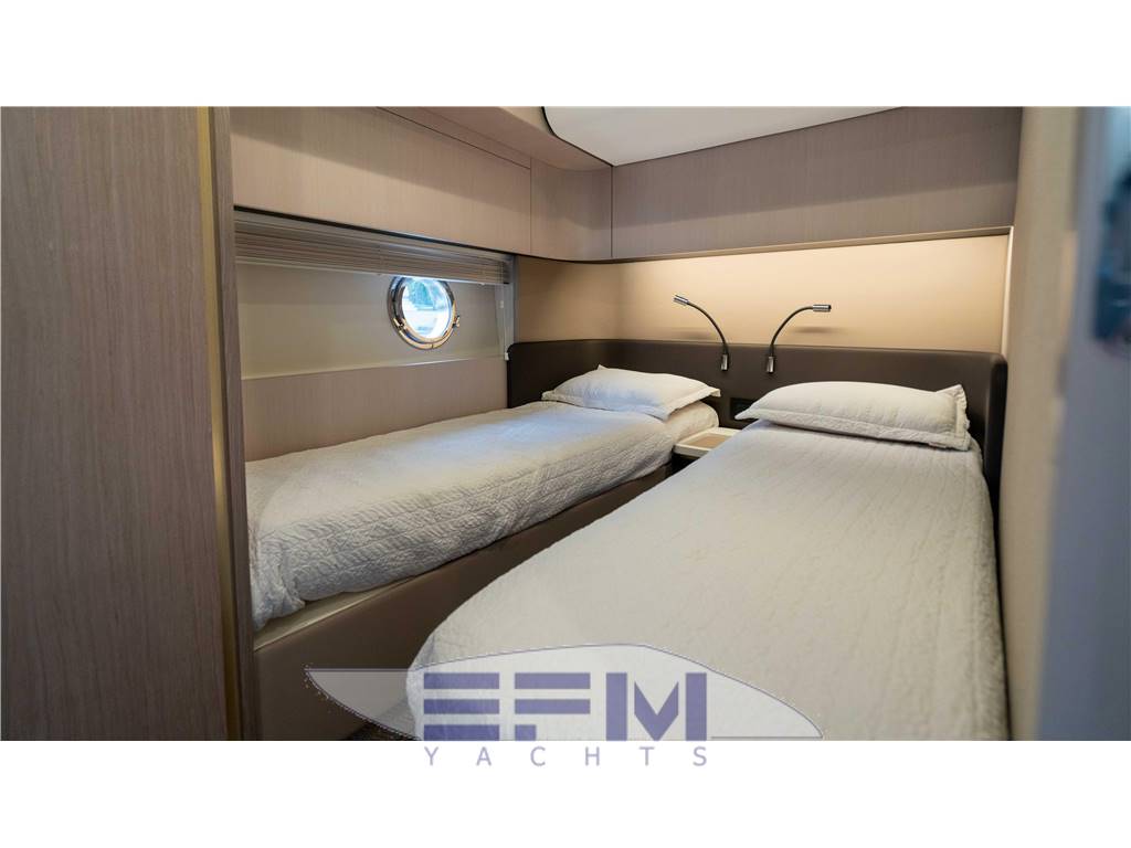Notas internas• The VIP is situated forward with a beautiful centerline queen berth and large hullside windows with 2 opening port holes. • The sole is lined with a decorative carpet with gray tines while the Sand Oak cabinet finish and gold accents continue throughout. • There is ample storage in the VIP with 2 large lockers aft and overhead storage to port and starboard. • USB and 110V outlets are standard along with 2 LED reading lights at the head of the berth. • The access to the en-suite head is aft and to port with a separate entrance in the companionway for the guest stateroom. Guest Stateroom • The guest stateroom is to starboard just as you walk down the 5 steps from the salon. The guest room has side-by-side twin berths with a small night stand in between. • There is a very large hanging locker forward and another storage cabinet above the port hole. • All staterooms feature a digital Dometic AC control. • The head is just across the hall and as a separate shower stall, beautiful marble counter top with deep basin sink and an electric Tecma head. Master Stateroom • The full-beam master stateroom is situated aft and is unmistakably a truly Azimut feel. • The queen berth is set at an angle giving plenty of room to walk around both sides. • The massive waterline windows lend to tons of natural light and really make you feel one with the sea. Built into the windows are 2 smaller opening port holes. • The Sand Oak finishes and gold accents continue throughout the master as does the beautiful carpet with beige and gray tones. • There is no shortage of storage in the master with a full set of drawers to port and 3 additional lockers throughout. • There are seats on either side of the dresser creating a nice vanity space. • Just forward to port next to the entry door is the en-suite head which features a spacious stall shower with bench seat, large marble vanity top with storage above and an electric Tecma head. Crew Cabin • The crew cabin is accessed either from a transom door or underneath the cockpit seating area. • The crew area is set up for a single captain and features a twin berth, Tecma head and basin sink with pull out shower wand. • Access to the steering system and hydraulic pumps is just below the hatches along the aft side of the crew cabin. • The SeaKeeper Gryo is just below the berth. Notas de la instrumentaciónHelm Stations• The 55 is equipped with R6 MAN engines producing 800 HP each. They are controlled with electronic throttles and all the data is displayed on a 7 inch LCD display at both helm stations. The Joystick system also has an additional LCD screen that shows the gear and rudder angle for both main engines. • On the main Raymarine screen you can access the ship's systems including the bilge pumps, battery voltage, tankage, Air Conditioning and alarm panel. • Docking is made easy with the addition of the Aventics joystick and additional Side Power bow thruster control. • She has a full suite of Raymarine Axiom electronics with dual, 12 inch touch screens and separate autopilot and tri-data displays. Also equipped with an open array Raymarine radar. • The seakeeping on the 55 is second to none with the Seakeeper 9 Gryro coupled with the ZipWake trim tab system. Both have easy to read displays on the starboard side of the helm. • Just below the wheel is the controller for the ACR spotlight, SeaFire control panel and handheld Raymarine VHF. Performance • The 55 Fly is equipped with 800 HP R6 MAN engines which you would traditionally find in the larger 60 Flybridge. That being said, she has no shortage of power and delivers speeds of over 30 knots. • 670 RPM - 6.6 knots • 830 RPM - 7.5 knots - 4 GPH • 1200 RPM - 10.2 Knots - 16 GPH • 1800 RPM - 20 Knots - 44 GPH • 2350 RPM - 31 Knots - 80 GPH Engine Room/mechanical • The 55 Fly is powered with twin R6 MAN engines producing 800 HP each. They are barely broken in with only 110 hours. • The AC chiller is Dometic and is 60,000 BTU. • Kohler generator is 21 kW. • Side Power Bow Thruster. • Automatic SeaFire Halon fire suppression system. Notas de armamentoCockpit/swim Platform• The cockpit of the 55 Fly is one of 3 spacious, outdoor entertaining spaces. • The sole is covered in beautiful teak that continues down to the hydraulic swim platform. • The u-shaped settee can double as an additional dining space as it is situated around a large teak dining table with a stainless pedestal base. • Serving from the galley is made simple with the bifold doors and electric window that drops down at the galley counter top. • To port and starboard are boarding doors and just aft are heavy, stainless cleats and electric mooring winches. • The crew cabin is accessed through a transom door or via a hatch underneath the cockpit seating. • The Swim platform is accessed on the port side with storage flanking either side of the transom. • The battery switches are conveniently located to starboard as you enter the main salon door with additional storage space below. • Teak steps along the port side take you up to the flybridge. Galley • The re-designed 55 Fly features the desired aft galley with beautiful Sand Oak cabinetry and dark counter tops. The Sand Oak cabinetry is complemented with gold accents throughout and a nice selection of colorful headliner materials. • As you make your way through the main salon door you will notice how spacious the galley is. The main door opens up to create an even larger al fresco space and the electric window aft of the galley drops to create a nice bar/serving area. • The galley is equipped with a Dometic fridge/freezer, Miele 4-burner cook top, and Miele convection oven. • To starboard is lots of additional storage space as well as the main breaker panel for AC and DC controls. • The Azimut branded dish ware and glassware is stored just forward of the breaker cabinet as well as underneath the lower 