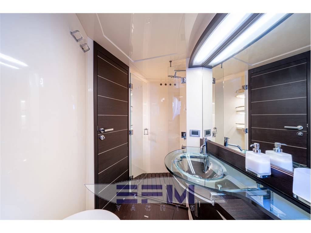 Notas internasBerths 6 + 2 Head compartments 3 + 1 Il cantiere di Avigliana, leader mondiale nella produzione di superyacht nonché di flying bridge plananti con dimensioni fino a 116 piedi, ha presentato all'ultimo Salone di Genova la sua prima creazione "open" firmata dall'arch. Stefano Righini, un bello scafo slanciato dall'inconsueto color rosso amaranto. Se in diversi accenni stilistici, come le codine al roll-bar e la finestratura a pinna di squalo inversa, il nuovo 68 S richiama il "family feeling" della più recente produzione Azimut, in altri dichiara una sua marcata personalità; ad esempio, per la particolare finestratura quadra che audacemente interrompe la superficie filante della fiancata, per la presa d'aria ad apertura proporzionale, per l'hard top a scomparsa, e ciò solo per "citare" gli esterni; sul ponte e nel lay-out di sottocoperta, l'innovazione è votata al comfort di chi compra e utilizza una barca di questo tipo, prevedendone un uso prevalentemente estivo, "solare" quindi, con molto day cruising e un po' di crociera. Il living è grande e luminoso, interamente sviluppato sul "main deck", per vivere mare e sole a 360°, senza però precludere da un riparo in caso di maltempo, grazie alla presenza di un tettuccio rigido scorrevole, alle ampie finestrature e alla paratia in cristallo che chiude l'ambiente verso poppa. Grazie a ciò, più che un open vero e proprio, il 68 S si potrebbe definire un bel "coupé" del mare. Sottocoperta le aree notte, sia ospiti che armatore, sono completamente divise dalla cucina e hanno anche accessi separati al salone, fatto abbastanza inusuale in questa tipologia di scafi e soprattutto in questa fascia di dimensioni, per offrire la massima privacy. La scelta di addottare trasmissioni V-Drive, con relativo arretramento della sala macchine, ha creato spazi notevoli per le cabine. Quella armatoriale, disposta a centrobarca e a tutto baglio, gode inoltre dell'impareggiabile e quasi palpabile vicinanza del mare, con la schiuma delle onde che sembra frangere sul letto. L'architetto Carlo Galeazzi ha ideato per gli interni un sobrio décor dai toni molto contrastati: chiari i tessuti, scuro il wengé, per un minimalismo quasi "severo" nel salone, ravvivato da sete colorate sui letti e sui divani delle cabine. Il design di carena vede una barca dalla buona portanza verso poppa, con pesi equilibrati e una prua piuttosto affilata, tant'è che, esclusi impatti con onde di una certa altezza, la schiuma sollevata è minima: la scia di poppa esce bassa e pulita. INTERNI: Suddivisioni e caratteristiche: il salone, con porta di accesso dal pozzetto in cristallo temperato, ospita sulla sinistra un angolo conversazione, con divano a parete, poltrona e sedute trasformabili in bassi tavolini; una di queste, con porta completamente aperta, trasla verso il pozzetto e serve come poltroncina al tavolo da pranzo esterno; contrapposto, sulla dritta, il tavolo da pranzo in wengé e cristallo nella cui base è ospitato lo schermo TV LCD da 30''; a parete un divano tre posti. Qui la pavimentazione è in legno wengé e moquette e un dettaglio notevole è il tettuccio rigido, già trasparente, apribile con sistema elettrico per aerare il già luminoso living. Da qui, andando verso prua, si scende con scale separate e adiacenti, a sinistra verso l'area notte e a destra in cucina. La suddivisione vede a prua una cabina Vip con letto matrimoniale e bagno privato, dietro e sulla fiancata sinistra una cabina con letti gemelli al cui bagno si ha accesso anche dal corridoio, contrapposto il vano che ospita la lavasciuga biancheria e verso poppa, ma ancora a centro barca, la grande cabina armatoriale con letto diagonale e dinette, molto luminosa grazie alle sei finestre quadrate. Il bagno ha la doccia in vano separato con doppia uscita di acqua e il lavabo, molto elegante, è in cristallo con barra in acciaio inox Posto di pilotaggio: posto sulla sinistra del living, ha un aspetto piuttosto sportivo, con le poltroncine regolabili in pelle moka, il volante in legno e acciaio, gli strumenti analogici con ghiere cromate. La strumentazione comprende oltre a contagiri, tachimetro e log, tutte le pressioni e temperature di motori e invertitori, i livelli di carburante e acqua, allarmi dei vari circuiti, indicatore angolo di barra e ovviamente gli strumenti per la navigazione (bussola, GPS chart-plotter, VHF, radar, tridata, autopilota). Le leve motori sono Cruise Commander elettroniche Zona cucina: con accesso separato, molto asettica e minimalista, ha una piastra vetroceramica a quattro fuochi, doppio lavello ad angolo, microonde-grill, frigo da 270 litri, cappa aspirante, una cambusa sotto la discesa e il tipico mobile Azimut a cassettiera per piatti (Alessi) e stoviglie. Notas de la instrumentaciónStrumentazione Raymarine completa : pilota automatico st 6001 - gps plotter cartografico a colori 12" - radar 48 nm con schermo 12" - computer di bordo - vhf - stazione barometrica - impianto home theatre e impianto tv e telefono satellitare impianto telecamere a circuito chiuso con visione nel pozzetto e nella sala macchine - elettronica di bordo completa - televisore con impianto sali e scendi in salone 32" sharp - televisore 32" in cabina armatoriale - televisore 15" in cabina vip ed ospiti - stereo/cd in tutte le cabine -Notas de armamento• Teak on side decks• Teak on bow deck • Teak on cockpit and swimming platform • Bow and stern thrusters • Joystick control for engines and thrusters • Telescopic hydraulic gangway Opacmare • Generator Kohler • Filter Racor for generator • Double filter Racor for engines • Air conditioning system • Trim tabs • Hydraulic swimming platform • Swimming ladder • Garage for tender • Dishwasher • Washing machine • Microwave Oven • Refrigerator • Sunbathing cushion on bow • Sunbathing cushion on cockpit • Crew cabin • Wenge Wood floor in salon • TV LCD with Hi-Lo system in salon • TV Sharp in VIP cabin