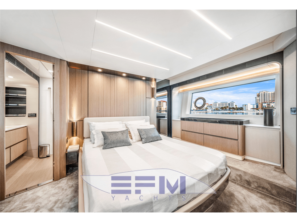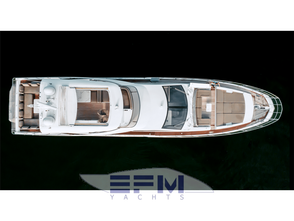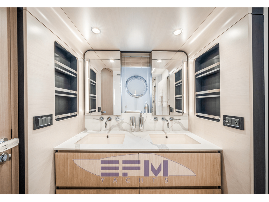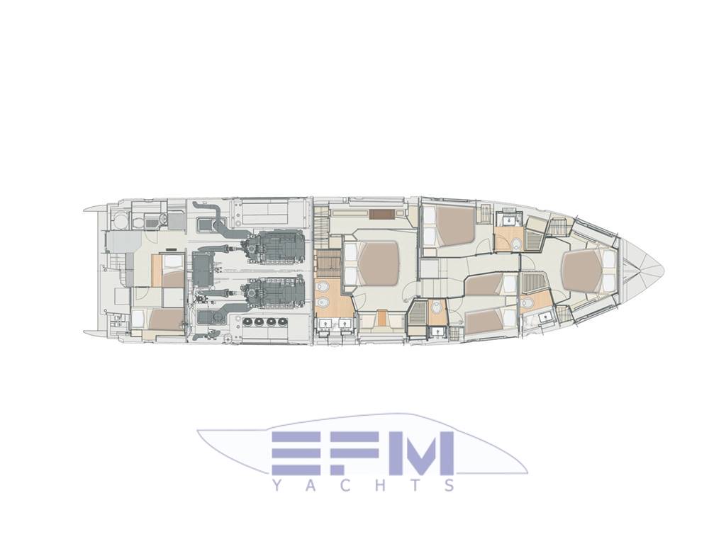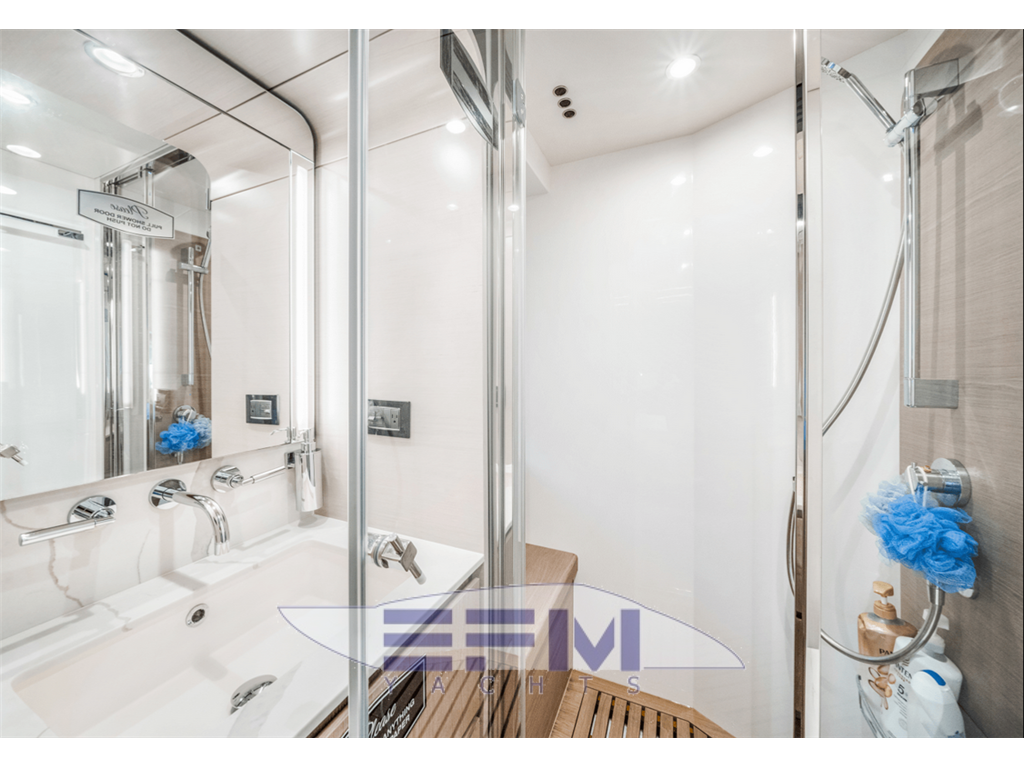 Notas internasAccessed from corridor Double bed + storage Mattress, pillows and bedspread Fabric headboard 1 fore armchair on starboard side 1 aft armchair on starboard side 2 headboard wall lights Furniture in pickled oak + HiGloss prestressed ebony. Alternatively, dark heattreated oak + HiGloss sycamore Wardrobe (port side) astern Chest of drawers Vanity top (starboard side) Provision for TV system Drawers below the TV LED spotlights 2 openable portholes (1 on each side) 2 windows (1 on each side) Direct access to head Carpeted floor Venetian blinds Owner's head Access from owner's cabin TECMA toilet 2 washbasins with top in light-colored agglomarble 2 taps Flush-mounting mixer tap for shower Stainless steel shower enclosure with glass panels and oak grating Stainless steel soap-dish in shower 2 cupboards + 2 wall units Wooden flooring LED spotlights 1 openable porthole with curtain 1 air extractor Chrome head accessories VIP cabin Double bed with storage Mattress, pillows and bedspread Wooden headboard Furniture in pickled oak + HiGloss prestressed ebony. Alternatively, dark heattreated oak + HiGloss sycamore 2 wardrobes 2 wall units 2 headboard wall lights LED spotlights Windows with 2 openable portholes (1 on each side) Hatch for emergency exit onto bow sundeck Direct access to head Provision for TV system Carpeted floor Venetian blinds Fabric-upholstered bulwarks VIP head Access from VIP cabin TECMA toilet 1 washbasin with top in light-colored agglomarble 1 tap Stainless steel shower enclosure with glass panels Stainless steel soap-dish in shower Wall cabinet Wooden flooring LED spotlights 1 round openable porthole with curtain 1 air extractor Chrome head accessories Guest cabin (starboard side) 2 single beds with storage Mattress, pillows and bedspread Furniture in pickled oak + HiGloss prestressed ebony. Alternatively, dark heattreated oak + HiGloss sycamore 1 wardrobe 1 nightstand Fabric bulwark upholstery Window with 1 openable porthole Provision for TV system Carpeted floor 2 wall lights Direct access to head LED spotlights Venetian blinds Guest head (starboard side) Access from guest cabin TECMA toilet 1 washbasin with top in light-colored agglomarble 1 tap Stainless steel shower enclosure with glass panels Stainless steel soap-dish in shower 1 wall cabinet Wooden flooring LED spotlights 1 openable porthole with curtain 1 air extractor Chrome head accessories Guest cabin (port side) 1 double bed + storage Mattress, pillows and bedspread Wooden headboard Furniture in pickled oak + HiGloss prestressed ebony. Alternatively, dark heattreated oak + HiGloss sycamore 1 wardrobe 1 nightstand Fabric bulwark upholstery 2 wall lights LED spotlights Window with 1 openable porthole Venetian blinds Direct access to head Provision for TV system Carpeted floor Guest head (port side) Access from guest cabin and from corridor TECMA toilet 1 washbasin with top in light-colored agglomarble 1 tap Stainless steel shower enclosure with glass panels Stainless steel soap-dish in shower 1 wall cabinet Wooden flooring LED spotlights 1 round openable porthole with curtain 1 air extractor Chrome head accessories Crew room Consisting of 2 rooms: a cabin with porthole for the captain and a shared crew room, both with: 1 bed Mattress, pillows and bedspread Access to the crew area via the transom Laminate flooring Laminated furniture Storage cabinets 1 washer-dryer in the shared room 1 escape hatch in the shared room Crew head TECMA toilet Cabinet with sink Washbasin mixer tap Shower with curtain and grating Chrome soap-dish and glass holder 1 openable porthole with curtain Notas de la instrumentación• TELESCOPIC GANGWAY• BOW THRUSTER • STERN THRUSTER • JOYSTICK CONTROL • WASHER AND DRYER SEPARATE UNITS IN CREW CABIN • RAYMARINE AIS 700 • RAYMARINE PLATINUM PACKAGE • AFT COCKPIT DOCKING STATION • AUDIO/VIDEO PACKAGE • TV ON FLY W/HI-LO SYSTEM • RAYMARINE VIDEOCAMERAS • CONTROL FOR ELECTRIC SEARCHLIGHT • CHAINCOUNTER ON HELM STATION • MIELE APPLIANCES • SEAKEEPER STABILIZER NG16 • Yacht Controller • Water maker • FLIR Camera • Additional cameras cockpit and sides of the vessel • Augmented Reality for Cameras • Hookup for Drone • 2 Sim Cellular • Internet router onboard Notas de armamento• SAFE IN MASTER CABIN• SPOTLIGHTS ON AFT FLY • EXTRA CONDUITS • DISHWASHER • TEAK ON FLYBRIDGE • FLYBRIDGE HATCH • ELECTRICALLY ACTUATED BOW BIMINI • TOILET WITH BIDET FAUCET FEATURE IN PRIMARY • BLACKOUT SYSTEM FOR PRIMARY CABIN CURTAINS • EXTRA SOCKET FOR INTERIOR • WATERPROOF EXTRA SOCKET • FLAGPOLE • WINECOOLER IN SALON • CO-PILOT SEAT ON FLY • TABLE ON BOW WITH CORIAN FRAME & SYNTHETIC MARBLE • COCKPIT TABLE WITH CORIAN FRAME & SYNTHETIC MARBLE • FLYBRIDGE DINING TABLE WITH CORIAN FRAME SYNTHETIC MARBLE • FLYBRIDGE HI-LO ELECTRIC BOW TABLE WITH CORIAN FRAME & SYNTHETIC MARBLE INSERT • CO-PILOT SEAT IN MAIN HELM • ICEMAKER ON FLY • EQUIPPED COCKPIT FURNITURE WITH REFRIGERATOR • ADDTIONAL STORAGE SHELVES IN ENGINE ROOM, PORTSIDE AFT OF ENGINE & AFT ABOVE GENERATOR • SCENIC LIGHT PKG FOR INTERIOR • DIMMERS ON FLY • SAFE IN CREW CABIN • ACR ARTEX RCL 100D REMOTE CONTROLLED SEARCH LIGHT • BARBECUE ON FLY • VIP HEAD SHOWER WALL IN MARBLE • PRIMARY HEAD SHOWER WALL IN MARBLE • COFFEE TABLE IN SALON • EXTRA SIZE MASTER BED • WOODEN FLOOR IN SALON, DINETTE & STAIRS IN WHITE MOON FINISH • WOODEN FLOOR IN LOWER DECK CORRIDOR IN WHITE MOON FINISHING • FABRIC CURTAINS IN VIP & GUESTS CABINS • FABRIC CURTAINS IN MASTER CABIN • HARD TOP • COCKPIT CHAIR (MOD. OSKAR) • LOUNGE FURNITURE ON AFT FLY, C SHAPE SOFAS IN BATYLINE W/COFFEE TABLE • SET OF LINEN FOR CABINS (CREW CABIN INCLUDED) • UPGRADE EXTERNAL CUSHIONS IN BATYLINE FABRIC • PAINTED BOOT STRIPE |