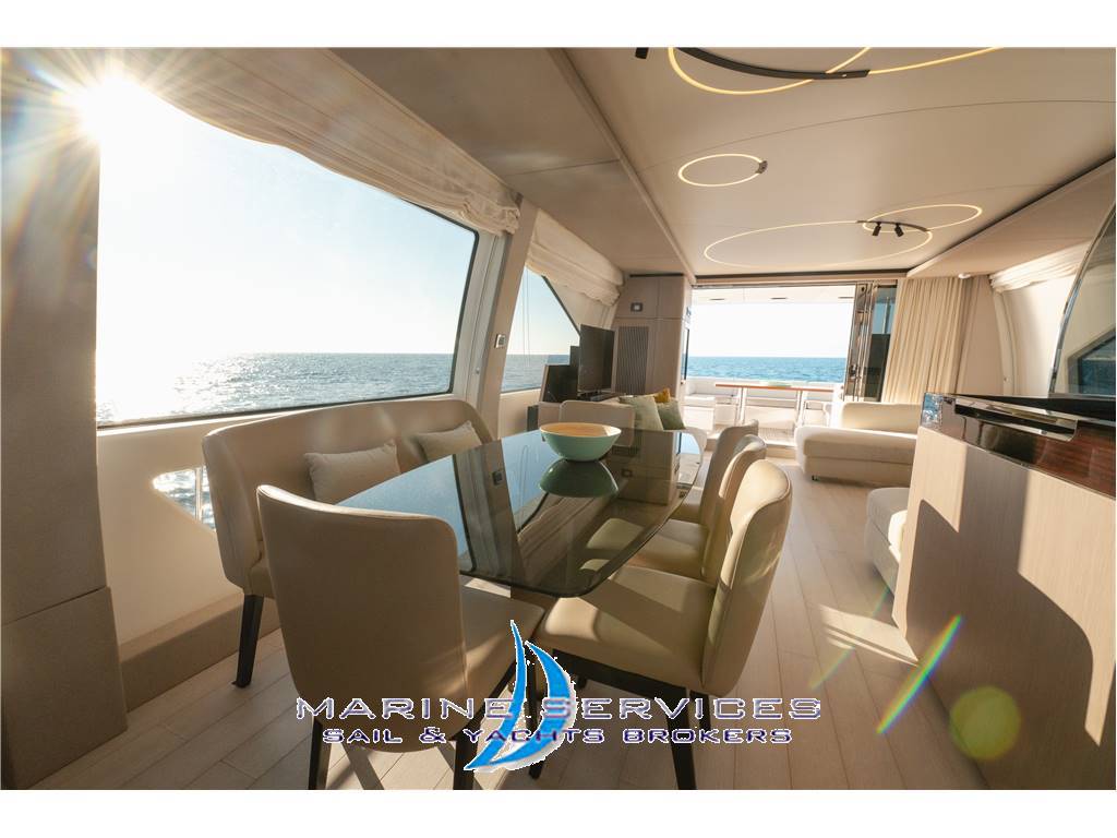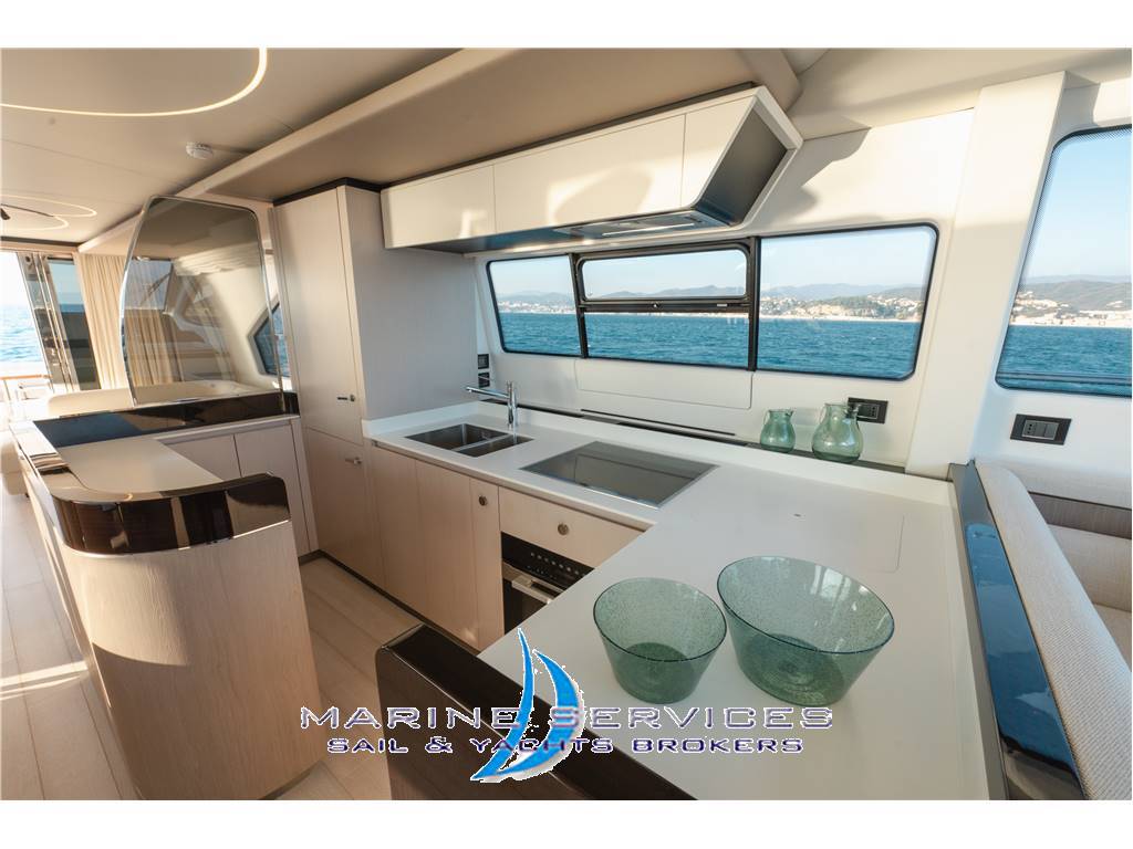 Notas internasFinitura Interni Rovere Naturale - Sicomoro frise' lucido - Pelli e tessuti divani avorio , legni laccati chiari , Main Deck su unico livello , senza gradini , con tre aree di funzione distinte : relax, food e drive. Salone di oltre 13 mq con due divani in tessuto contrapposti , colonna storage all'ingresso . Cucina open space nella parte centrale . con penisola per divisione della zona pranzo , che gode di una finestratura a tutta altezza cielo- terra . Zona Timoneria a estrema prua con due sedili sportivi regolabili , strumentazione di bordo ; a fianco della timoneria si troa una dinette aggiuntiva. Ponte inferiore : 4 cabine : una master a centrobarca , una Vip a prua e due ospiti laterali , di cui una matrimoniale . Armatoriale con caratteristiche finestrature verticali full glass senza montanti , ampi spazi per stivaggio e dinette privata ; bagno a poppavia a separare la zona notte dalla sala macchine ; Rivestimento pareti in tessuto , portali in essenza ebano lucido, il magic mirror contrapposto al grande letto centrale nasconde un tv flat . Version 4 Cabins with bathroom - Total 8 beds + Crew Interior Finish Natural Oak - Polished Frize Sycamore - Ivory sofa leathers and fabrics, light lacquered woods, Main Deck on one level, without steps, with three distinct function areas: relaxation, food and drive. Living room of over 13 m2 with two opposing fabric sofas, storage column at the entrance. Open space kitchen in the central part. with peninsula to divide the dining area, which has full-height sky-earth windows. Wheelhouse area at the extreme bow with two adjustable sports seats, on-board instrumentation; next to the wheelhouse there is an additional dinette. Lower deck: 4 cabins: a master cabin on midships, a VIP cabin in the bow and two side guest cabins, one of which is double. Owner's cabin with characteristic full glass vertical windows without pillars, large storage spaces and private dinette; bathroom aft to separate the sleeping area from the engine room; Wall covering in fabric, portals in glossy ebony essence, the magic mirror opposite the large central bed hides a flat TV. Notas de la instrumentaciónElettronica completa Raymarine doppia postazione .2 schermi 14" Radar VHF cin AIS e DSC Display Intruder Autopilota Bussola Magnetica Notas de armamentoPasserella IdraulicaElica di prua Plancetta idraulica Ponte in teak completo incluso fly Stabilizzatore Seakeeper Doppio Generatore Kohler Aria condizionata Pacchetti inclusi: Pacchetto Advance (Generatore Kohler aggiuntivo da 20,5 Kw, bitte aggiuntive a centro nave, controllo contametri sulla postazione di comando, Decor arredamento Upgrade , Joystick di manovra per motori ed eliche, faro elettrico, elettrodomestici Miele, Presa acqua banchina. Optionals: Stabilizzatore Seakeeper 18, mobile pozzetto con frigorifero, sedile copilota sul flybridge, luci dimmer sul fly, tendalino elettrico sul fly, asta portabandiera, portello del Flybridge, Hard Top, mobile lounge sul fly di poppa, divani sagomati più divanetto in tessuto Batyline con tavolino, luci Spreader sul flybridge di poppa, gradini di poppa in teak, tendalino parasole a prua con pali rimovibili in fibra di carbonio, salottino, tavolo a prua in teak , teak sul flybridge, passerella telescopica, luci subacquee n.5, upgrade cuscineria esterna standard in tessuto Batyline. |