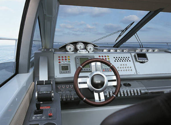 Notas de la instrumentaciónpuesto de gobierno: en el lado izquierdo de la vida, se ve muy deportivo, asientos ajustables con mocha de cuero, el volante en madera y acero, instrumentos analógicos con anillos de cromo. instrumentación incluye más de un tacómetro, velocÃmetro y el registro, todas las presiones y las temperaturas de los motores e inversores, los niveles de combustible y agua, alarmas de varios circuitos, el indicador de ángulo del timón, y por supuesto, las herramientas de navegación (brújula, mapa GPS plotter, VHF, radar, Tridata, piloto automático, cuerno, flaps, alerones rectificador). palancas de radio de cruceros comandante electrónico del motor / cd mp3 con Dolby Surround (en salón) TV vÃa satélite reglamentos sistema de luces de navegación