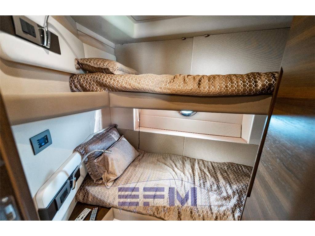 Notas internasBerths 6 + 1 Head compartments 2 + 1 Material GRP Interior Designer Carlo Galeazzi Exterior styling & concept Stefano Righini Builder Azimut Yachts (Italy) Layout con 3 cabine 2 matrimoniali e una con letti a castello + letto matrimoniale estraibile in salone e una cuccetta in cabina skipper (totale 9 posti letto), 2+1 bagni e tutte le attrezzature necessarie: 2 x aria condizionata e riscaldamento (in cabine e in salone) generatore, elica di prua, passerella idraulica, verricello elettrico , wc elettrico, radio, TV LED in salone e in tutte le cabine, GPS plotter, pilota automatico (entrambi anche sul fly-bridge), doccia di poppa, tender + fb - A centro barca la suite armatoriale sfrutta tutta la larghezza dello scafo di 4,60 metri. La cabina vip è posizionata ad estrema prua ed ha un ampio letto matrimoniale a penisola e ribalta. A dritta la terza cabina dedicata agli ospiti ha letti sovrapposti. A poppa la cabina per l’equipaggio con accesso diretto dal pozzetto Notas de la instrumentación• Raymarine AIS 650• Washer dryer combo unit • Painted hull color Miami Silver Met (MA048.17) • Raymarine Gold Package FLYBRIDGE: 2 x chart plotter Ray marine a125, RMK-9 remote control, i70,p70R autopilot, Raymarine Open array HD 4kW 48” Color, VHF 2nd station. • MAIN HELM: 2 x chart plotter Raymarine a125, RMK-9 remote control, i70, p70R autopilot, VHF Ray260, Ray marine VCM100 voltage converter module, SMART DST800 transducter in hull (depth / speed / temperature), HS- 5 network switch, EV-1 autopilot sensor core) • Yacht controller • Hi-lo system with TV 42" • Tender Williams 285 (2016 work hours 30) Notas de armamento• Generator 13 kW• Air Conditioning BTU 60.000 • Double Racor filters for main engines • Easy Docking maneuvering joystick for engines and trusters Xenta • Racor filters for generator • Spare conduits connecting engine room/wheelhouse/radar arch • Water maker Predisposition • Automatic Fire Fighting system • Electric mooring winches • Electric searchlight • Set of external covers for furniture on flybridge, cockpit and mesh covers on the windows • Shore water plug • Additional searchlight control at lower helm • Decor Exclusive • Miele appliances with microwave combo and cooktop • Chaincounter control at main helm • Flybridge furniture with sink, refrigerator and BBQ • Folding bimini top • Sunbathing cushions • Teak on swimming platform • Teak on cockpit • Telescopic electro-hydraulic gangway • Two floodlights installed on aft fly • Two underwater lights installed under swimming platform • Crew cabin with air conditioning • Dimmer lights in salon and lower deck • Led lighting for exterioir and interior with dimmers in salon and cockpit • Mosquito nets for portholles • Set of stainless steel coocking pans • Crockery and cutlery for 6 persons • Sofa bed in salon • Dish washer in galley |