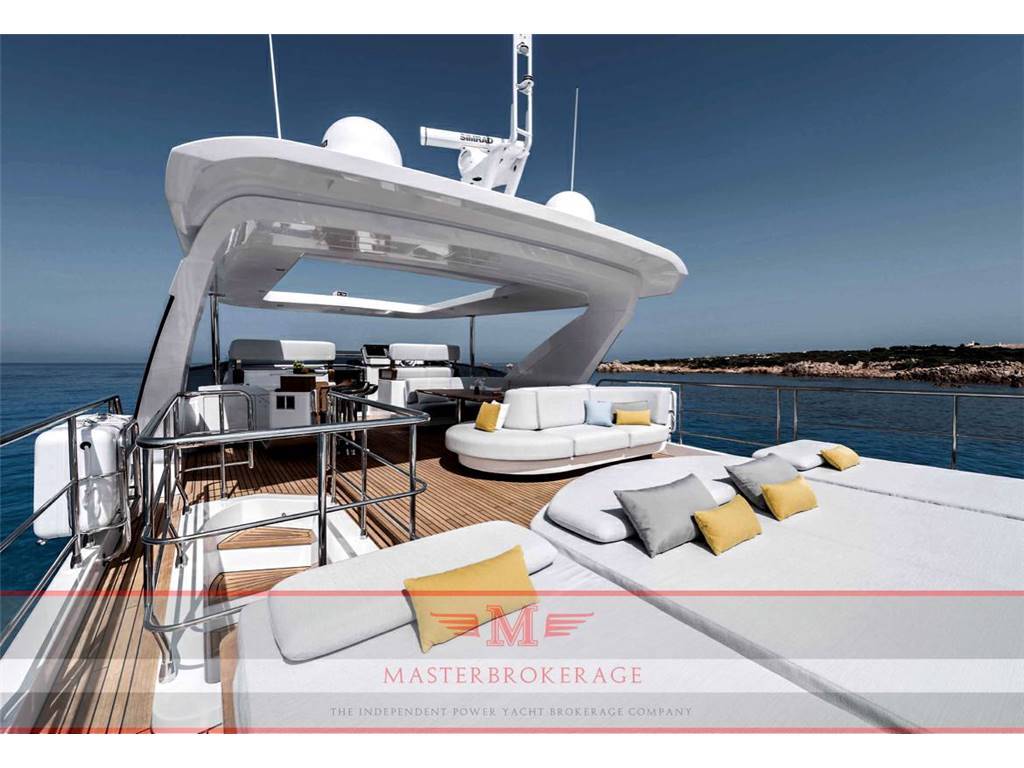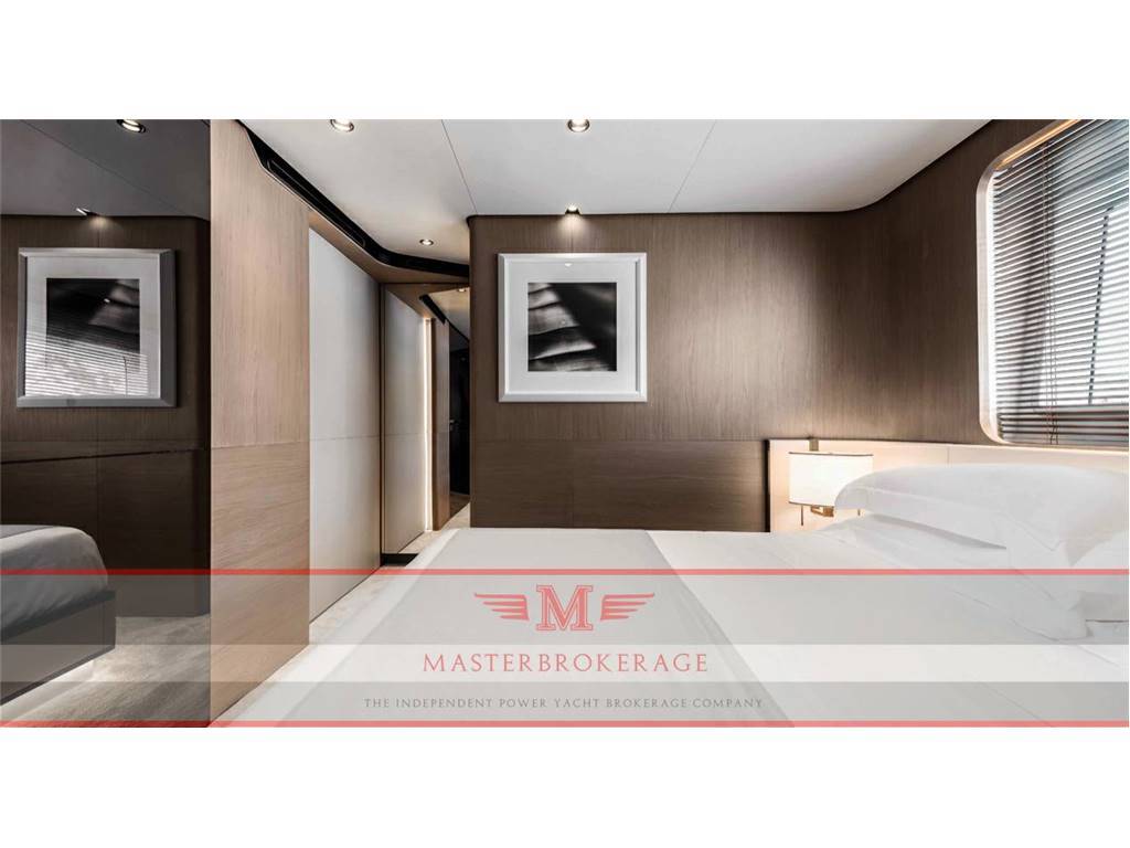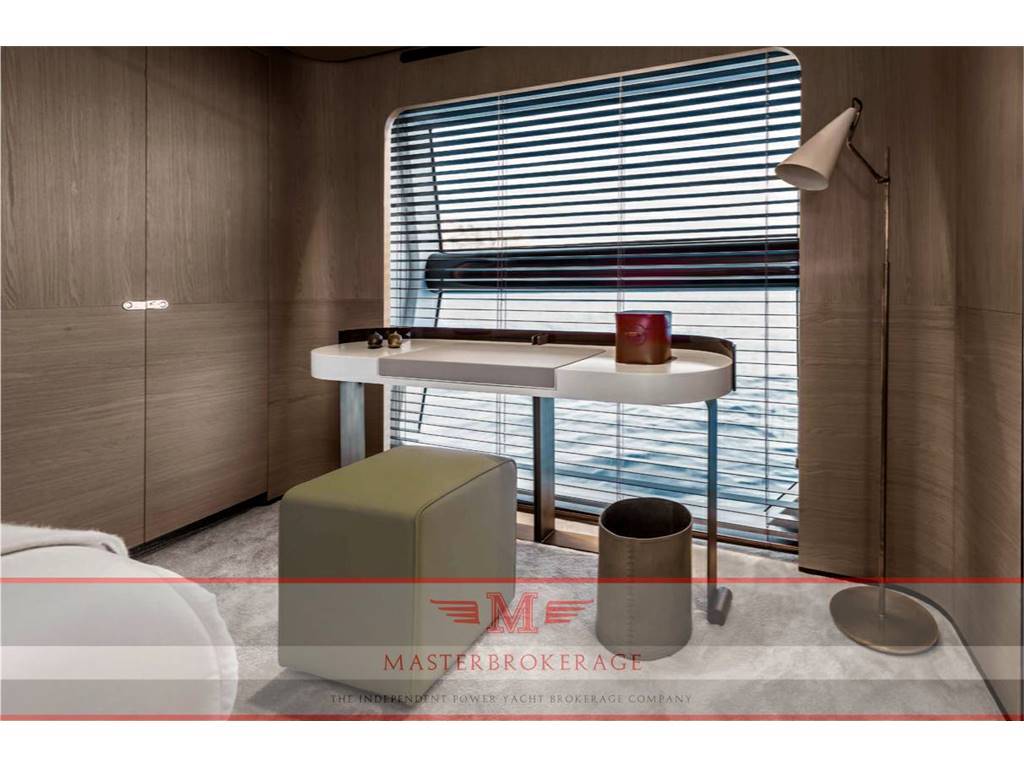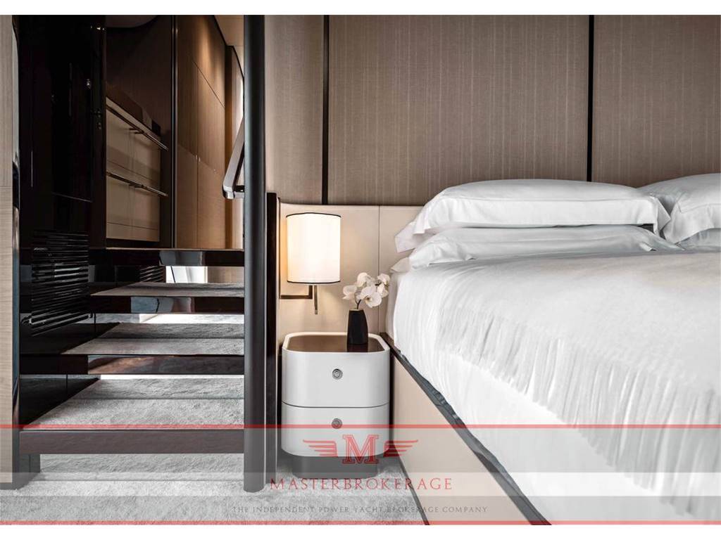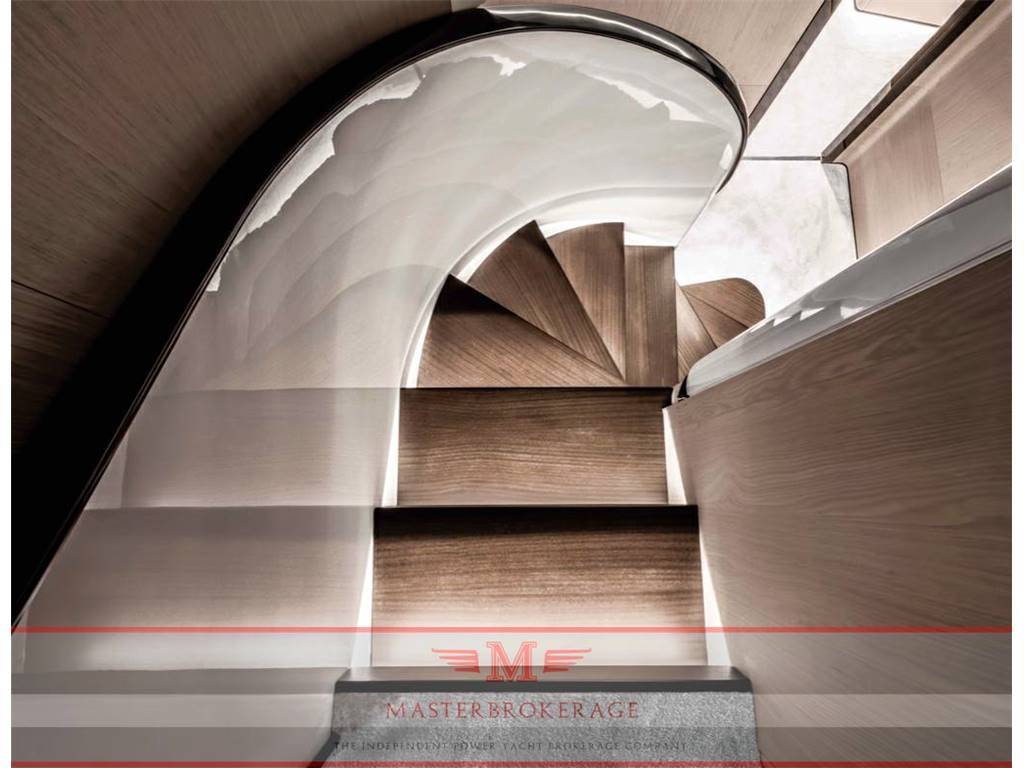 Notas internas3 CREW IN 2 CREW CABINS. The long fullheight windows extend from the hull to the superstructure, lightening while expanding the sense of space inside. The wide-open lounge area on the bow acts as an expansive sea terrace. The coziest common area on board is joined with the outdoors through the expansive aperture onto the cockpit. The full beam owner’s cabin has expansive windows that flood the spaces with light, while a full-beam bathroom and a dressing room complete the suite. Each of the staterooms is characterized by a matte, textured wood, juxtaposed against a darker, polished kind. The contrast is enriched by a series of inserts in exclusive materials like treated brass, bronze and polished stainless steel. The innovative Pivoting Platform Expander folds the transom down in beach mode, making more space right on the water. This unique solution can keep rotating and to make launching the tender a breeze. -------- . |