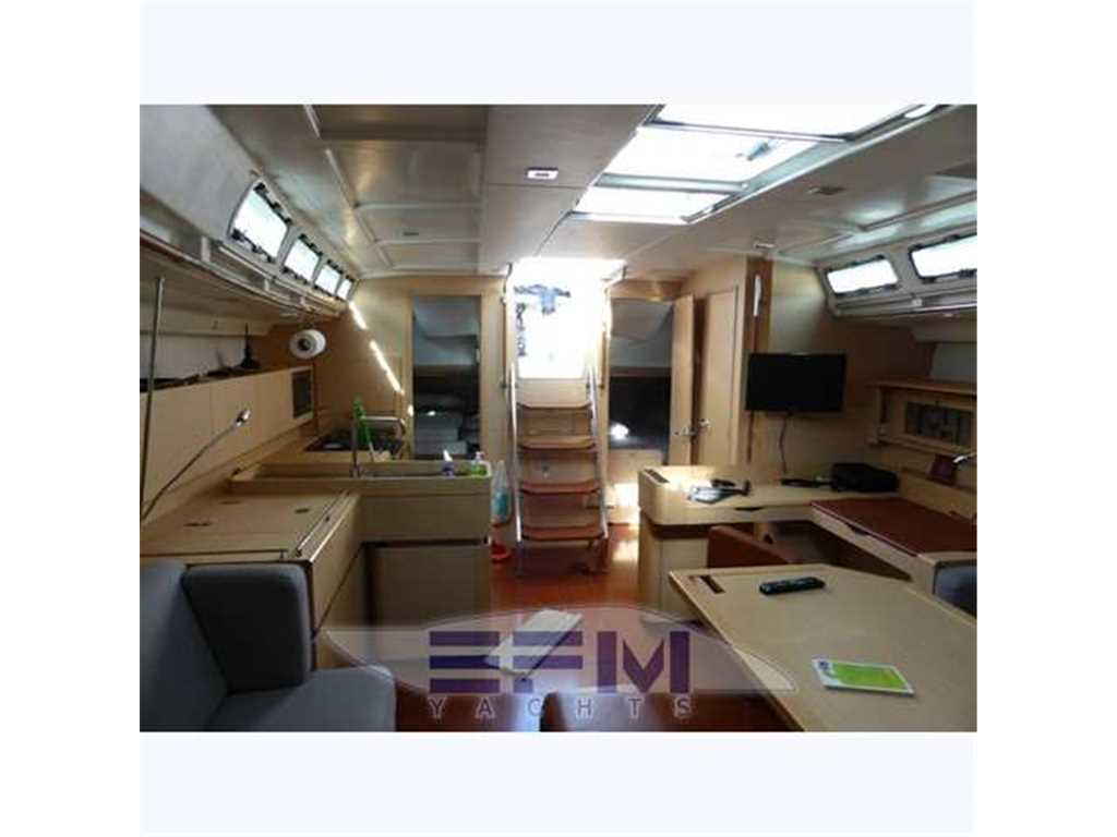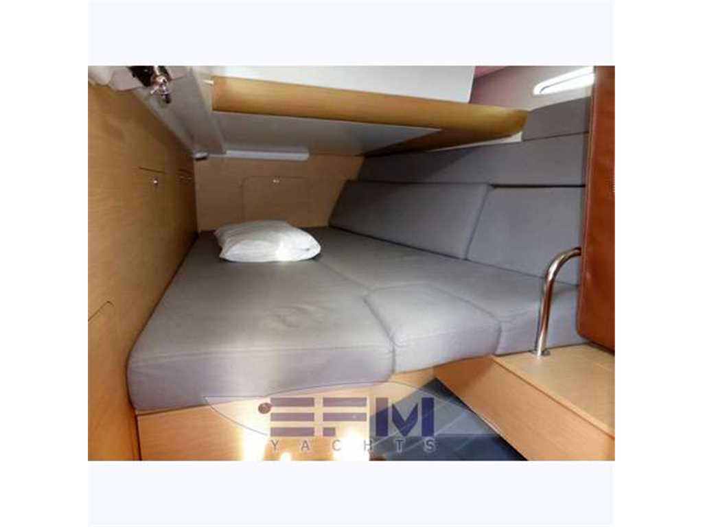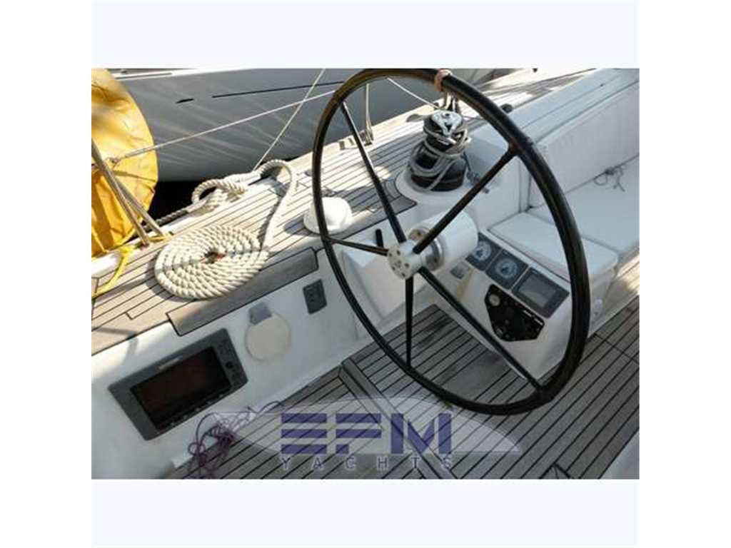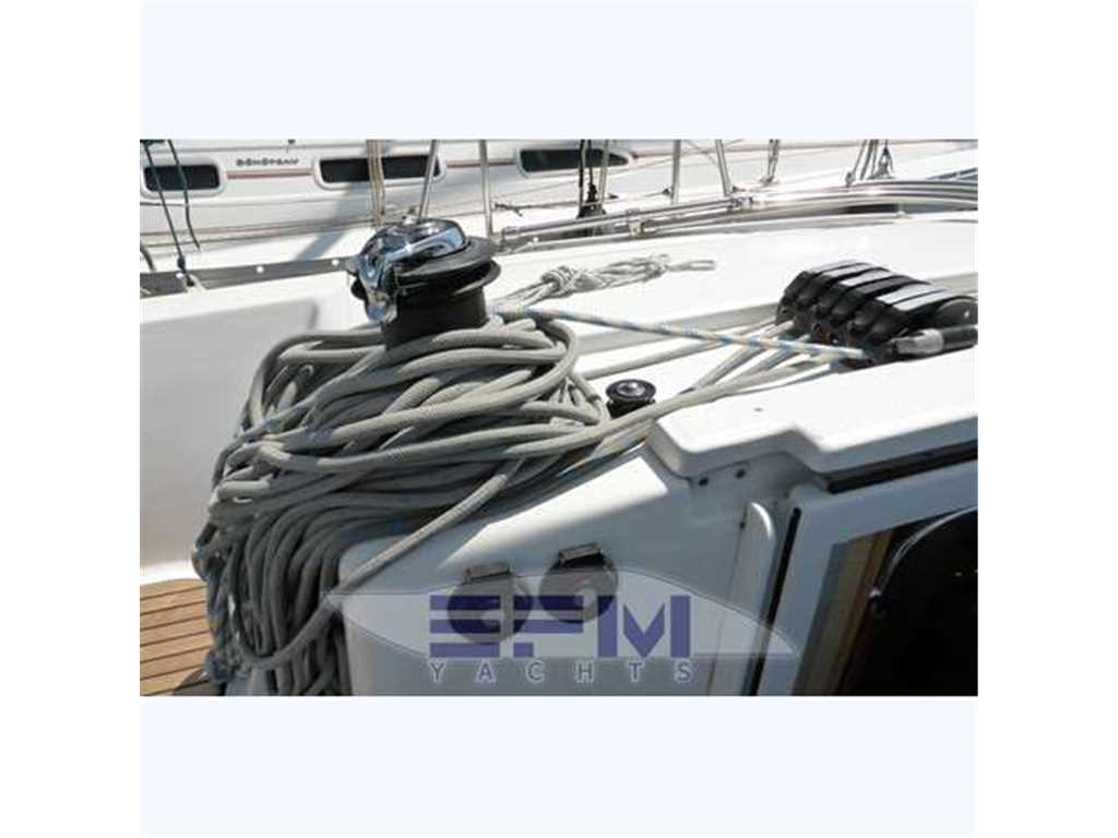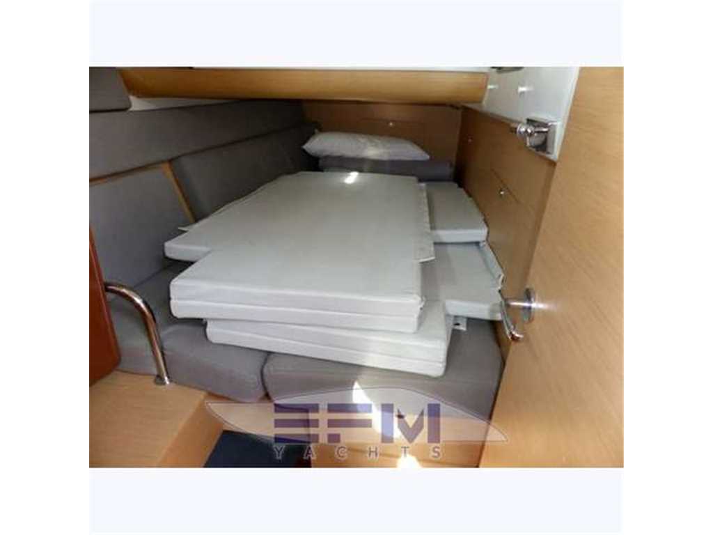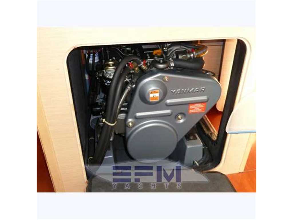 The hull is monolithic GRP and glass fibre construction. Its overall structure is reinforced by longitudinals and local reinforcements (e.g. near keel, rudder, chain plates, deck line). The hull is given optimal protection from osmosis by applying a first coat of protective resin. A structural monolithic inner moulding of bi-axial and unidirectional fabrics is bonded and laminated to the hull at various points. Its structural role is important as it takes and absorbs the stresses at stress points (e.g. chain plate tie rods, keel, rudder, etc.) and spreads any loads, guaranteeing reduced strain on the hull. It also ensures a good finish to the bilges and makes cleaning and maintenance easier. The floors support the mechanical elements (engine, etc.) and water tanks. Structural marine plywood bulkheads are fixed to the hull for improved rigidity. The hull is white or grey in colour with grey livery. YANMAR 4JH3 HTE ? 75 HP ? 55 kw diesel engine with Sail Drive transmission. Engine mounting built in to hull inner lining. Engine compartment insulated with soundproof foam and ventilation ensured by air intake and forced outflow port through transom. For maintenance, engine compartment access is through an opening aft of the companionway and two side access hatches in the aft cabins. Folding 3-blade propeller. Rotomoulded 237 litre diesel tank under aft starboard berth with electric gauge, sediment filter and stop-valve. Its stainless steel deck filler with key is located on the side of the aft cockpit to starboard. Seawater filter. Engine starter and control panel situated in the cockpit to starboard on the aft side of the cockpit bench. The engine control lever is positioned on the cockpit starboard side within reach of the helm position. One 12 V ? 110 Amp engine starting battery. The deck is of a sandwich (glass fibre / balsa / polyester resin construction for optimal strength / weight ratio. Reinforced monolithic areas are laid under the deck gear (winches, rails, chain plates, cleats). All working and circulation areas on deck are non-slip. An inner moulding is bonded to the deck interior to improve its finish. An integral monolithic inner moulding containing the structural deck beams is bonded to the deck for a perfect finish (integral lighting, finish, access to screw points for fixing the deck gear, etc.). |