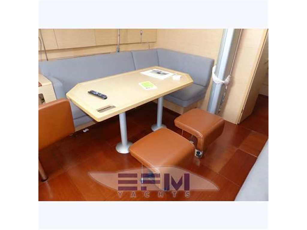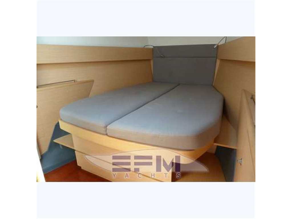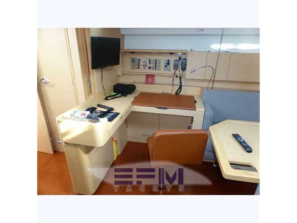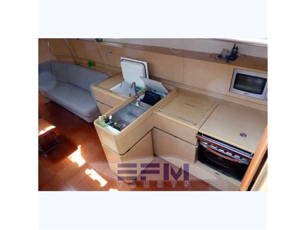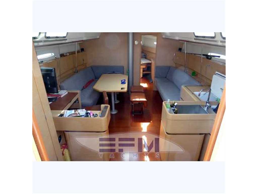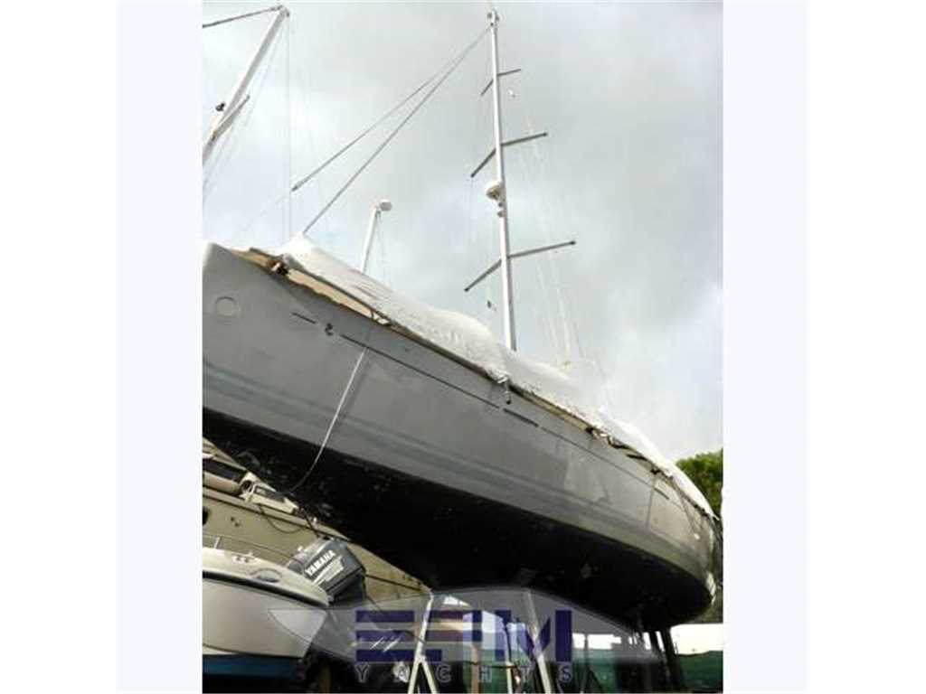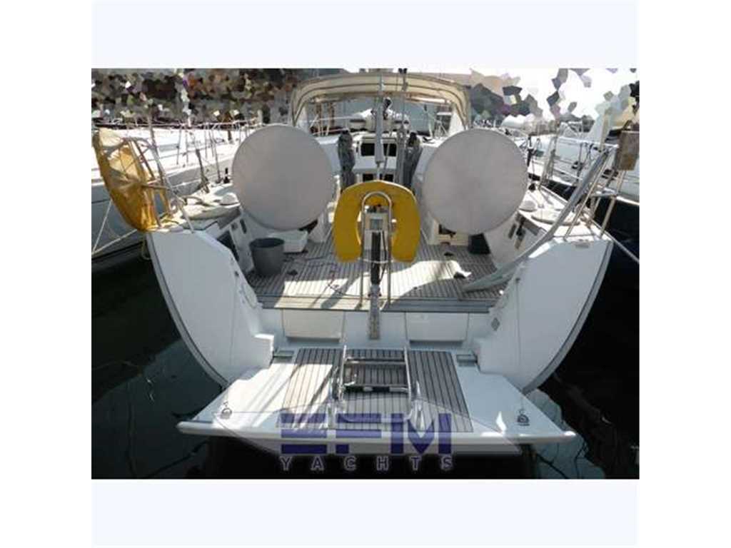 The hull is monolithic GRP and glass fibre construction. Its overall structure is reinforced by longitudinals and local reinforcements (e.g. near keel, rudder, chain plates, deck line). The hull is given optimal protection from osmosis by applying a first coat of protective resin. A structural monolithic inner moulding of bi-axial and unidirectional fabrics is bonded and laminated to the hull at various points. Its structural role is important as it takes and absorbs the stresses at stress points (e.g. chain plate tie rods, keel, rudder, etc.) and spreads any loads, guaranteeing reduced strain on the hull. It also ensures a good finish to the bilges and makes cleaning and maintenance easier. The floors support the mechanical elements (engine, etc.) and water tanks. Structural marine plywood bulkheads are fixed to the hull for improved rigidity. The hull is white or grey in colour with grey livery. YANMAR 4JH3 HTE ? 75 HP ? 55 kw diesel engine with Sail Drive transmission. Engine mounting built in to hull inner lining. Engine compartment insulated with soundproof foam and ventilation ensured by air intake and forced outflow port through transom. For maintenance, engine compartment access is through an opening aft of the companionway and two side access hatches in the aft cabins. Folding 3-blade propeller. Rotomoulded 237 litre diesel tank under aft starboard berth with electric gauge, sediment filter and stop-valve. Its stainless steel deck filler with key is located on the side of the aft cockpit to starboard. Seawater filter. Engine starter and control panel situated in the cockpit to starboard on the aft side of the cockpit bench. The engine control lever is positioned on the cockpit starboard side within reach of the helm position. One 12 V ? 110 Amp engine starting battery. The deck is of a sandwich (glass fibre / balsa / polyester resin construction for optimal strength / weight ratio. Reinforced monolithic areas are laid under the deck gear (winches, rails, chain plates, cleats). All working and circulation areas on deck are non-slip. An inner moulding is bonded to the deck interior to improve its finish. An integral monolithic inner moulding containing the structural deck beams is bonded to the deck for a perfect finish (integral lighting, finish, access to screw points for fixing the deck gear, etc.). |