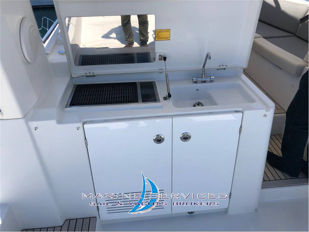 Notas internasRifiniture in legno Alpi Mahogany - Porta dei mobili a persiana per favorire l'aerazione naturale Tv HD Smart in tutte le Cabine - a scomparsa in Salone Divani in pelle Tappeto moquette in salone e zona timoneria interna Testata letto matrimoniale in cuoio Cassaforte Tende interne compresa zona timoneria CUCINA attrezzata con Piastra a gas 3 fuoco con blocca pentola, Forno microonde , 1 Frigo da 130 L incluso nel mobile a sinistra e 1 Frigo a cassetto Lavastoviglie Lavasciuga CABINA ARMATORE A TUTTA LARGHEZZA con Bagno CABINA VIP (A PRUA) con letto centrale a isola CABINA VIP (A SINISTRA) 2 Cuccette individuali sovrapposte 2 BAGNI con WC elettrico Vacu - flush Notas de la instrumentaciónSchermo multifunzione Raymarine® es127 sul Fly2 Multifunzione Raymarine® Gs12 nella timoneria VHF doppia postazione con AIS interfaccia Raymarine - Volvo EVC Pilota p70RS in timoneria e ripetitore al Flying bridge TV + DVD Fusion ® + Pack Bose, quadrato Telecamera di Poppa Telecamera Termica sala macchine Altoparlanti Stagni Bose su Fly Radar Raymarine Telecamere di sorveglianza a distanza su Fly e Pozzetto collegate a Cellulare PLANCIA INTERNA • Ripetitori motore con contagiri, spie di pressione, temperatura, indicatori carburante • Schermo Volvo EVC Strumentazione Volvo: • Trip computer • Cruise control • Single lever • Low speed • Indicatore angolo di barra • Indicatore di flap • Manette di comando motore elettriche • Joystick di comando IPS • Bussole • Comandi delle funzioni: Tergicristallo, Disappannatore, Avvisatore acustico, Luci di navigazione, Verricello salpancora • Stipetto per alloggiamento a sinistra con 3 prese 220 V ELETTRICITÀ_________________________________ • Quadro elettrico 24/220 V o 24/110 V • Interruttori di batteria elettrici • Interruttori wifi radio comandati (senza pile) • 2 Prese di banchina • Prese 220 V in quadrato, cucina, timoneria e cabine • 2 Caricatori batterie 40 Ah • Inverter 12 V / 24 V • Prese 12 V nella timoneria • 4 Batterie ausiliarie 140 Ah e 4 batterie di avvio 50 Ah ° Batteria supplementare 110 Ah • Verricello salpancora • Flap elettrici Lenco® • Luce di fonda • 3 Tergicristalli elettrici, con sistema sincronizzazione • 2 Pompe di sentina elettriche automatiche • 2 Ventilatori di sentina motore • Illuminazione interna pozzetto, corridoi e flybridge Notas de armamentoElica di prua Quick BTQ 250 140 24Pompa di lavaggio in coperta (Acqua dolce - 1 uscita verso prua) Proiettore di coperta con telecomando Batteria supplementare - 110A Convertitore 24-220V 2 kVA o 24-110V 2kvw Presa d'acqua dolce di banchina Frigorifero (42 L / 1,4 Cu.f) al fly Frigo a cassetti (al posto di uno dei 2 frigo da 130 L) Grill elettrico sul Flybridge Presa diretta acqua banchina Presa lavaggio acqua dolce a prua Proiettore luce ponte con telecomando Generatore Asta navigazione Inox Bimini su Flybridge Cuscinerie esterne complete Set coperture Fly completo Teli coprifinestrature Chiusura invernale per pozzetto poppa Serbatoio acque grigie Plancetta di Poppa idraulica con selle per tender Tender con Fuoribordo 20HP • Musone di prua basculante inox • Verricello salpancora elettrico Lewmar 24V 2000W • Telecomando nel gavone ancora + comandi del verricello dalle postazioni di guida e flybridge |