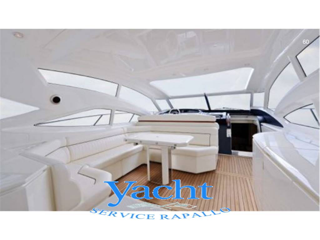 Notas internasLetto matrimoniale con ripostiglio sotto il piano, burlone rivestito, materasso, due guanciali e copriletto - Parure letto - Tavolini da notte (2) - Mobiletti pensili - Luci di lettura - Armadio con griglie di aerazione – Mobile polifunzionale con cassetti e pouf - TV colori 20” LCD con digitale terrestre integrato in chiaro - Illuminazione e prese di corrente - Cassaforte - Specchio - Oblò (2) con tendaggi. BAGNO ARMATORE Armadietti e ripiani - Lavabo in VTR con miscelatore - Aspiratore - Specchio - WC elettrico - Illuminazione e prese di corrente - Doccia separata con bidet panchetta e carabottino di teak - Oblò con tendina - Parure bagno. CABINA OSPITI PRUA Letto matrimoniale con cassettiera e burlone rivestito, materasso, due guanciali e copriletto - Parure letto – Ripiani portaoggetti e luci di lettura - Armadio con griglie di aerazione – Specchio - Illuminazione e prese di corrente e TV - Oblò (2) con tendina. BAGNO OSPITI PRUA Armadietti e ripiani - Lavabo in VTR con miscelatore - Aspiratore - Specchio - WC elettrico - Illuminazione e prese di corrente – Doccia separata con bidet panchetta e carabottino di teak - Oblò con tendina - Parure bagno. CABINA OSPITI POPPA Scala di accesso con tambucio - Due letti con cassettiere e burloni rivestiti, materassi, guanciali, copriletti - Parure letti - Armadio con griglie di aerazione - Mobiletti pensili - Luci di lettura - Specchio – Illuminazione, prese di corrente e TV - Oblò con tendina. BAGNO OSPITI POPPA Armadietti e ripiani - Lavabo in VTR con miscelatore - Aspiratore - Specchio - WC elettrico con funzione bidet - Illuminazione e prese di corrente - Box doccia con carabottino di teak - Oblò con tendina - Parure bagno. CABINA MARINAIO Letto con materasso, guanciale, copriletto – Parure letto – Oblò (2) con tendine - Illuminazione e prese di corrente - Angolo bagno con lavabo e WC elettrico con funzione bidet, doccia e parure bagno. ALLESTIMENTI SOTTOCOPERTA Maniglie e ferramenta per porte e mobili in acciaio inox o ottone cromato - Cieli rivestiti in tessuto - Pareti e mobili in legni ed essenze varie: verniciati, laccati o rivestiti in tessuto, pelle o scamosciato - Rivestimenti bagni e docce in laminato plastico - Tappezzerie, tendaggi e imbottiti in tessuti di alto pregio o pelle con colori coordinati - Pavimenti salone e cabine ricoperti con moquette. SALONE: ANGOLO CUCINA Mobile con piano di lavoro in corian, cassetti e ripiani - Lavello in corian con miscelatore - Piano di cottura a 4 fuochi in vetroceramica - Servizio stoviglie e parure da tavola per 6 persone – Serie di pentole - Aspiratore - Frigorifero con deep-freezer (acciaio inox ) - Pattumiera – Forno microonde combinato - Mobiletti pensili - Illuminazione e prese di corrente – Oblò (2) con tendina. SALONE: SOGGIORNO/PRANZO Divano – Tavolo pieghevole con pouf (2) – Mobile Bar - Mobiletti pensili – Illuminazione e prese di corrente - TV colori 26” LCD con digitale terrestre integrato in chiaro – Stazione meteo (Orologio - Barometro – Igrometro) - Oblò (2) con tendaggi. Notas de la instrumentaciónPLANCIA DI COMANDOSedile pilota e copilota (3 posti) – seduta pilota ribaltabile - Pedana in teak per pilota - Stazione di governo con timoneria idraulica –Strumentazione controllo motori e allarmi - Bussola magnetica - Angolo di barra - Pilota automatico - Radiotelefono VHF - Chart/Plotter Garmin Touch Screen - Comando stabilizzatori di assetto con indicatore - Quadro sinottico -Interruttori vari. SISTEMA DI PROPULSIONE Due motori diesel MAN da 735 kW (1000 hp cad.) montati su supporti antivibranti - Invertitori/riduttori – Assi elica in acciaio inox con idrotenute in carbografite – Eliche in Nibral - Scarichi motori immersi a mezza nave con tubi in acciaio inox. IMPIANTO DI GOVERNO Timoneria idraulica servo assistita - Timoni in acciaio inox - Stabilizzatori di assetto elettroidraulici in acciaio inox e bronzo - Elica di manovra elettrica in tunnel prodiero ( 8 hp) Notas de armamentoCOSTRUZIONEStruttura in vetroresina multiassiale impregnata con resina vinilestere e stratificata a mano - Coperta e murate in sandwich di Airex - Longheroni e madieri di rinforzo stratificati e resinati - Strato esterno in gel coat isoftalico neopentilico - Carena trattata con antivegetativa. COPERTA E POZZETTO Hard-top con tettuccio ad azionamento elettrico - Antenne,e illuminazione pozzetto - Parabrezza con cristalli temperati - Tergicristalli con lavavetri - Passo d’uomo in cabina armatore in acciaio inox – Battagliola alta in acciaio inox - Boccaporto al gavone di prua - Paratia stagna anticollisione - Bottaccio in acciaio inox - Porta scorrevole di accesso al salone - Portello di accesso alla cabina di poppa - Doccetta a prua e poppa - Cappa pozzetto poppa - Cappetta copricruscotto - Tenda parasole con candelieri - Zone prendisole a prua e poppa con materassini – Dinette con divano a “C” e tavolo ribaltabile - Mobile di servizio con frigorifero, lavello, pattumiera e gavone - Console comandi di emergenza - Luci di navigazione - Luci perimetro pozzetto - Tromba – Scaletta bagno elettroidraulica a poppa - Passerella elettroidraulica - Piattaforma di poppa con piano scorrevole per tender – Luci segna gradini specchio poppa – Teak nel pozzetto - Teak piattaforma di poppa e gradini – Lampada stagna a poppa.Salpa ancora IMPIANTO CARBURANTE Due serbatoi in acciaio inox (l. 2.500 complessivi) - Bocchette d'imbarco sui trincarini - Controllo livello in plancia e dal serbatoio babordo mediante livello visivo - Filtri separatori acqua/gasolio - Linee carburante con valvole di chiusura anche a distanza. IMPIANTO IDRICO/IDRAULICO Serbatoio strutturale acqua dolce (l. 650) con indicatore di livello - Bocchetta imbarco acqua sul trincarino a tribordo - Boiler elettrico - Sistema idraulico centralizzato con autoclave per servizi cucina, bagni e docce – Serbatoi (2) raccolta acque bianche con allarme troppo pieno, pompa di scar