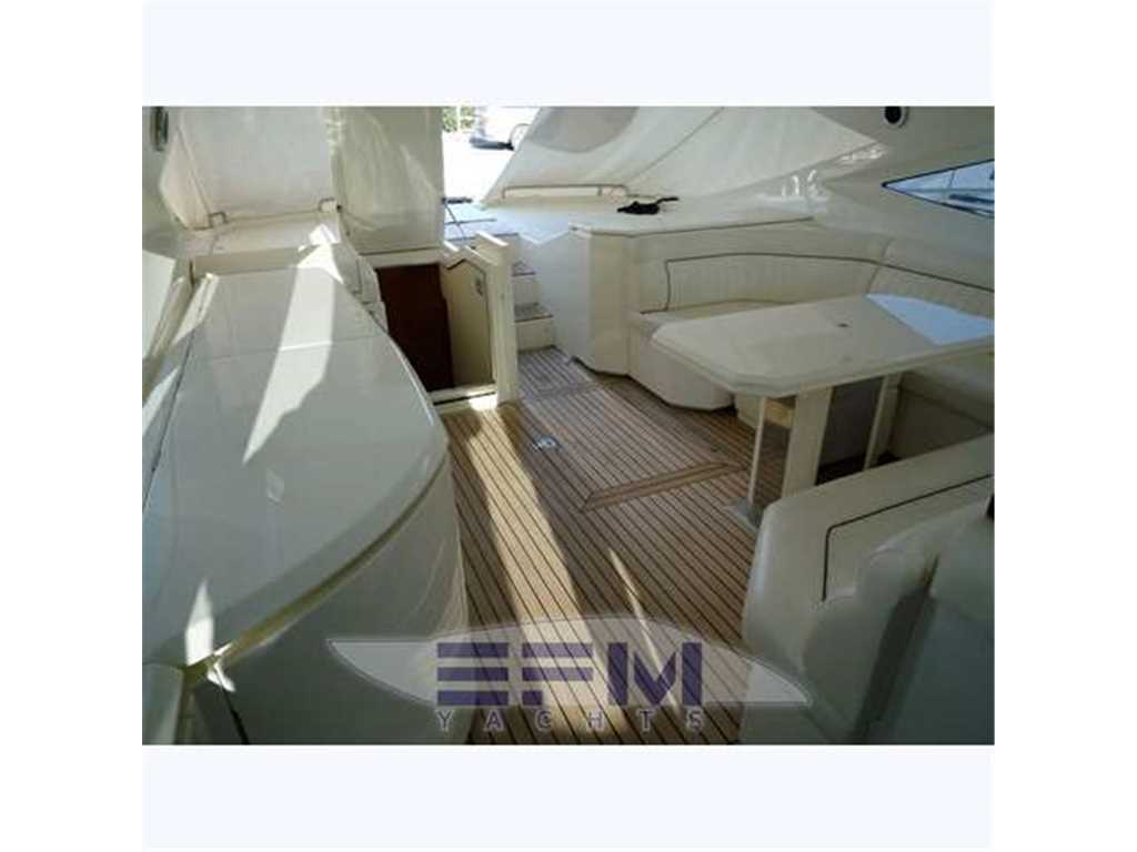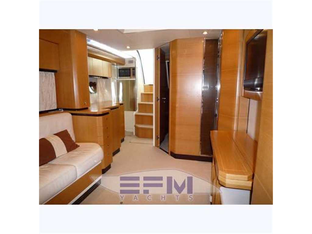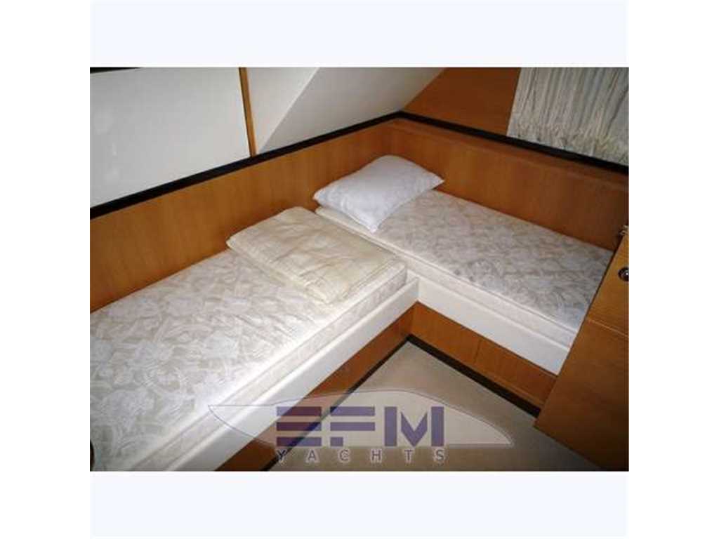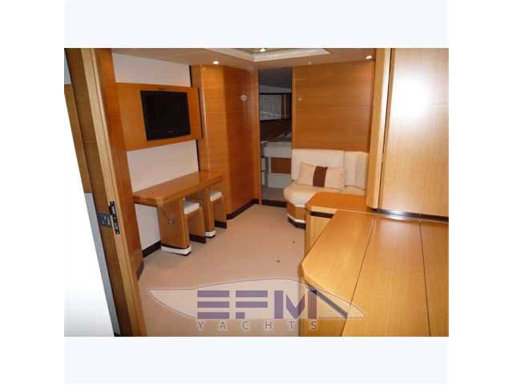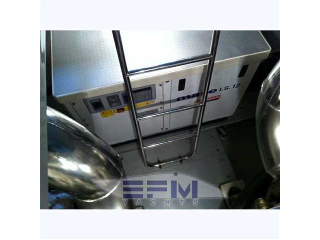 Notas internasStruttura in vetroresina multiassiale impregnata con resina vinilestere e stratificata a mano - Coperta e murate in sandwich di Airex - Longheroni e madieri di rinforzo stratificati e resinati - Strato esterno in gel coat isoftalico neopentilico - Carena trattata con antivegetativa. COPERTA E POZZETTO Hard-top con tettuccio ad azionamento elettrico - Antenne,e illuminazione pozzetto - Parabrezza con cristalli temperati - Tergicristalli con lavavetri - Passo d’uomo in cabina armatore in acciaio inox – Battagliola alta in acciaio inox - Boccaporto al gavone di prua - Paratia stagna anticollisione - Bottaccio in acciaio inox - Porta scorrevole di accesso al salone - Portello di accesso alla cabina di poppa - Doccetta a prua e poppa - Cappa pozzetto poppa - Cappetta copricruscotto - Tenda parasole con candelieri - Zone prendisole a prua e poppa con materassini – Dinette con divano a “C” e tavolo ribaltabile - Mobile di servizio con frigorifero, lavello, pattumiera e gavone - Console comandi di emergenza - Luci di navigazione - Luci perimetro pozzetto - Tromba – Scaletta bagno elettroidraulica a poppa - Passerella elettroidraulica - Piattaforma di poppa con piano scorrevole per tender – Luci segna gradini specchio poppa – Teak nel pozzetto - Teak piattaforma di poppa e gradini – Lampada stagna a poppa. SALONE: SOGGIORNO/PRANZO Divano – Tavolo pieghevole con pouf (2) – Mobile Bar - Mobiletti pensili – Illuminazione e prese di corrente - TV colori 26” LCD con digitale terrestre integrato in chiaro – Stazione meteo (Orologio - Barometro – Igrometro) - Radiostereo CD/MP3/DVD con attacco iPod con 4 altoparlanti di cui 2 nel pozzetto - Oblò (2) con tendaggi. CABINA ARMATORE CENTRALE Letto matrimoniale con ripostiglio sotto il piano, burlone rivestito, materasso, due guanciali e copriletto - Parure letto - Tavolini da notte (2) - Mobiletti pensili - Luci di lettura - Armadio con griglie di aerazione – Mobile polifunzionale con cassetti e pouf - TV colori 20” LCD con digitale terrestre integrato in chiaro - Radiostereo CD/MP3/DVD con attacco iPod – Illuminazione e prese di corrente - Cassaforte - Specchio - Oblò (2) con tendaggi. BAGNO ARMATORE Armadietti e ripiani - Lavabo in VTR con miscelatore - Aspiratore - Specchio - WC elettrico - Illuminazione e prese di corrente - Doccia separata con bidet panchetta e carabottino di teak - Oblò con tendina - Parure bagno. CABINA OSPITI PRUA Letto matrimoniale con cassettiera e burlone rivestito, materasso, due guanciali e copriletto - Parure letto – Ripiani portaoggetti e luci di lettura - Armadio con griglie di aerazione – Specchio - Radiostereo CD/MP3/DVD con attacco iPod - Illuminazione e prese di corrente e TV - Oblò (2) con tendina. BAGNO OSPITI PRUA Armadietti e ripiani - Lavabo in VTR con miscelatore - Aspiratore - Specchio - WC elettrico - Illuminazione e prese di corrente – Doccia separata con bidet panchetta e carabottino di teak - Oblò con tendina - Parure bagno. CABINA OSPITI POPPA Scala di accesso con tambucio - Due letti con cassettiere e burloni rivestiti, materassi, guanciali, copriletti - Parure letti - Armadio con griglie di aerazione - Mobiletti pensili - Luci di lettura - Specchio - Radiostereo CD/MP3/DVD con attacco iPod – Illuminazione, prese di corrente e TV - Oblò con tendina. BAGNO OSPITI POPPA Armadietti e ripiani - Lavabo in VTR con miscelatore - Aspiratore - Specchio - WC elettrico con funzione bidet - Illuminazione e prese di corrente - Box doccia con carabottino di teak - Oblò con tendina - Parure bagno. CABINA MARINAIO Letto con materasso, guanciale, copriletto – Parure letto – Oblò (2) con tendine – Radiostereo CD/MP3/DVD con attacco iPod - Illuminazione e prese di corrente - Angolo bagno con lavabo e WC elettrico con funzione bidet, doccia e parure bagno. CONSTRUCTION Structure in hand laid up multiaxial fibreglass impregnated with vinyl ester resin - Deck and sides structures in Airex sandwich - Girder system to reinforce bottom - Isophtalic Neopentilic gelcoat - Hull's antifouling treatment. DECK AND COCKPIT Hard-top with electric sliding roof –Aerials and cockpit lighting – Stainless steel windshield structure with tempered glass - Windshield wipers with washers - Stainless steel hatchway in owner’s cabin - Stainless steel railing (high) - Hatch to the fore peak - Watertight bulkhead - Stainless steel fenders - Sliding door to the salon - Door to the stern cabin - Shower at bow and stern - Cockpit cover from roll-bar to stern - Dashboard cover - Sun canopy with stanchions - Sun lounges at bow and stern with mattresses - C-shaped upholstered dinette with folding table – Service furniture with fridge, sink, dustbin and stowage - Emergency control console - Navigation lights - Cockpit floor lighting - Horn – Electro hydraulic bathing ladder - Electro hydraulic gangway/davit - Sliding stern platform for tender - Transom steps with light – Teak in the cockpit - Teak on swimming platform and steps – Watertight stern lamp. SALON: GALLEY CORNER Cabinetry with corian counter top, cover, drawers and shelves – Corian sink with mixer - Electric stove with ceramic hot plates (4) – Table set and linens for 6 people – Pan set - Extractor fan – Refrigerator with deep-freezer (stainless steel) - Dustbin - Microwave combi oven – Overhead cabinetry - Lighting and power sockets – Portholes (2) with curtains. SALON: SITTING/DINING Sofa – Folding table with poufs (2) – Bar Furniture – Overhead cabinetry – Lighting and power sockets – 26” LCD colour TV with integrated TV cable decoder – Weather station (Clock – Barometer – Hygrometer) - Radio stereo with CD/MP3/DVD with plug for iPod - Portholes (2) with curtains. OWNER'S CENTRAL CABIN Double bed with stowage beneath, mattress, two pillows and bedcover - Bed set - Night table (2) - Cupboards – Reading lights - Ventilated wardrobe - Safe – Multipurpose cabinet with drawers and po