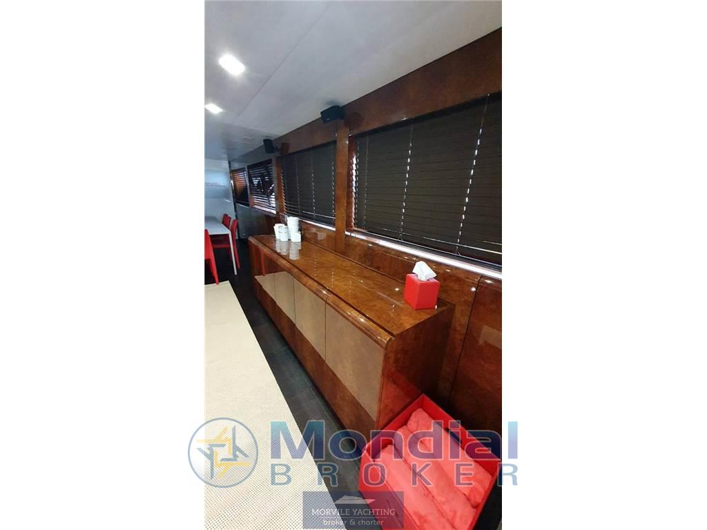 Notas internasCabine ospiti: 4 Cabineequipaggio: 2 Bagni degli ospiti: 4 Bagnidell'equipaggio: 2 Lavastoviglie Lavatrice Antenna TV satellitare Impianto stereo Impianto TV Tv Bagni: 4 Cabine: 4 Cucina Forno a microonde Forno Congelatore Notas de la instrumentaciónImpianto elettronico- AIS - Altoparlanti di pozzetto - Bussola - Centrale di navigazione - Computer di bordo - Ecoscandaglio - GPS - Impianto TV - Lettore CD - Lettore DVD - Log-contamiglia - Pilota automatico - Plotter - Radar - Radar Detector - Radio - TV a schermo piatto - VHF - VHS Pilota automatico Baromentro Bussola Comandi flaps Contamiglia Ecoscandaglio GPS GPS-Plotter Joystick di manovra Log Vhf Notas de armamentoSerbatoio acquenere:1 x 1,250 l Coperture/Tendalini - Tendalino pozzetto Equipaggiamenti Elettrici - Generatore: 2 X 28 KW - Inverter - Presa corrente a terra Equipaggiamenti interni - Acqua calda - Aria condizionata - Caricabatterie - Compressore ad aria - Congelatore - Dissalatore - Elica di poppa - Elica di prua - Forno - Frigorifero - Lavastoviglie - Lavatrice - Microonde - Pompa di sentina elettrica - Pompa di sentina manuale - Pompa per acqua di mare - Riscaldamento - WC elettrico - WC marino Dotazioni Esterne - Autogonfiabile - Cuscineria pozzetto - Doccia pozzetto - Gruette - Passavanti in teak - Passerella idraulica - Pozzetto in teak - Scaletta bagno - Tavolo pozzetto - Tender Cuscineria Frigorifero esterno Scaletta: 1 Tavolo nel pozzetto |