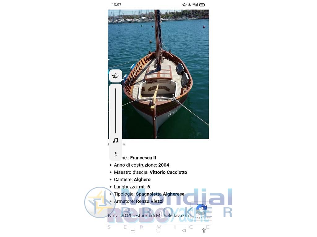 Notas internasNotas de la instrumentaciónAncora (con catena e cima), Autoclave, Carrello (Ellebi portata 2000 kg anno 2011), Colorazione speciale, Doccia esterna, Scaletta da bagnoNotas de armamentoCOPRISCAFO COMPLETO, VELA LATINA E FIOCCO COME NUOVE, TRATTAMENTO EPOSSIDICO OPERA VIVA E MORTA CON RINFORZO IN FIBRA DI VETRO, VERNICIATA A NUOVO |
