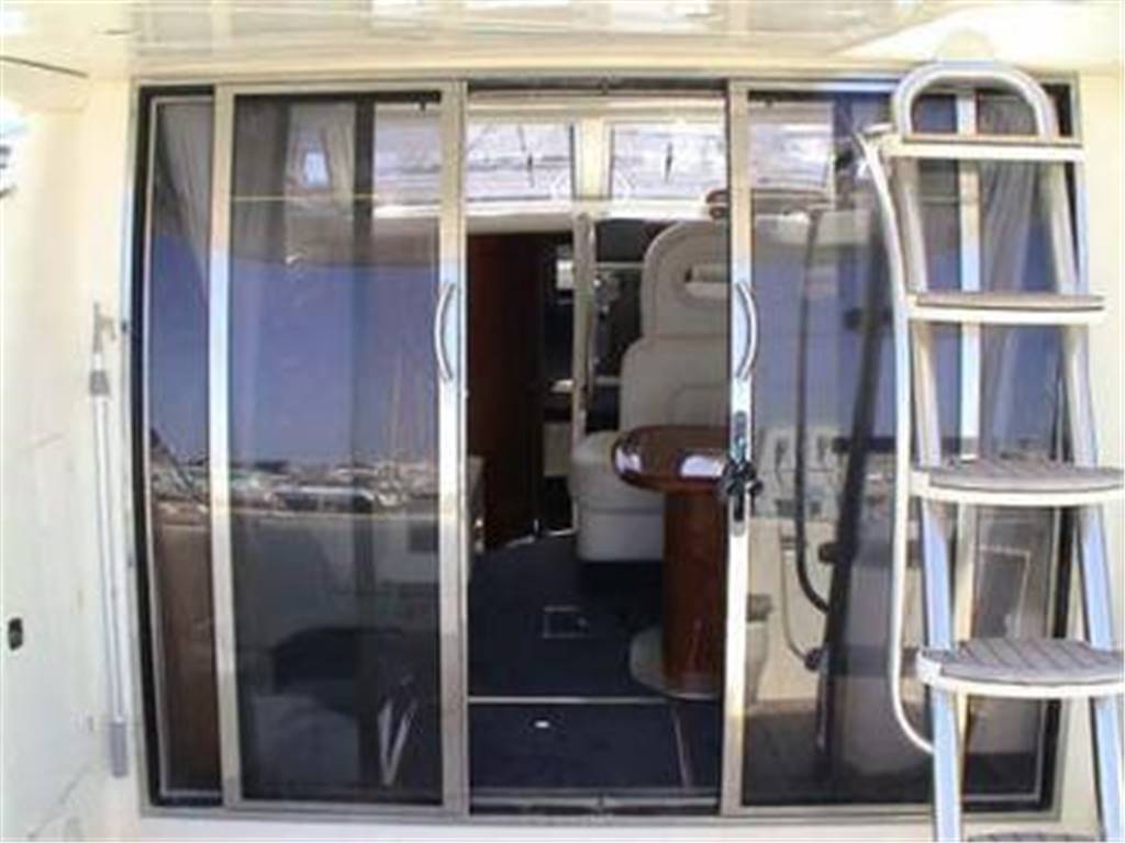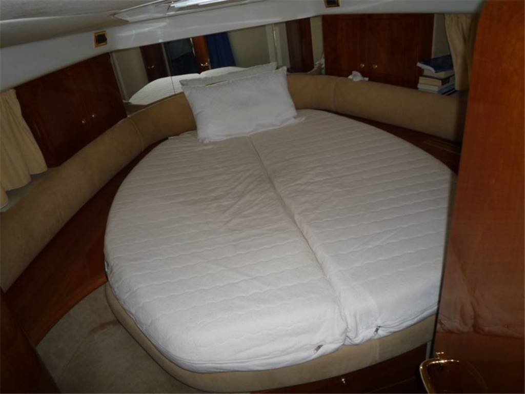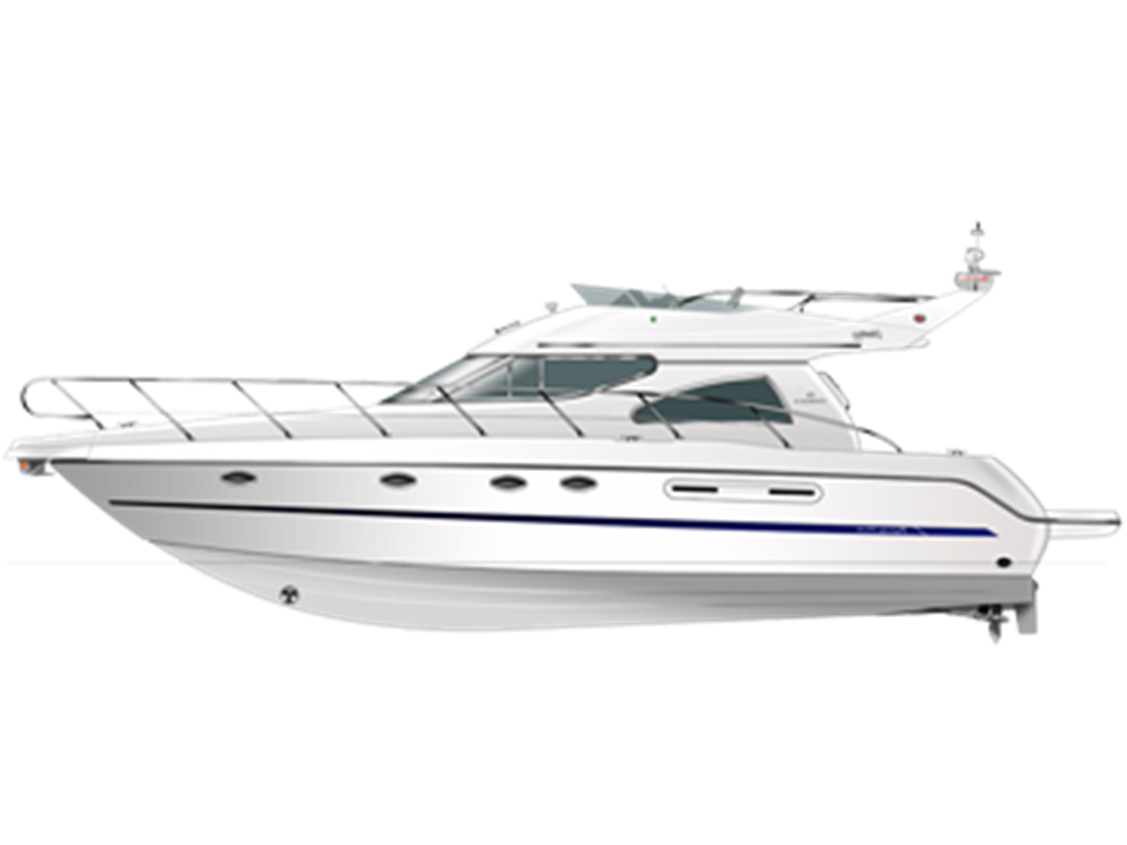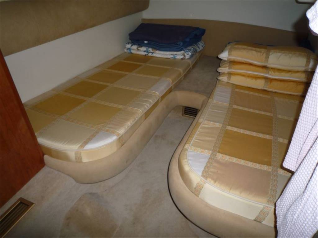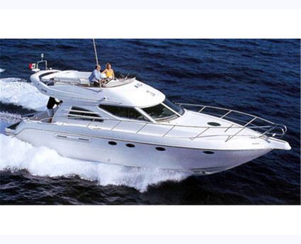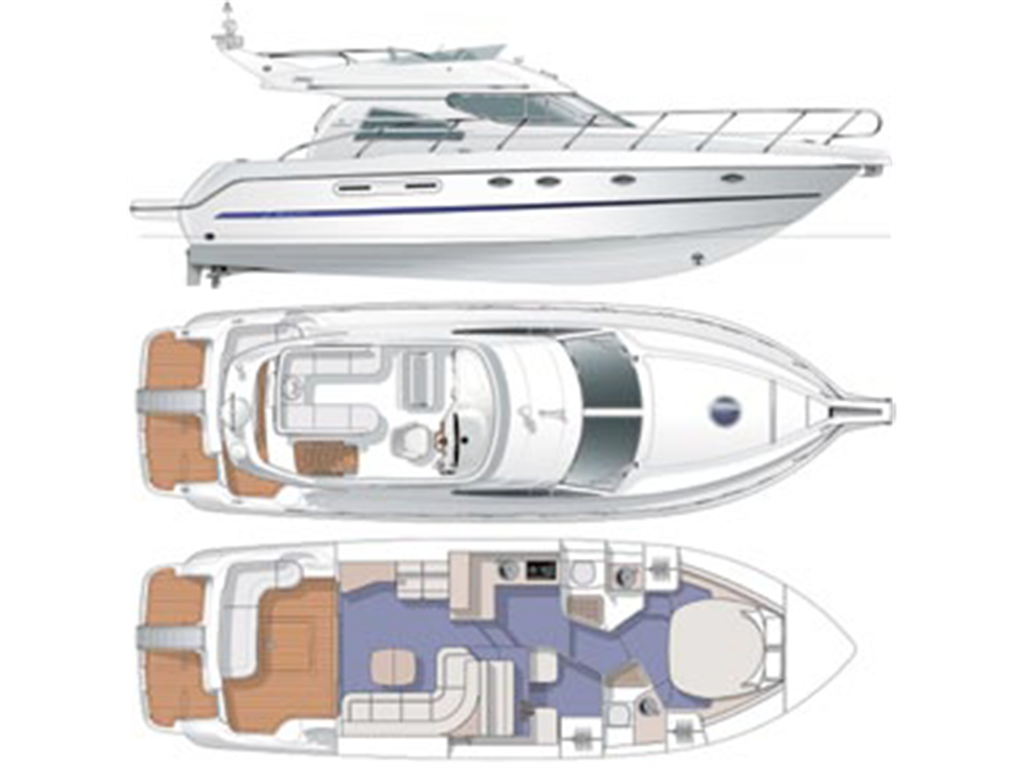 FLY BRIDGE Dual station instrument controls (see Lower Helm Position) Double helm seat with fore and aft adjustment U-shaped upholstered sofa with drinks table Double sunbed with cushions Loudspeakers linked to saloon stereo CD/radio Integral stairway from aft cockpit with access hatch Wind deflector screens Stainless steel handrails GRP radar arch Console and seat covers Matched whip aerials for VHF R/T and radio Refrigerated top loading cool box Bilge pump audible alarm LOWER HELM STATION Twin helm seats with fore and aft adjustment for helmsman Twin windscreen wipers with blade-mounted freshwater screen wash system Burr elm instrument console with engine instruments and fuel gauges Dual station instruments and controls at Flybridge and Lower Helm Position: rudder position indicator electronic engine controls visual and audible engine warning system hydraulic steering electric anchor winch remote control trim tab controls with indicators VHF with intercom to flybridge speed and distance log echo sounder with alarm remote control searchlight high speed magnetic compass horn button Bilge pump controls with visual ?pump running? warnings 24v and 220/240v electrical control panels PVC sunscreens Riding light, helm and navigation light control switches 12v outlet Chart table with light and chart stowage Sliding tinted side window adjacent to helmsman Stowage under helm seat Cockpit lighting Cockpit cover Stainless-steel handrails Gas strut assisted hatch to lazarette stowage area Lockable access hatch to engine room Overboard vented, self-draining locker for 2 gas bottles Transom door leading to integral bathing platform Reserve manual bilge pump and controls Remote fuel cocks located in locker Full-length transom bathing platform with foldaway swimming ladder, hot and cold shower, teak decking, storage compartment and dinghy storage removable chock system 220/240v shore support inlet and cable stowage locker 24 Volt: 2 x heavy-duty batteries for engine starting 4 x heavy-duty auxiliary batteries Engine alternators charge via blocking diodes to isolate engine start batteries from auxiliaries 50amp/24v float battery charger connected to auxiliary batteries 5-amp/24v float battery charger connected to engine starting batteries Remote battery master switches with control switch at main switch panel Circuit breakers on all circuits. 24v to 12v voltage dropper on certain navigation and radio circuits 220/240 Volt: Shore support inlet in cockpit locker with storage for cable Polarity check system 4-bladed aquafoil propellers in nickel aluminum bronze. Engine room lighting Hydraulic steering system Lockable access hatch and ladder from cockpit to engine room Trim tabs with indicators Electronic engine and gear shift controls Engine room extractor fan with electronic time delay |