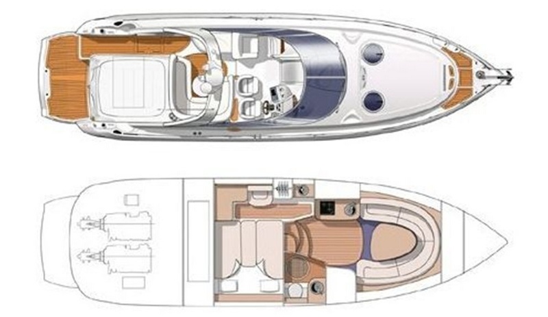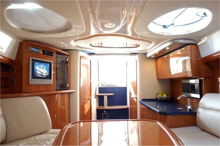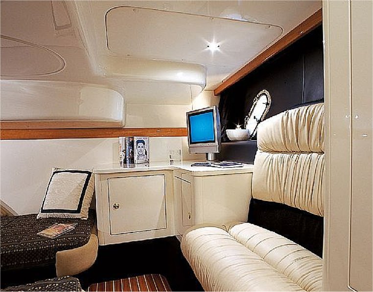 Notas internas-Piso Interior, teca cerezo. CABINA:-solarium popa con garaje subyacente, comedor con sofá y mesa, móvil contrasta con placa eléctrica, frigorÃfico y fregadero. Notas de la instrumentación-Piloto automático, GPS, PLOTTER-DEPTH SOUNDER-VHF.Notas de armamento-Generador-aire acondicionado-hélice de maniobra en el motor de garaje-oferta pasillo popa hidráulico proa retráctil con ángulo BWA mercurio-timón-cadena. |