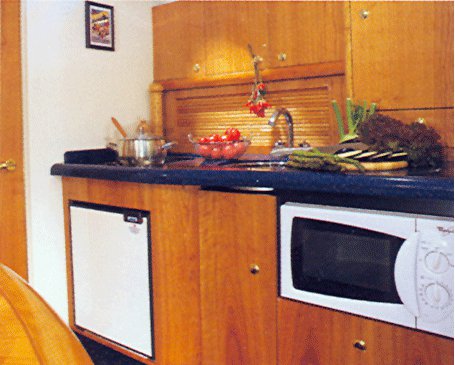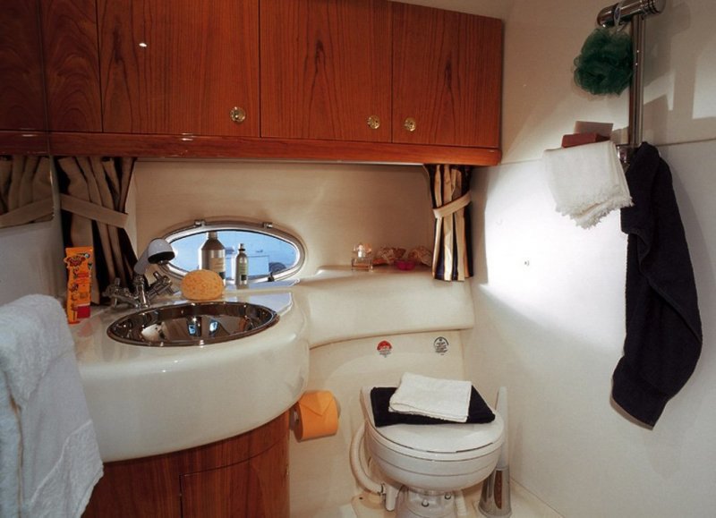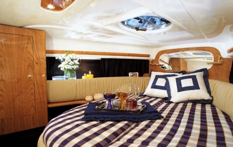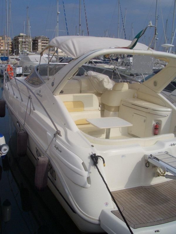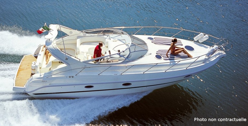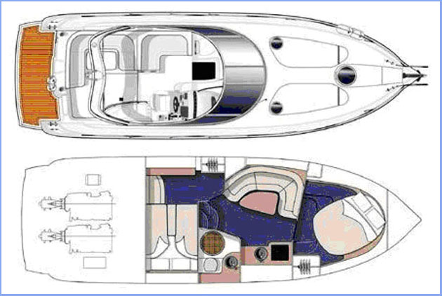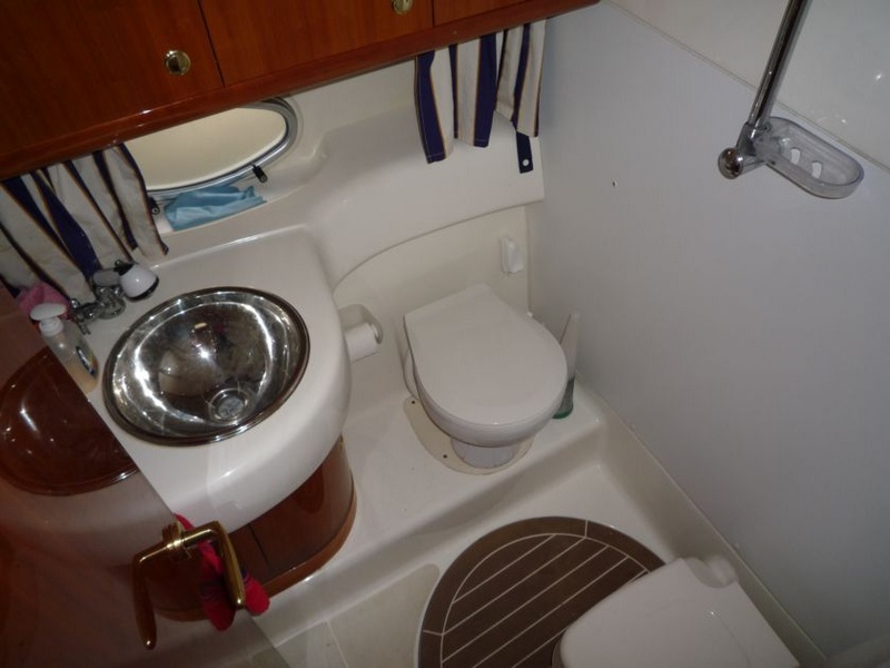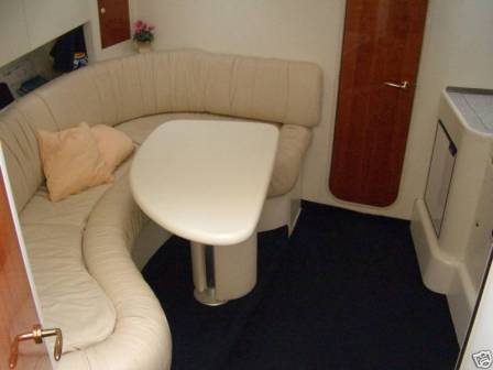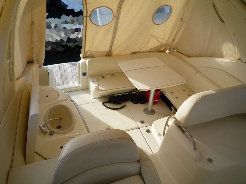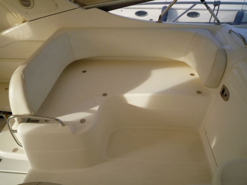Interior in perfect condition with shiny finish and cherry wood furniture, sofas in beige suede and mahogany wood dinette floor drain 's maple and blue carpet in the bedrooms - double cabin forward with island bed and large wardrobe closet, drawers - Bath bathroom with electric toilet, shelf and sink with mixer and shower - Second guest cabin aft with two twin beds with conversion to one large double bed, wardrobe and comfortable furniture small sofa for two people - the deck and side windows make it bright wide and the seating consists of a comfortable C-shaped sofa and table in beige Alcantara molded fiberglass folding - as opposed to the large walled kitchen cabinet equipped with sink complete with mixer and two-burner stove stove, refrigerator 60 liters. , Moulinex microwave, cupboards, pantry and good size + other furniture - wall above the couch to find the electrical box with CD stereo and control glomex amplified antenna TV - Outside in the cockpit we find: a comfortable C-shaped sofa with seats in Ski, as opposed at the helm - a second dinette aft with fiberglass folding table and converts into a spacious sun deck - starboard cabinet with sink and refrigerator lockers - extended swimming platform Teak plywood and covered with a comfortable shoe -