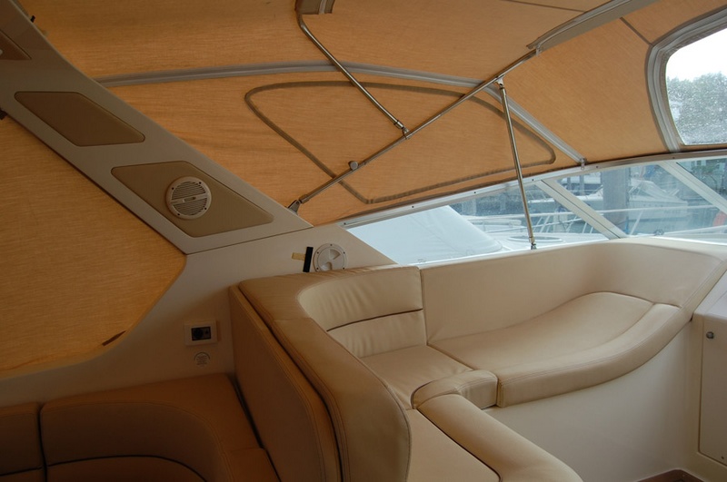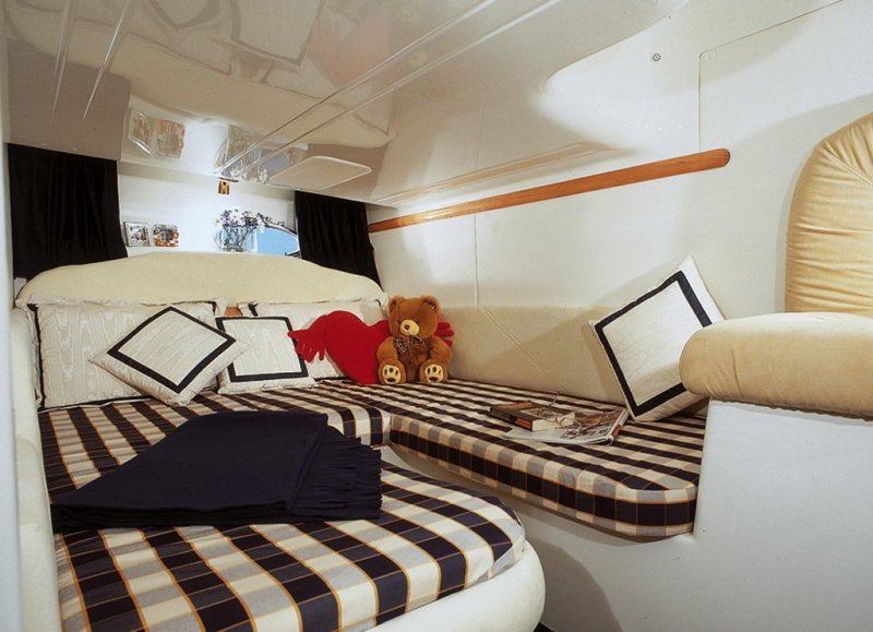 Interni in ottime condizioni con rifiniture e mobili in ciliegio lucido, divani in alcantara beige e pavimento dinette in moquette blu anche nelle camere - Cabina matrimoniale a prua, con letto ad isola e comodo armadio guardaroba, cassettiere - Bagno privato con wc elettrico , ripiano e lavabo con miscelatore e doccia - Seconda cabina ospiti a poppa con due letti in piano con trasformazione per unico grande letto matrimoniale, mobile armadio e comodo piccolo divano a due posti - le finestrature in coperta e laterali rendono molto luminosa ed ampia la dinette composta da un comodo divano a C in alcantara beige e dal tavolo sagomato in vtr abbattibile - contrapposto a murata il grande mobile cucina attrezzata con lavello completo di miscelatore e fornello a due fuochi in vetroceramica ,frigo 60 lt. , micronde Moulinex , pensili, e dispensa di buone dimensioni + altro mobile - a Parete sopra il divano troviamo il quadro elettrico con stereo cd e comando antenna amplificata Tv glomex - Esternamente nel pozzetto troviamo: un comodo divano a C con sedute in Ski, contrapposta alla timoneria - una seconda dinette a poppa con il tavolo in vtr abbattibile e trasformabile in ampio prendisole - a dritta mobile dotato di frigorifero lavello e gavoni - plancetta bagno allungata e ricoperta in compensato Teak con comodo portascarpe -