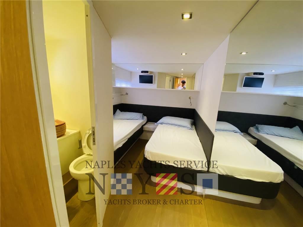 Notas internasMaster Cabin con Matrimoniale King Size e bagno padronale con doccia Cabina Ospiti letti in piano con bagno e doccia Cabina Matrimoniale Ospiti con bagno Bagno Ospiti grande con doccia e bagno Zona Cockpite molto grande con Snack e cucina con lavello e Piano ad induzione a 4 fuochi (col. bianco) Zona dinette con divano ad U e tavolo centrale Notas de la instrumentaciónDESCRIZIONE ACCESSORI2x GPS Raymarine E120 Contacatena QUICK CHC-1202 ad incasso VHF Raymarine RAY49E Antopilot Ray i80 Flaps LENCO Piastra ad induzione BOSH Elica di poppa e prua Quick Computer di bordo con domotica Air-Cond CLIMMA Vega MK11 Impianto Dolby-Surround Tv LED a scomparsa Notas de armamentoDISPOSIZIONE ESTERNAPozzetto con tavolo centrale con divano contrapposto Pavimentazione pozzetto in teak con fuga nera Camminamenti laterali e ponte di prua con pavimentazione in teak con fuga nera Prendisole di prua con cuscini Pedana di poppa grande con ingresso cabina marinaio (pv. teak fuga nera) Doppio FlashDeck Dx/Sx in pozzetto CABINA MARINAIO/ SALA MACCHINA Ingresso da poppa da Sala Controllo e Macchina. Cabina con bagno e letto piazza e 1/2 Sala controllo elettrico ampia con lavatrice divisa dalla sala motori da porta in plexiglass |