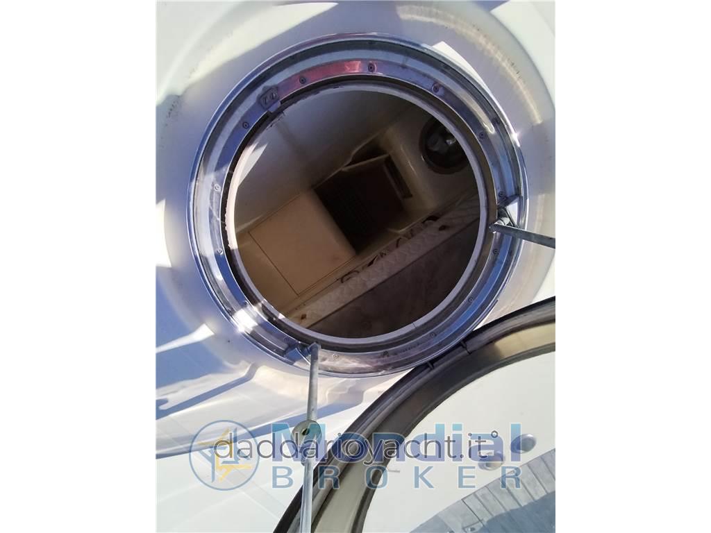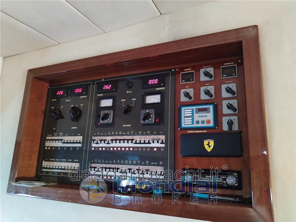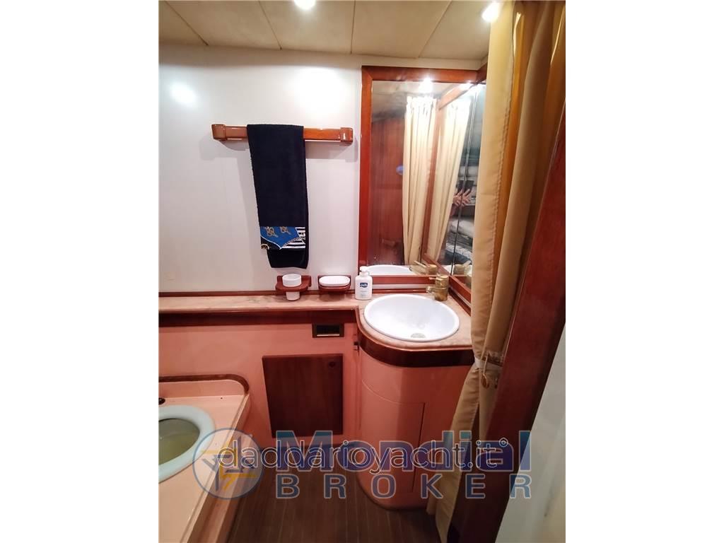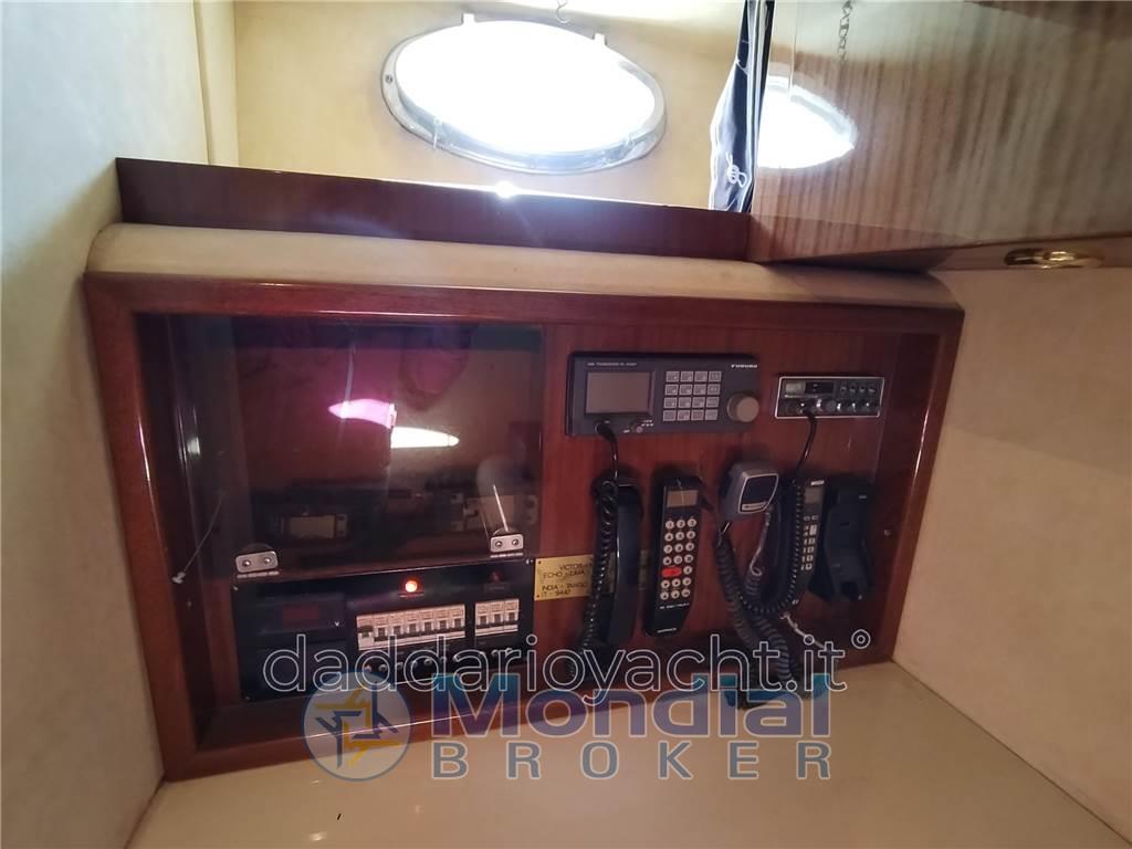 Notas de armamentoAltoparlanti, 2 Aria condizionata (46k btu separate), Boiler (100lt), 2 Clima reversibile, Congelatore (ext), Copripozzetto, Cucina (elettrica), Cuscineria completa, Cuscineria di poppa, Cuscineria di prua, Dissalatore (smontato), Fornello (gas ext), Frigorifero esterno, Frigorifero interno, Impianto TV, Microonde (con grill), Pavimento interno in legno, Prese interne 12v, Prese interne 220v, Stereo (in ogni cabina), Telecamera (sala motori infrarossi), Tenda Elettrica, Tendalino, VHS, 4 WC marino elettrico, Sincronizzatore motori