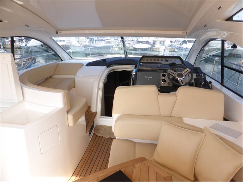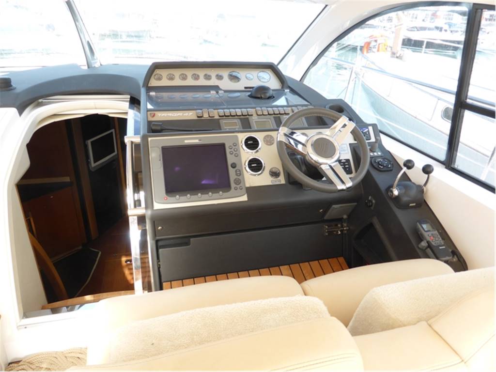 Notas internasFairline Targa 47 features excellent internal accommodation which has been designed for accommodation four guests in two cabins featuring private en suites. The Master Stateroom is luxurious and opulently appointed. Positioned forward with considerable natural light from the twin portholes and deck hatch, it is a bright and airy cabin with luxurious appointments including a full-height hanging locker, and under bed stowage. A full-size en suite with separate shower adjoins the cabin. The twin cabin is amidships with ample stowage that also includes a hanging wardrobe. Ingeniously, the twin berths slide together to create a double when required. Generous opening portholes provide natural daylight and the accommodation is completed by a private en suite with full size separate shower. The main saloon has comfortable seating for six and a state of the art entertainment console including LCD television, radio, and CD changer. Both this and the comprehensively equipped galley with hob, microwave, full size fridge/freezer, extractor fan and cherry floor are accessed directly from the cockpit. The cockpit and helm position is focused on al fresco entertaining; the new Targa 47 will feature the most generous cockpit layout to date. The cockpit area is perfect for al fresco dining with wrap-around seating for six to eight, featuring a sink with hot and cold water, refrigerator, insulated coolbox and where requested an electric griddle. A transom gate leads to the integral teak-laid bathing platform with shower and concealed bathing platform ladder. Access is given to the tender garage capable of accommodating a tender / dinghy. Side-decks with handrails afford easy access to the foredeck, where deep and plush reticulated-foam coachroof sun cushions provide for perfect relaxation. Notas de la instrumentaciónIn the original development brief and plans for the award-winning Targa 47 we declared our intention of creating a model to ?Redefine the Art of Express Cruising?. That this has been achieved so successfully is due in large part to the many advances unveiled at the earlier launch of our flagship model, the widely acclaimed Targa 62. Her leading-edge innovations and powerfully dramatic styling led the way and the all-new Targa 47 inherits the key elements of her elegant design philosophy, including the signature feature of all our GRAN TURISMO models, the powered retractable hardtop. The story continues with an incredibly spacious cockpit, a large stern bathing platform and an integrated garage for tenders and water toys ... not to mention the magnificent saloon, galley and two large cabins, each with its own en suite.12v heavy duty weatherproof socket Access via transom deck to port and starboard side decks Aft cockpit hood with clear panels and zipped doorway Bathing platform lights Boat hook Central dining area Cockpit bar with refrigerator, sink, hot and cold water, insulated coolbox Companion seating to helm Drinks holders Engine bay access hatch with stainless steel pneumatic support struts, independent of the tender garage Fender stowage Glove locker Life raft stowage Mooring warps Manual bilge pump(s) Retractable powered hard top 'Reticulated' non-absorbent foam cushions for aft sundeck Stainless steel handrails Stowage lockers under cockpit seats Teak-laid floor throughout self-draining cockpit Warning light and audible alarm during garage door operation Warp lockers Main Saloon CD/Radio with 2 speakers in saloon and 2 waterproof speakers in cockpit Aerial and connections for television Bar unit Control panel for 12v/24v/240v domestic electrical circuits Cocktail table converts to dining table Deck hatch with flyscreen and blind First aid kit Full-height standing headroom Halogen ceiling lights Handrail LCD TV Lockers (overhead) Sliding door to cockpit with integral blind system Sofa Stainless steel opening porthole(s) with flyscreen Stowage locker under floor Crockery stowage Electric ceramic/halogen hob Extractor fan Fire extinguisher Foundations® or Avonite® work surface with covers Halogen ceiling lights Integrated waste bin Lacquered cupboard doors Lockers (overhead) Microwave oven Refrigerator (172L)/freezer (46L) with double door Random teak floor Sink/drainer with hot and cold mixer tap Stainless steel opening porthole(s) with flyscreen Work surface lights Work Surface Options Notas de armamentoAnchor chain lockerAnchor winch (electric) Anchor winch controls Calibrated anchor chain Concealed telescopic swim ladder to bathing platform Ensign and staff Fender set Full set of IMCO navigation lights Garage with winch system for concealed stowage of optional Jet RIB or PWC beneath aft sundeck Hot and cold water transom shower Moulded non-slip deck surface Rubbing strake Recessed self-draining area on foredeck for coachroof sun cushions Remote control searchlight Riding light Self-stowing Delta® anchor Stainless steel bow fairlead(s) Stainless steel bow, spring and stern cleats Stainless steel handrails Stainless steel stemhead roller Teak-laid bathing platform Toughened glass curved windscreen Transom gate from cockpit to integral bathing platform Twin horns Water filler(s) Windscreen washers Windscreen wipers Aerodynamically designed engine air intakes Automatic bilge pumps for forward bilge, engine bay and rudder bay with manual 'on' override Automatic engine bay fire extinguisher system Balanced rudders Cathodic protection Dripless shaft seals Electric engine bay fan(s) Electric trim tabs with cathodic protection Engine bay lights Engine room soundproofing Exhaust overheat warning system High capacity emergency manual bilge pump system with dedicated valves Manganese bronze 'P' brackets Manganese bronze propellers contra-rotating Sea cocks on all inlets/outlets below waterline Stainless steel alloy shafts Water cooled engine exhausts with silencers and side outlets All gel coat and glass fibre hand laid with unidirectional, biaxial and woven rovings Bowthruster 8