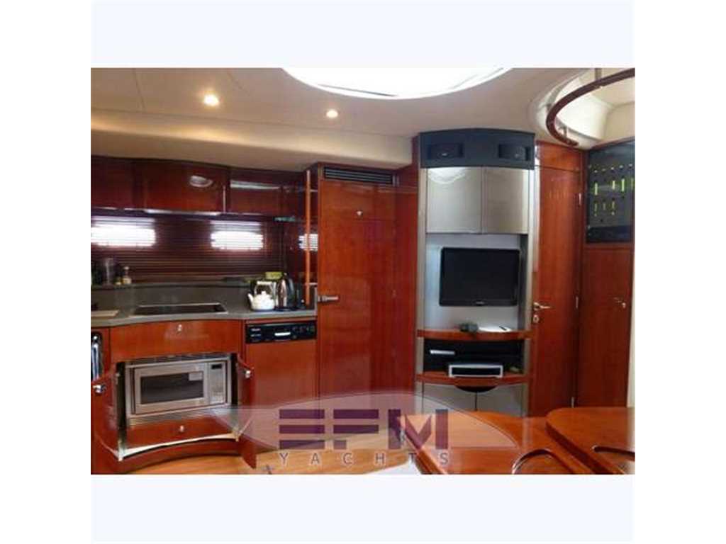 Classic high gloss cherry interior and wooden planked floor - the lower deck the square consists of a large living room with large C-shaped sofa microfiber cream and teak table that can be opened with 2 removable puff - In front of the sofa a cabinet at side with large lcd tv and plant dvd and stereo radio with CD player, which continues connected with the great walled kitchen complete with 4 burners + vcr combi oven + fridge, cupboards, pantry and dishwasher. Entrance from the living room there is on the right aft guest cabin with 2 bunk beds and wardrobe moving bus, entrance on the left instead of the owner's suite amidships with double furniture, 2 seater sofa, wardrobe, lcd tv wall, private bathroom and separate shower - large double VIP cabin in the bow with lCD TV and private bathroom with separate shower and has access from the living room - with access from the cockpit is aft crew cabin with 1 bed flat + transformation for 2 more sleeps , toilet, sink and shower and access to the engine room -