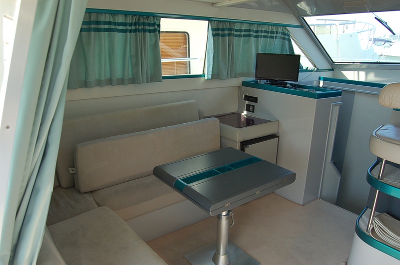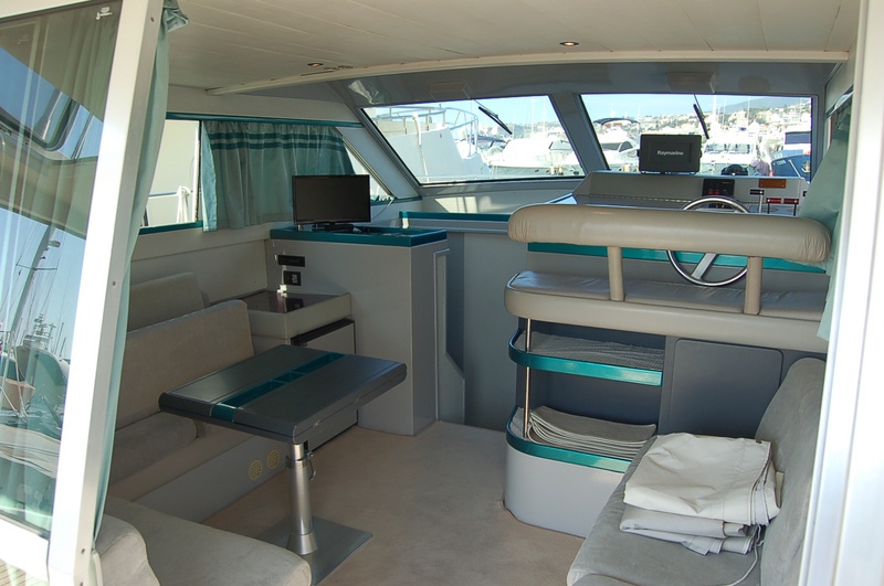 Notas internasNotas de la instrumentaciónGPS plotter Raymarine Vhf Eco piloto coloresNotas de armamentoCabina de pasarela, teca, mosca de Bimini, TV con antena, completo toldos, cojines de sol, ducha al aire libre. |