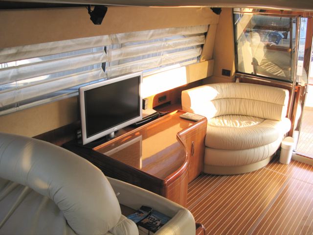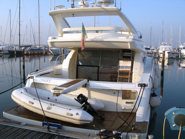 Notas de armamentoAria condizionata completa in tutti gli ambienti - Dissalatore 120 lt/h - Elica di manovra a prua - Elica di manovra a poppa - Antenna TV SAT Navisystem NT 55 con ricevitore in salone - Dome vuoto Antenna TV SAT per simmetria sul roll-bar - Terza stazione di comando in pozzetto - Norvegese di chiusura pozzetto - In salone impianto stereo CD/DVD Hi-fi Bose dolby sorruound - in salone impianto SAT SKY - In salone TV LCD Sharp 30" - Lava/asciuga biancheria 5kg - Lavastoviglie in cucina 8 coperti - Plancetta di poppa rivestita completaente in Teak - Bimini top fly in acciaio inox prodiero - Bimini top fly in acciaio inox poppiero - Tavolo pozzetto in acciaio inox-plexi - Ripostiglio non allestito con accesso dal pozzetto - Tender Arimar con motore fuoribordo - Faro orientabile elettrico - Cuscini con schienale panche pozzetto - Luci extra camminamento laterale - Luci extra illuminazione spoiler - luci di soffusione al led in salone - faretti di illuminazione al led in salone - Fari stagni sotto spoiler di poppa - Piano cottura vetroceramica - Finestrature esterne posteriori pozzetto a specchio - Gradini accesso camminamenti laterali in teak - Poltrona prendisole aggiuntiva sul fly - Tende doppie a pacchetto salone - Inverter Mastervolt 34/3000W - Filtri gasolio modello Racor con By-Pass in sala macchine - Presa TV banchina - Ancora Bruce kg 30 - Catena ancora mt. 100 - Nr. 02 bitte aggiuntive a poppa - Nr. 2 verricelli da tonneggio - Ripetitore gasolio sul fly - Impianto con serbatoio acque nere - Rubinetto acqua dolce a prua - Rivestienti pareti interne in alcantara - Rivestienti cielini interni in alcantara - Rivestimento di tutta la pavientazione della barca in legno dogato con comento in acero bianco - Rivestimento pavimenti bagni in legno finitura lucida con righe e logo Ferretti - Tende a pacchetto cabina armatore - TUTTE LE VOCI SOPRA ELENCATE SONO ACCESSORI OPTIONALS INSTALLATI A BORDO.