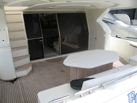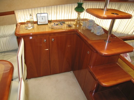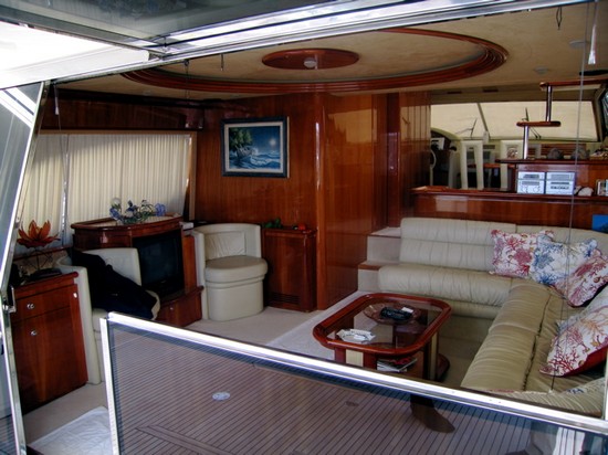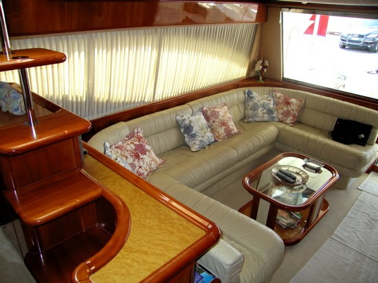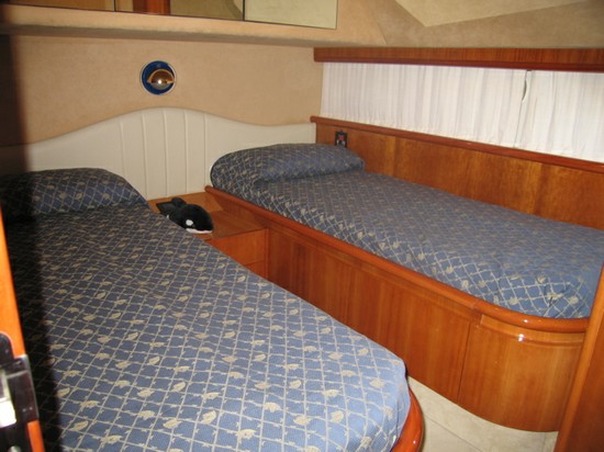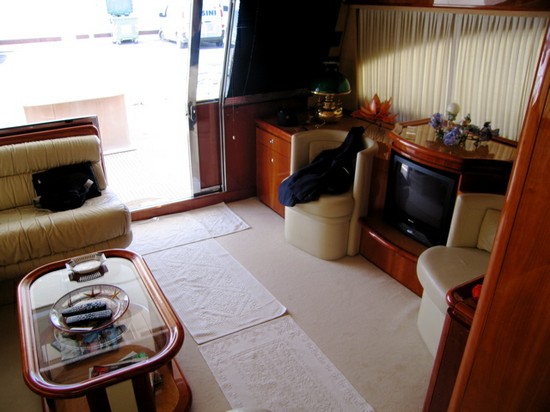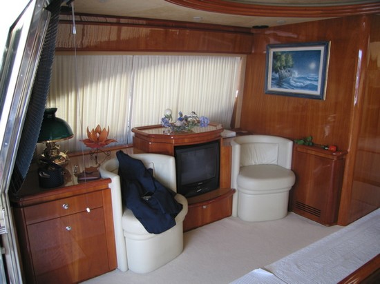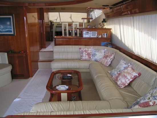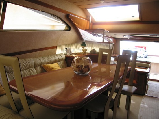 Notas internasGran salón con sofá para la "U" a la derecha, tabla de fumar cristal y Central cereza, dejado cereza móvil con sillas de comedor circular, levantó derecho con Cerezo mesa y sillas, cocina independiente de diseño a la izquierda con la entrada del comedor, de la navegación puente y puerto externo en el pasillo de la izquierda, guión dejó con la escuela de la zona a la derecha de la entrada. Piso inferior: cabina de armador de barco Centro no dedicadas cabina de servicio, izquierda invitado con piso de gemelos y dedicada cabina de servicio, derecho invitado con literas, camarote Vip adelante con dedicación. Zona de tripulación habÃa equipado con nr 2 cabañas con servicio y entrada desde la cabina.