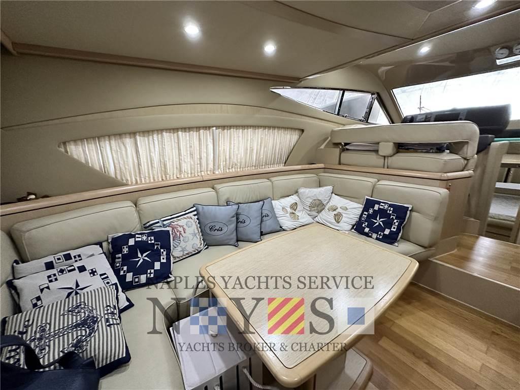 Notas internasNotas de la instrumentaciónBussola, Contamiglia, Ecoscandaglio, GPS (Raymarine E120), Pilota automatico (Raymarine), Plotter, Radar, Radio VHF (Raymarine).Notas de armamentoAllestimento tecnico e di coperta:Allarme motore, Allarme sentina, Ancora, Autogonfiabile, Doppia timoneria, Elica di prua - bow thruster, Flap idraulici (N°2), Luci di cortesia, Passerella (Besenzoni Colore BIANCO), Piattaforma, Pompa di sentina automatica, Pompa di sentina manuale, Presa 220V banchina, Raddrizzatore, Salpa Ancore Elettrico, Scaletta da bagno. Dotazioni domestiche di bordo: Aria condizionata, Prese interne 12v, Prese interne 220v, WC marino elettrico. Dotazioni di sicurezza: Giubbetti di salvataggio. Intrattenimento: Impianto TV, Stereo. Cucina ed elettrodomestici: Cucina, Fornello, Frigorifero interno, Microonde. Tappezzerie: Cuscineria di poppa, Cuscineria di prua, Cuscineria fly. |