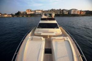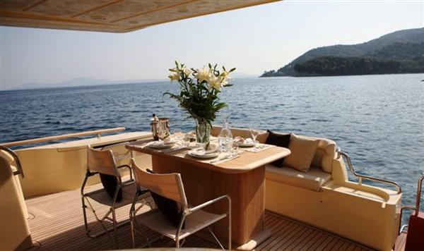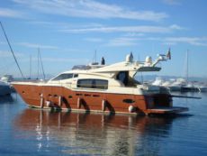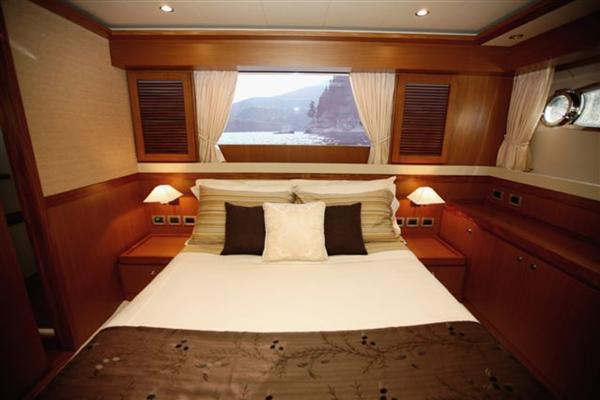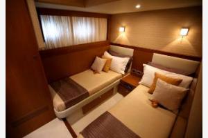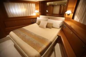 Notas internas3 cabinas: 1 camarote doble en popa, camarote de proa VIP con cama doble y Pivato cuarto de baño, cabina de invitados con dos camas individuales y baño privado, todas las cabinas cuentan con TV, equipo de música Bose-3 cuartos de baño con ducha y bidet, centro del buque, la tripulación de cabina doble con aire acondicionado, televisión y baño con ducha, cocina equipada, suelos de madera en la cocina-móvil volar con parrilla y refrigerador: amplia cocina con doble lavabo, nevera con congelador separado, horno combinado, lavavajillas. sala de estar: sofá + 2 sillones, en contraste con el sistema de arriba y abajo del LCD TV, mesa de café con frau tablero + 2 sillones, mesa de comedor + 3 sillas con sofá, sistema de televisión por satélite, equipo de música, sistema de sonido Bose, piso de madera.