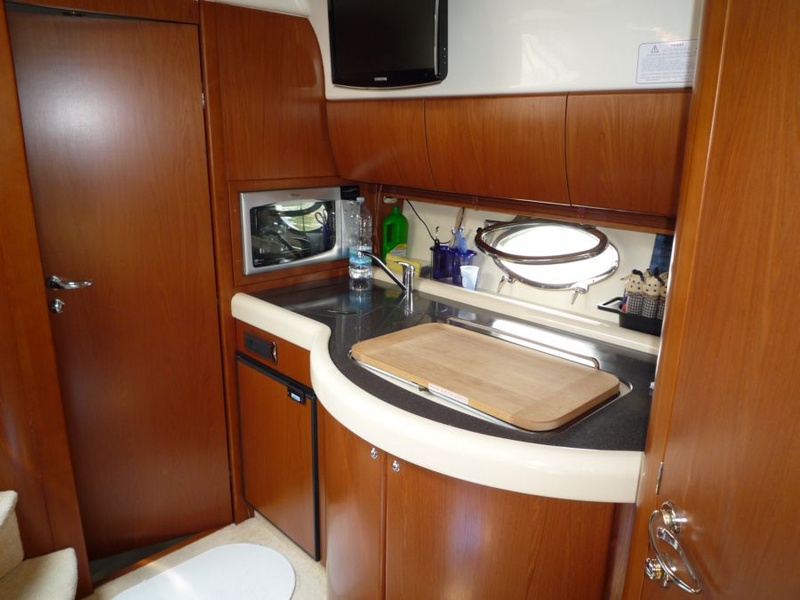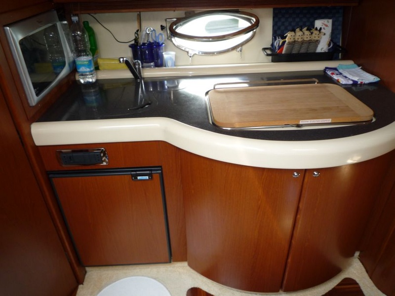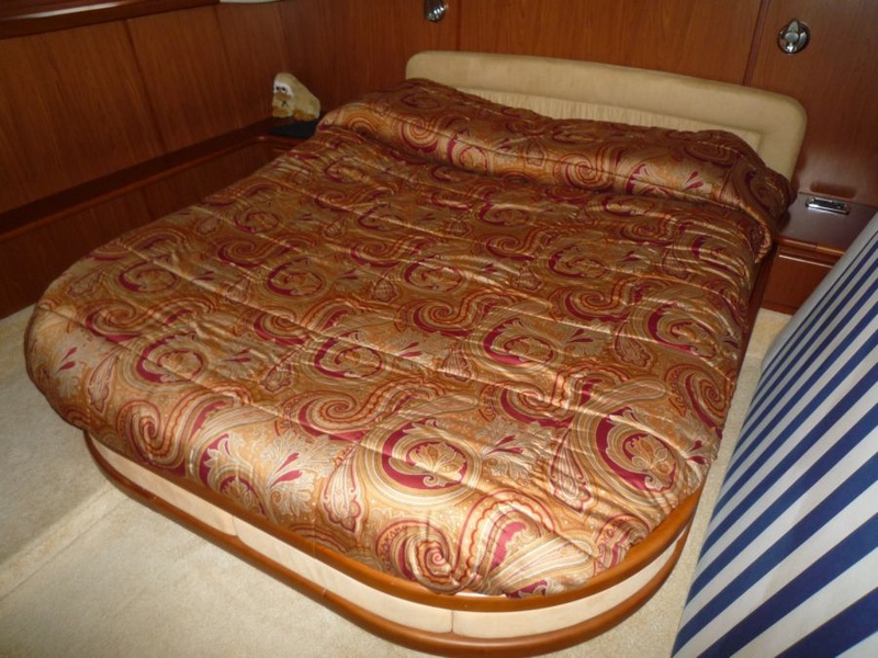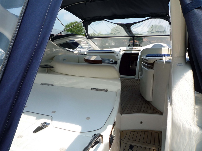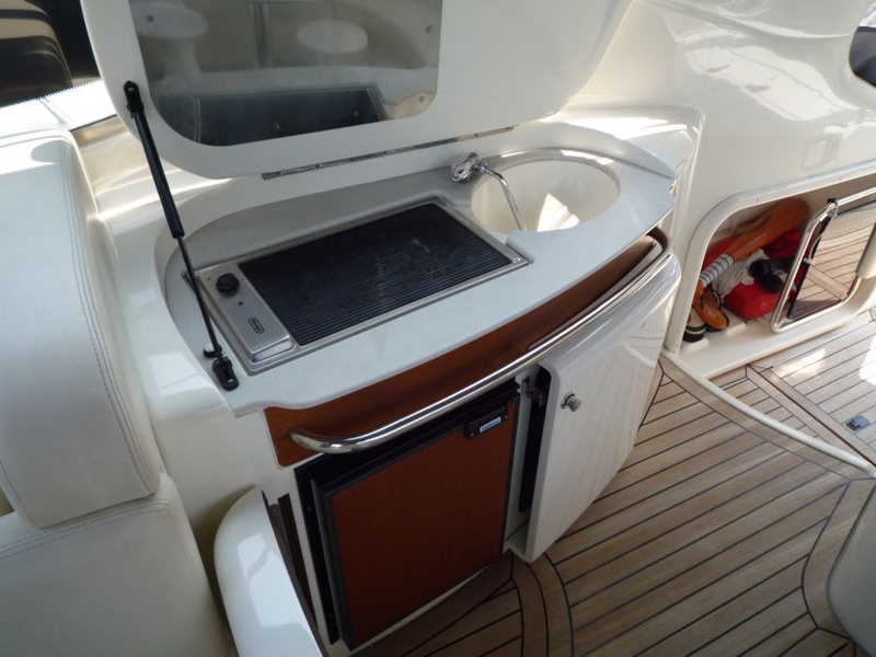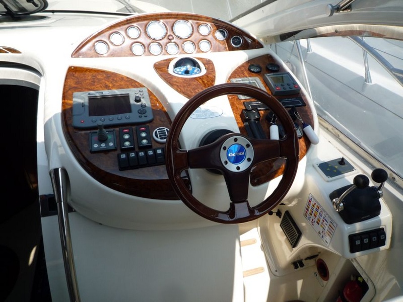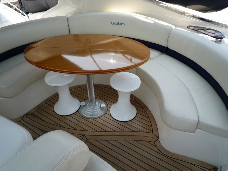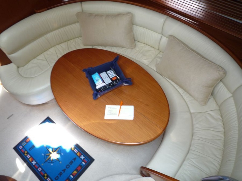 Las alfombras de Marfil, beige satinado y gamuza de cereza clásico interiores y sofá de cuero Marfil - Cabina principal y luminosas sus con isla cama doble armario y cabecera gabinete separado con otro sofá móvil + 2 plazas en marfil gamuza - Segundo VIP cabina hacia adelante con gran isla cama con cajones, lcd Tv 20 ' Sharp, alacena unidades y gabinetes de pared en acabado cerezo y un baño privado con ducha, vacÃo y aseo se hunde - con acceso desde el Salón a la izquierda después de la cocina, hay un segundo baño con inodoro, lavabo y ducha vacÃo - Amplio y luminoso living comedor con sofá de cuero Marfil a "C" y sdoppioabile raso mesa de madera que gira y plegable en una cama doble - armarios de cocina en el lado izquierdo completa con gabinetes, despensa, doble cuenco disipador con encimera de corian, en negro, 2-quemador estufa eléctrica, refrigerador y horno microondas - interior de Alcántara Marfil - comedor de madera cereza sólida - tabla de cabina habitable con ace sofá + cocina al aire libre móvil barbacoa con nevera y el fregadero - cubierta de popa grande por encima de la cochera para la licitación-
