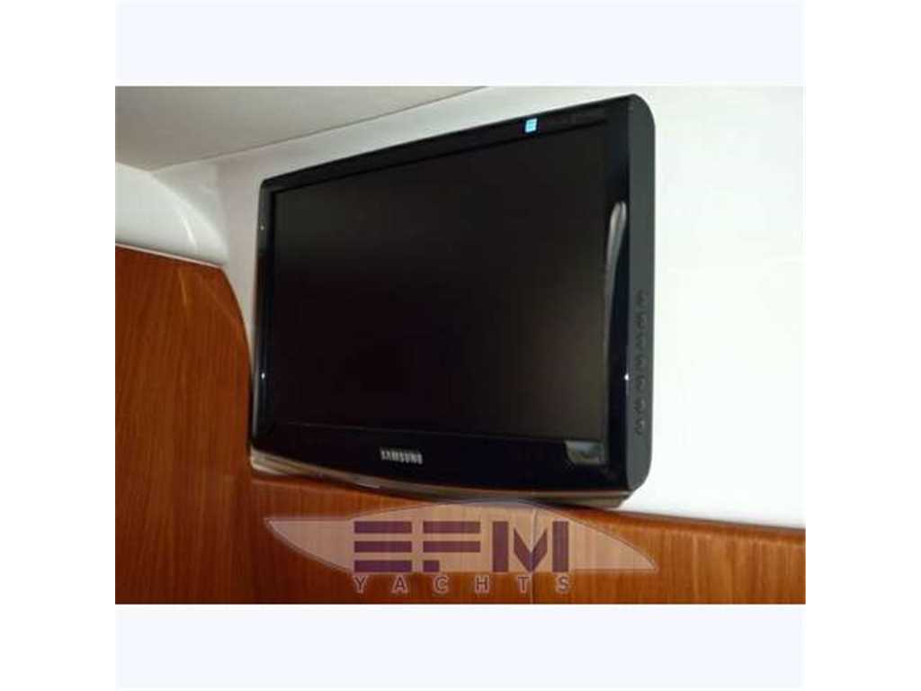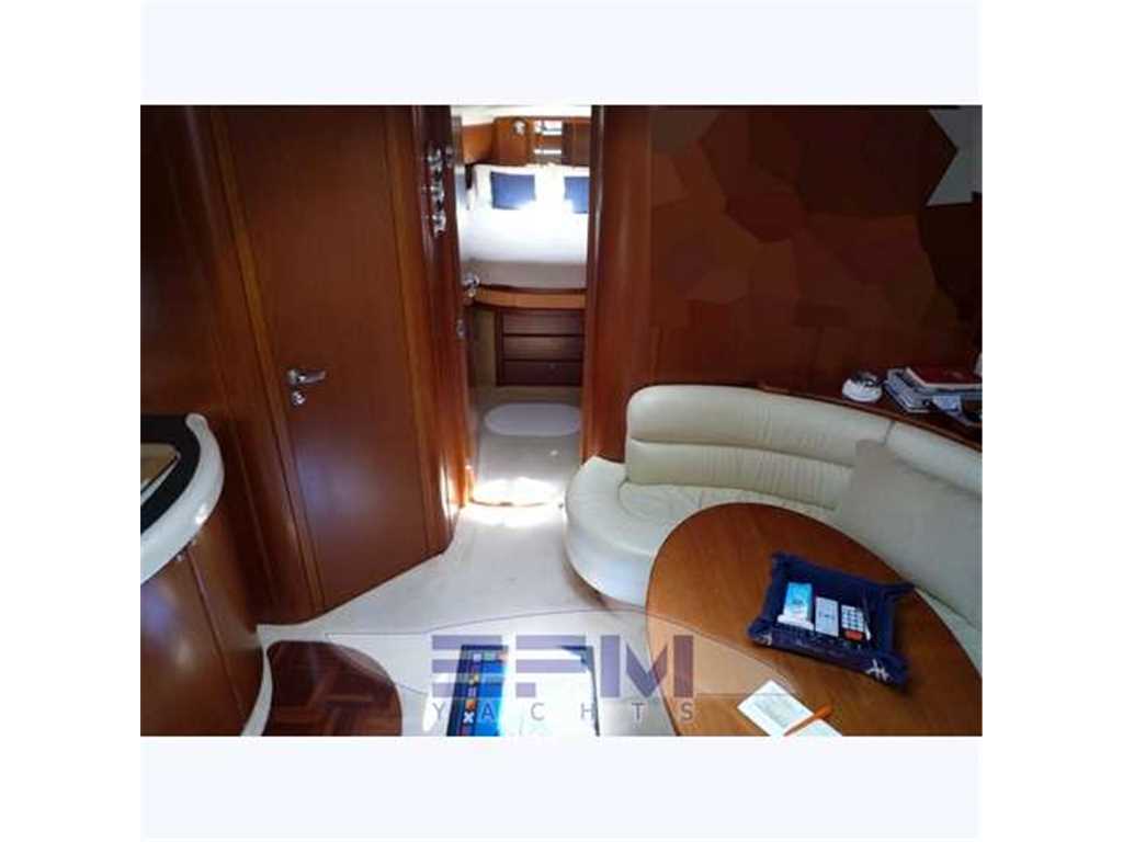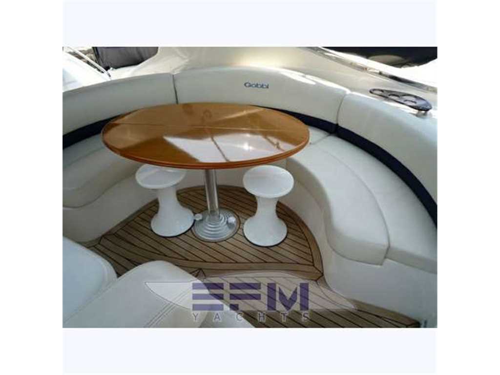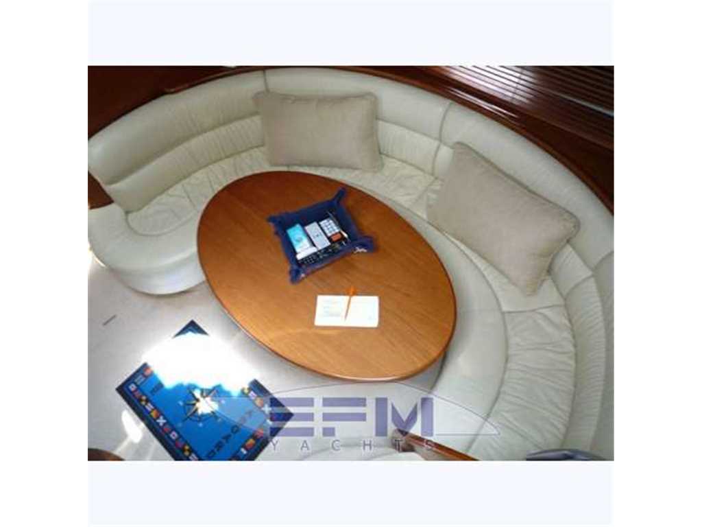 Notas internasClassici interni in ciliegio satinato e alcantara avorio, moquette beige e divaneria in pelle color avorio - Spaziosa e luminosa Cabina armatoriale a centro barca con letto matrimoniale ad isola staccato con mobile armadio e comodini + altro mobile con divano 2 posti in alcantara color avorio - Seconda grande cabina Vip a prua con letto matrimoniale ad isola con cassettiere,Tv lcd 20' Sharp , mobile armadio e pensili in ciliegio satinato e con bagno privato con wc vacuum, lavabo e box doccia - Con accesso dalla dinette a sx dopo la cucina troviamo il secondo bagno con wc vacuum, lavabo e box doccia - Ampio e luminoso salone con divano in pelle Avorio a "C" e tavolo in legno satinato sdoppioabile , ruotabile, abbattibile e trasformabile in letto matrimoniale - mobile cucina a murata sx completa con pensili, dispensa , lavello con doppia vasca , piano lavoro in corian nero , piastra elettrica a 2 fuochi, frigorifero e forno microonde - interni in alcantara avorio - dinette in legno ciliegio massello - vivibile pozzetto con divano a c e tavolo + mobile cucina esterna con barbecue frigo e lavello - garnde prendisole a poppa sopra il garage per il tender -
