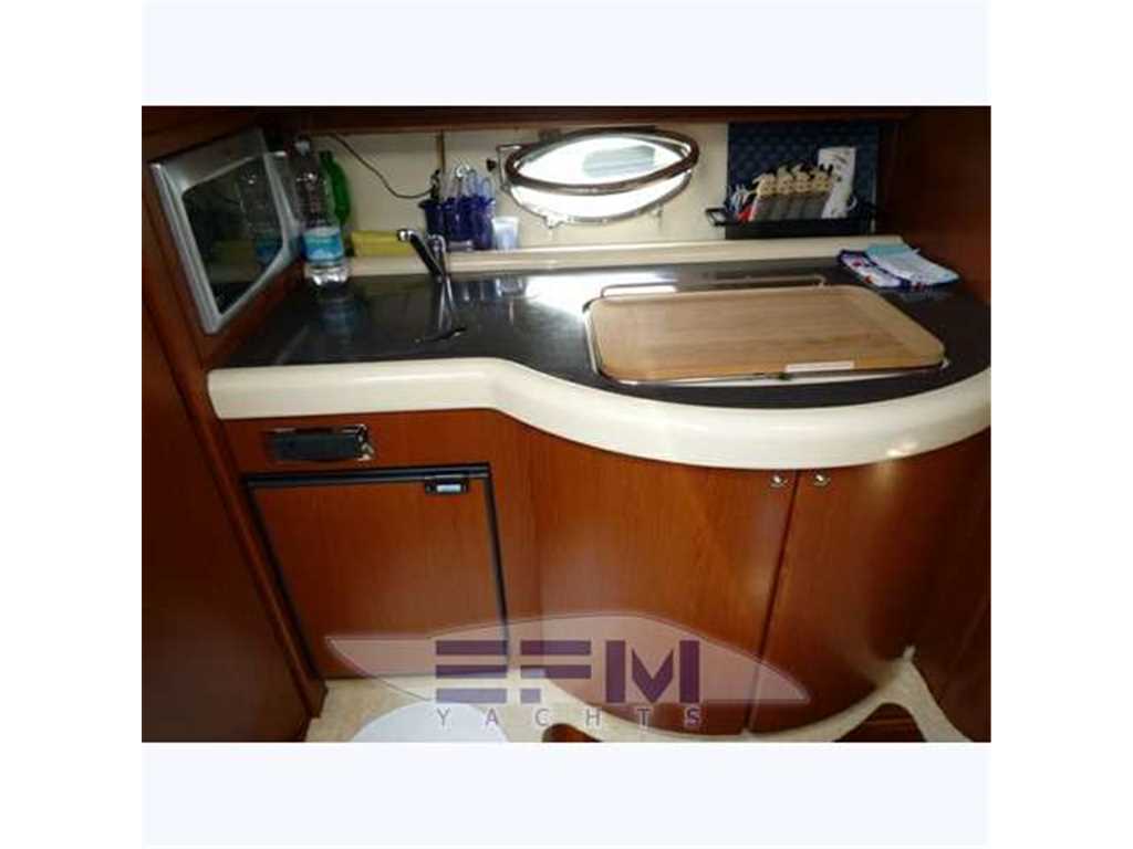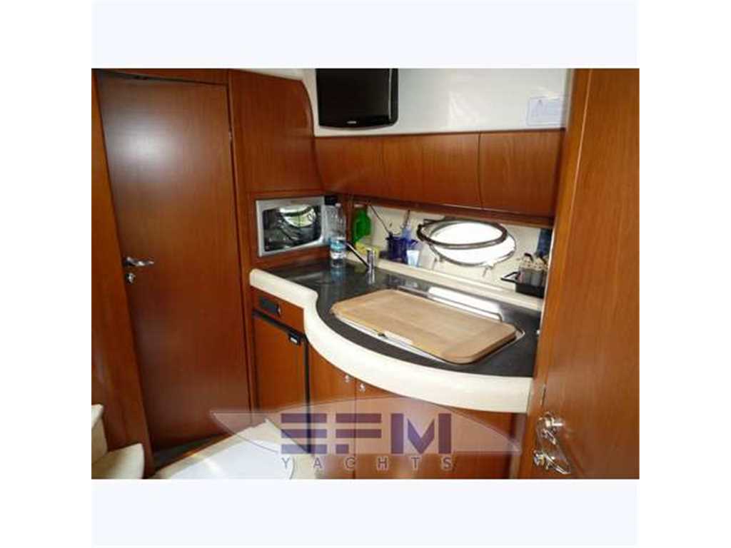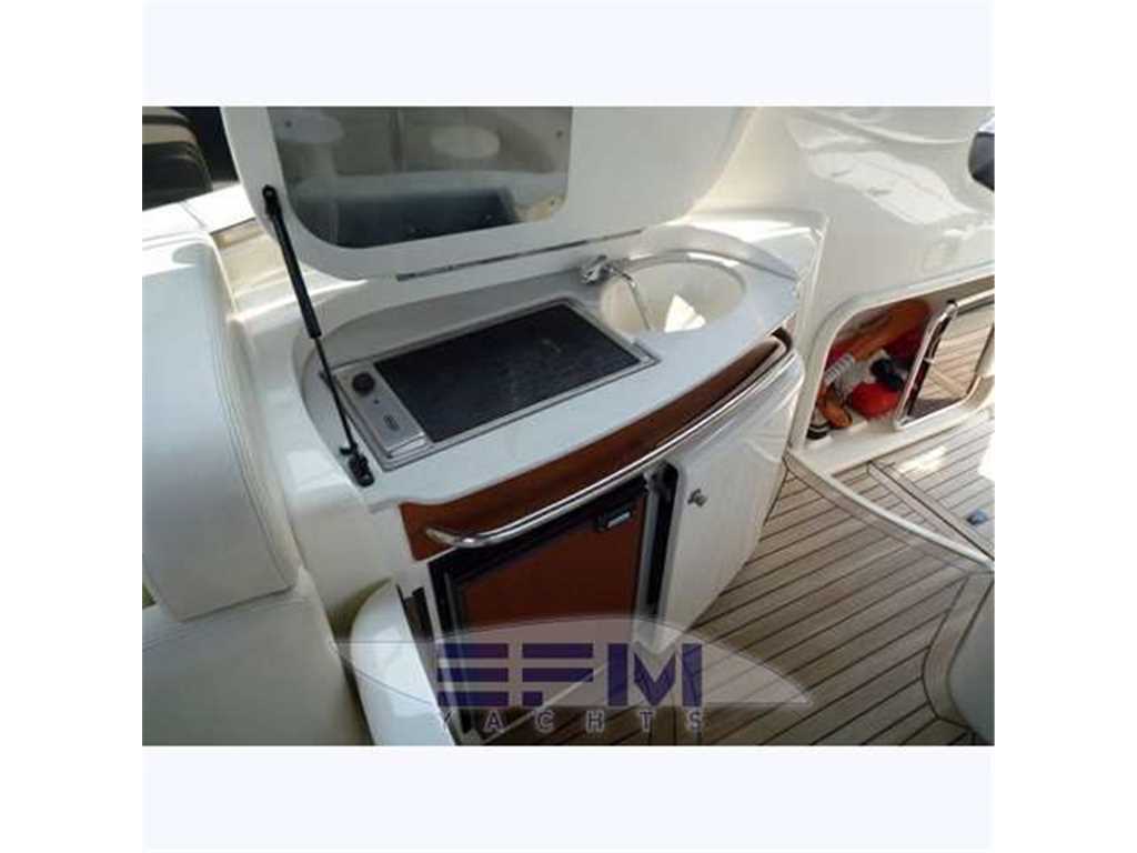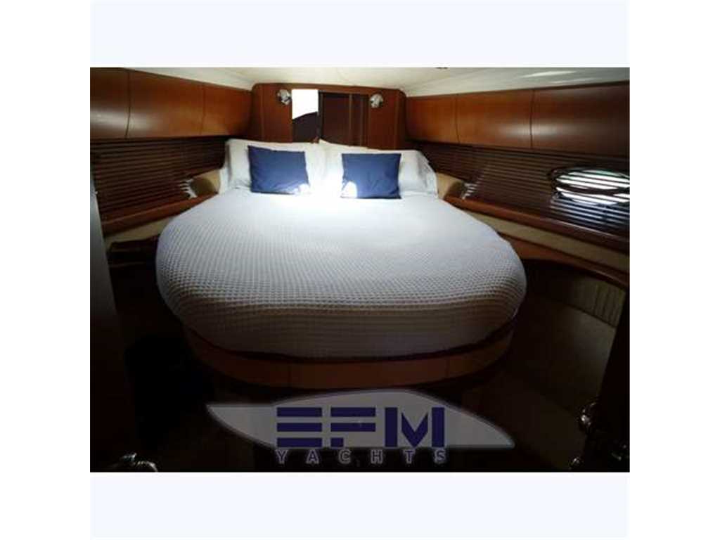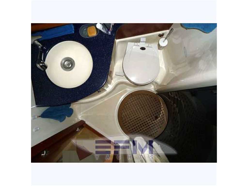 Notas internasClassici interni in ciliegio satinato e alcantara avorio, moquette beige e divaneria in pelle color avorio - Spaziosa e luminosa Cabina armatoriale a centro barca con letto matrimoniale ad isola staccato con mobile armadio e comodini + altro mobile con divano 2 posti in alcantara color avorio - Seconda grande cabina Vip a prua con letto matrimoniale ad isola con cassettiere,Tv lcd 20' Sharp , mobile armadio e pensili in ciliegio satinato e con bagno privato con wc vacuum, lavabo e box doccia - Con accesso dalla dinette a sx dopo la cucina troviamo il secondo bagno con wc vacuum, lavabo e box doccia - Ampio e luminoso salone con divano in pelle Avorio a "C" e tavolo in legno satinato sdoppioabile , ruotabile, abbattibile e trasformabile in letto matrimoniale - mobile cucina a murata sx completa con pensili, dispensa , lavello con doppia vasca , piano lavoro in corian nero , piastra elettrica a 2 fuochi, frigorifero e forno microonde - interni in alcantara avorio - dinette in legno ciliegio massello - vivibile pozzetto con divano a c e tavolo + mobile cucina esterna con barbecue frigo e lavello - garnde prendisole a poppa sopra il garage per il tender -