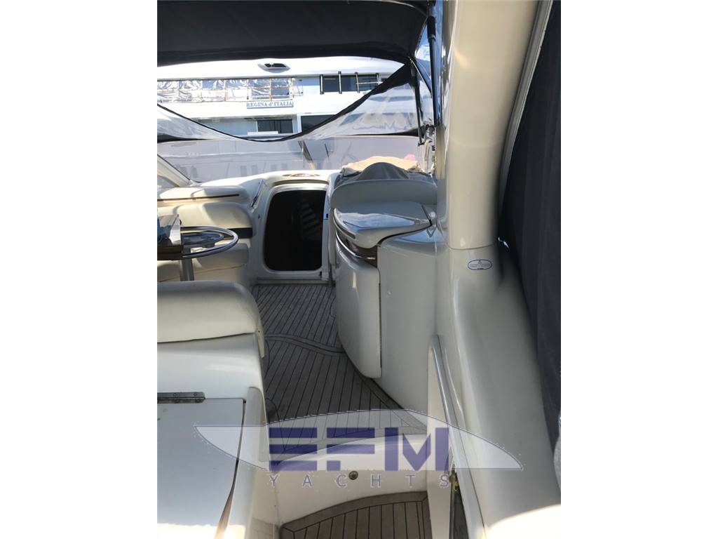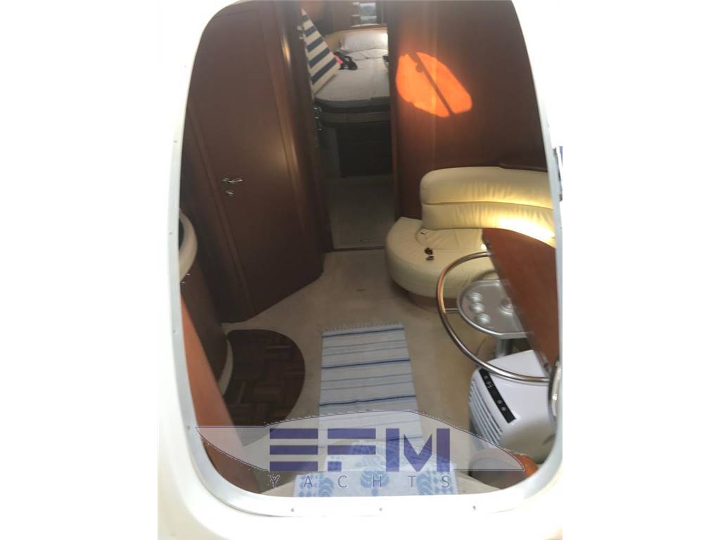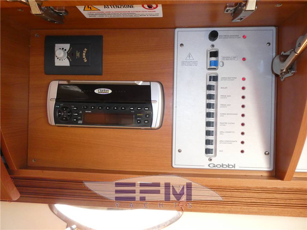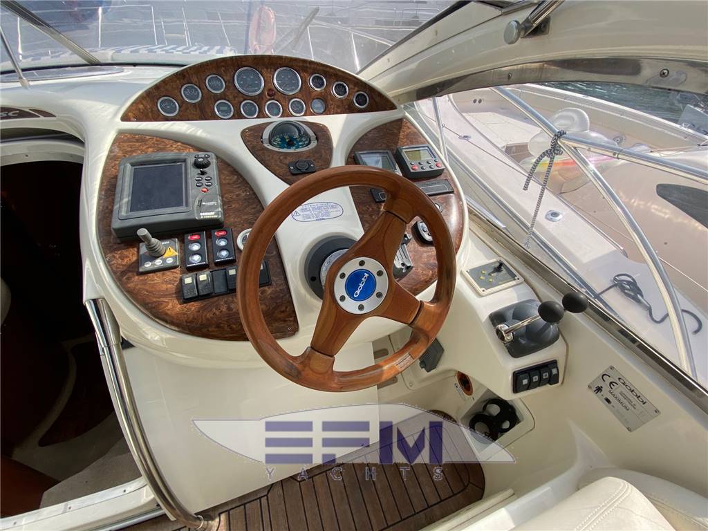 Notas internasNotas de la instrumentaciónFull VDO analogic instruments for monitoring engine parameters, oil temperature water tachometer and speedometer -Instrumentation full Raymarine electronics integrated in the dashboard: GPS chart plotter Raymarine Raytheon Lcd - Autopilot st 65, Tridata st 600 Raymarine - Raymarine GPS antenna - TV Antenna - Antenna VHF - clarion stereo with cockpit speakers and remote control - electronic throttles Volvo Penta - 3 LCD TV 20 'SONY - hydraulic flaps control - Bow thruster - digital chain counter - WHF shipmate - TV system with antenna amplified glomex - Faro electric adjustable - command gangway - Hangar aft hydraulic opening - electric windlass with remote control at the bowNotas de armamentoBow thruster - Opecmare hydraulic gangway in stainless steel and teak - cockpit and aft platform in teak - interior in satin cherry wood - outdoor galley cabinet with barbecue, fridge and sink - WC with vacum flush and black and gray water tank - hydraulic trim tabs - cockpit awning - electric windlass - external shower - swimming ladder - garage with electro-hydraulic opening - complete safety equipment - |
