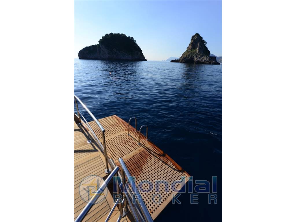 Notas internasDinette interna centrale costituita da 2 divani contrapposti con TV e tavolo centrale e trasformabile in letto; Zona cucina centrale completa di piano cottura a 4 fuochi, forno, forno, frigo da 140 litri, congelatore da 50 litri, lavello, mobili pensili, cassetti e sportelli; N°3 comode cabine per gli ospiti complete di bagno, una a prua della dinette e due a poppa, con armadi, pensili e cassetti, impianto stereo ed impianto di climatizzazione; Cabina marinaio posta a prua e completa di letto, lavabo e wc; Vano motori con apertura idraulica del portellone e comoda scala di accesso. Notas de la instrumentaciónCruscotto centrale con i 2 schermi “touch screen” da 16” Garmin Volvo Penta per il controllo completo dei motori e della navigazione con la cartografia GPS, il Radar, il Pilota automatico, l’Ecoscandaglio di ausilio all’ancoraggio, e n. 6 telecamere a circuito chiuso per una visione a 360° in manovra, e per il controllo del vano motori e del varo e ritiro dell’ancora;Bussola di navigazione; Controllo temperatura acqua motori; Controllo pressione olio motori e invertitori; Controllo giri motori; Controllo livello carburante ed acqua dolce; Temperatura vano motori Temperatura acqua mare Comandi monoleva di inversione ed accelerazione elettronici; Timoneria elettrica; Flap elettroidraulici con comandi ed indicatori di posizione; Joystick per la gestione dei motori in manovra; Impianto GPS per la navigazione; ANCORA ELETTRONICA: Sistema Garmin / Volvo per il mantenimento della posizione della imbarcazione mediante gestione automatica ed autonoma della timoneria e dei motori; Sistema SENTINEL per la trasmissione in tempo reale e continua anche in remoto su smartphone di: posizione cartografica della barca, velocità, direzione, traccia, allarmi di presenza acqua nelle sentine e stato di carica delle batterie. Pilota automatico; Radar da 48 miglia; Ecoscandaglio professionale per misura profondità fino a 700 metri con visione Radar anche anteriore della conformazione del fondale marino per ausilio della navigazione in acque poco profonde; N°4 batterie sigillate da 12V/120Ah cadauna per avviamento motori; N°8 batterie sigillate da 12V/120Ah cadauna per servizi di bordo; N°1 batteria sigillata da 12V/120Ah per accensione del gruppo elettrogeno; Fanali di navigazione a led omologati CE; Fanali anteriori e posteriori di ausilio alla navigazione notturna; Luci sommerse a LED a poppa; Luci di cortesia sui camminamenti esterni; Protezione catodica con anodi di zinco; Impianto elettrico di Protezione Catodica motori Volvo Penta Quadro elettrico generale con protezioni, strumenti di misura e di controllo; Impianto parallelo delle batterie con comando a distanza; Impianto fotovoltaico con ricarica automatica e continua delle batterie servizi da 0,5 Kw; Tromba omologata CE per imbarcazioni oltre i 12 metri; Caricabatteria 220/24V da 60Ah per le batterie dei motori e dei servizi; Caricabatteria 220/12V da 30Ah per la batteria del gruppo elettrogeno; N°2 tergicristalli con impianto per il lavaggio parabrezza; Impianto stereo con altoparlanti nel pozzetto esterno; Impianto stereo in ogni cabina ed in dinette; Schermo TV in dinette con prese esterne per DVD; Impianto VHF da 25 W; Apertura elettroidraulica del vano motori; Impianto di acqua fredda e calda con doppia autoclave per alimentazione dei bagni, della cucina interna ed esterna e delle docce esterne e cassa acque grigie; N°2 boiler elettrici da 25 lt; WC elettrico con valvola di deviazione per scarico nella cassa delle acque nere in ciascun bagno e nella cabina del marinaio; Rubinetti con miscelatori in bagno ed in cucina; Doccia con miscelatore in bagno, sulla plancia di poppa ed a prua. Pompa per lavaggio imbarcazione ad alta pressione con tubo spirale e due prese di forza per raggiungere ogni parte della barca. Notas de armamentoBattagliola con tubi da 35 mm in acciaio inox AISI 316;Ancora tipo BRUCE in acciaio inox AISI 316 da 20 Kg con idoneo musone; Catena zincata da 10 mm e 50 mt di lunghezza; N° 8 bitte in acciaio inox; N°6 passacavi in acciaio inox; Verricello salpancora da 1.500 W; N°3 winch di ormeggio da 800 W, uno a prua e due a poppa; Bow Thruster da 125 kgf; Zona poppiera da 7 metri quadrati con alloggiamento a scomparsa della passerella idraulica per consentire l’imbarco e lo sbarco degli ospiti, dell’autogonfiabile ad espulsione rapida, di un vano deposito attrezzature, dotata di una robusta battagliola di protezione con 2 cancelletti per lo sbarco e l’imbarco degli ospiti e per l’accesso alla plancia da bagno; Plancia da bagno da 4 metri quadrati in acciaio inox e teak alloggiata a scomparsa, estraibile mediante un impianto oleodinamico con pistoni idraulici in acciaio inox AISI 316; Scala da bagno in acciaio inox e teak alloggiata a scomparsa sotto la plancia da bagno e portata in posizione di utilizzo e di riposo mediante impianto oleodinamico con pistoni idraulici in acciaio inox AISI316; |
