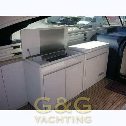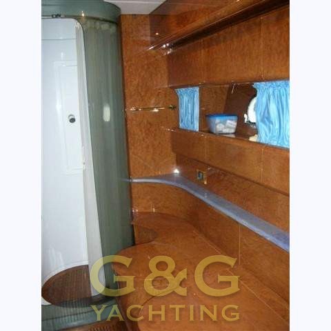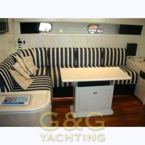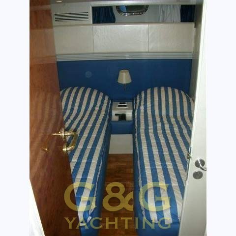 Notas internas6 camas en 3 cabinas separadas más la tripulación de cabina de armador poppa.cabina con una cama central puro y amplio cuarto de baño con ducha y bidet. cabina de invitados con 2 camas en el suelo de la derecha. en medio del barco tercera cabina de invitados con cuarto de baño. cabina de popa equippagio con la máquina de sala de acceso. habitación con C-comedor en forma, mesa de comedor y cocina. Acabados interiores tappizeria blanco / azul y cubiertas de parquet.