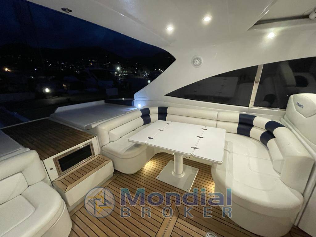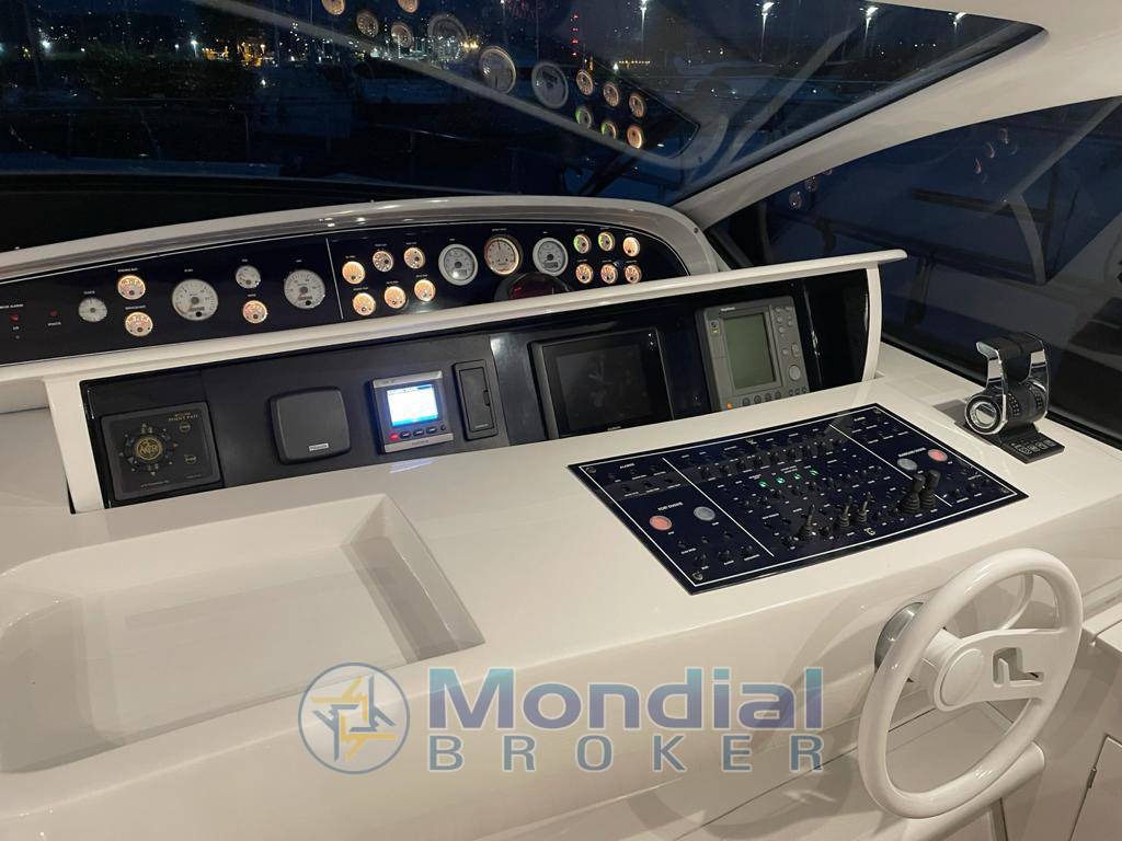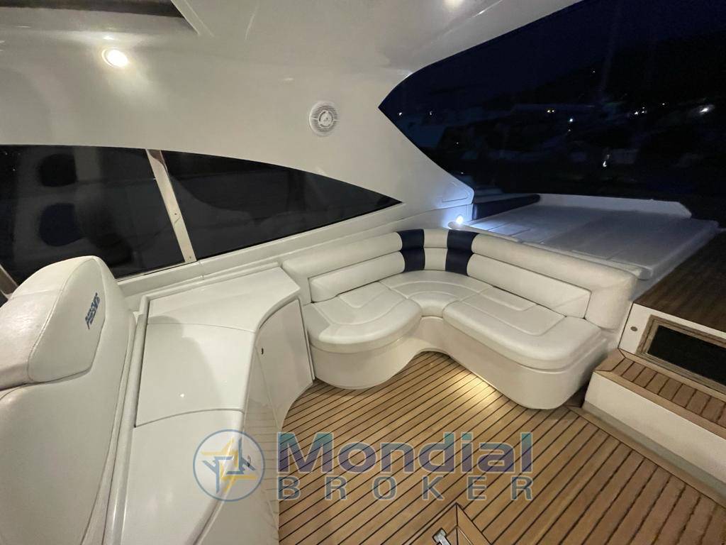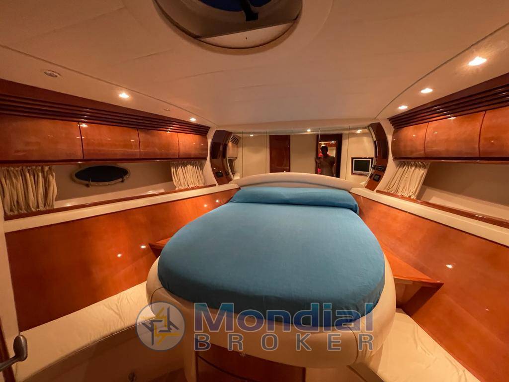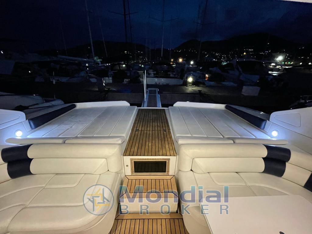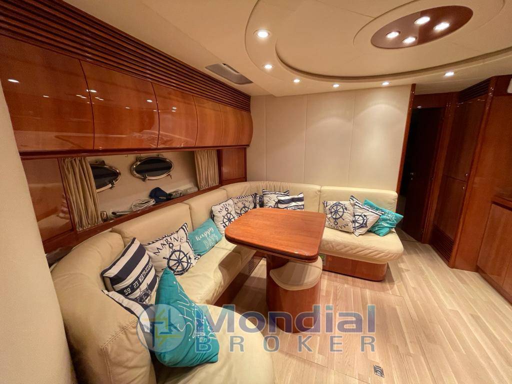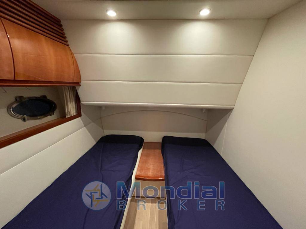 Notas internasRivestimenti interni in ciliegio lucido e pelle color panna; pavimento in parquet chiaro in dinette e nelle cabine. Ampia dinette con tavolo apribile da sei persone, divano angolare e zona cucina completa di elettrodomestici. Cabina armatoriale a prua, cabina doppia con letti in piano a centro barca e cabina con letto alla francese a poppa con entrata separata in pozzetto. Ogni cabina è dotata di bagno con box doccia separato. Pozzetto in parquet.