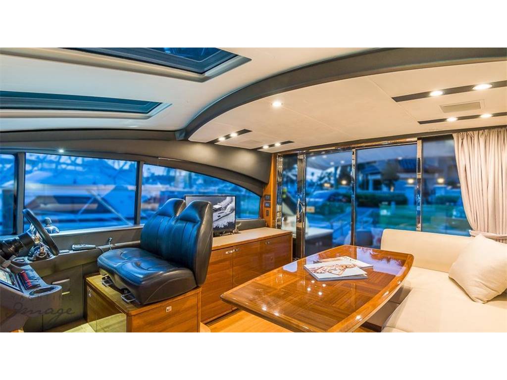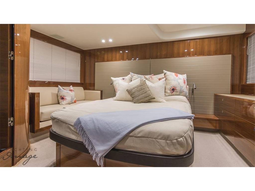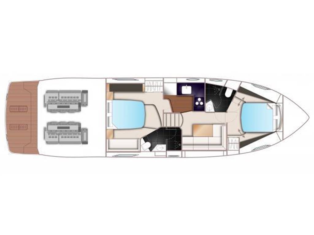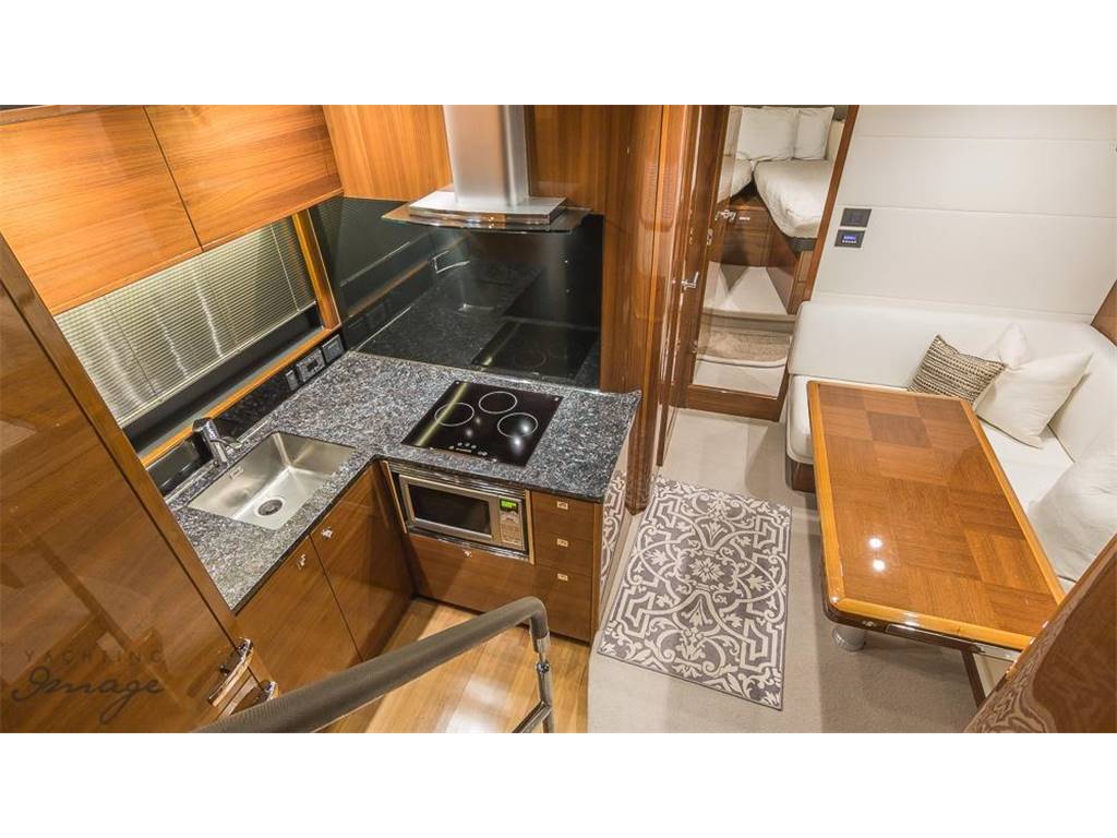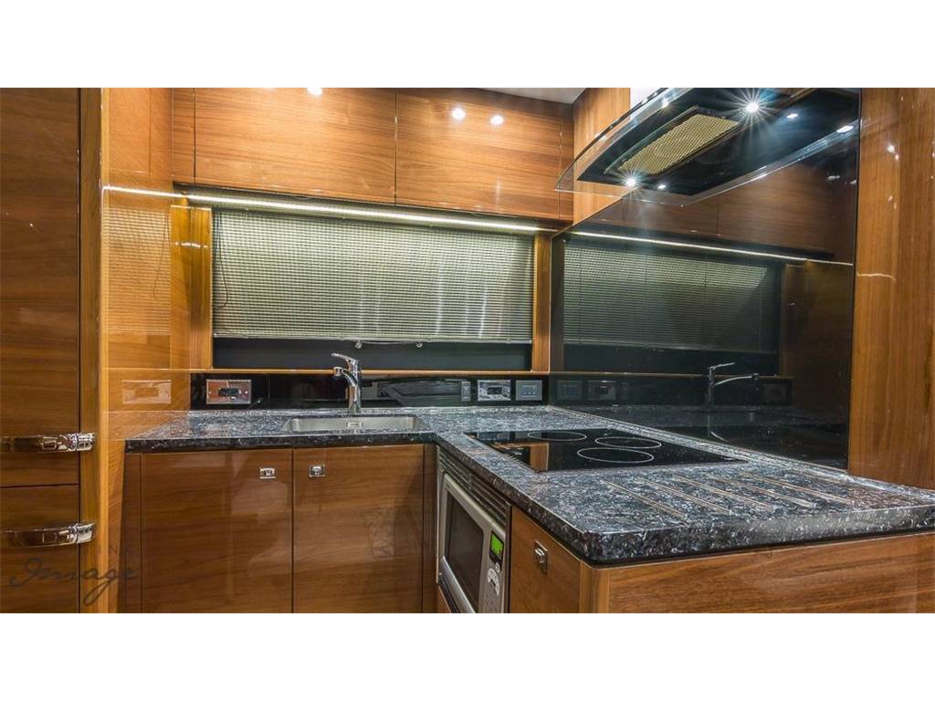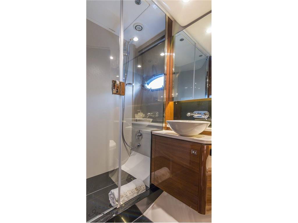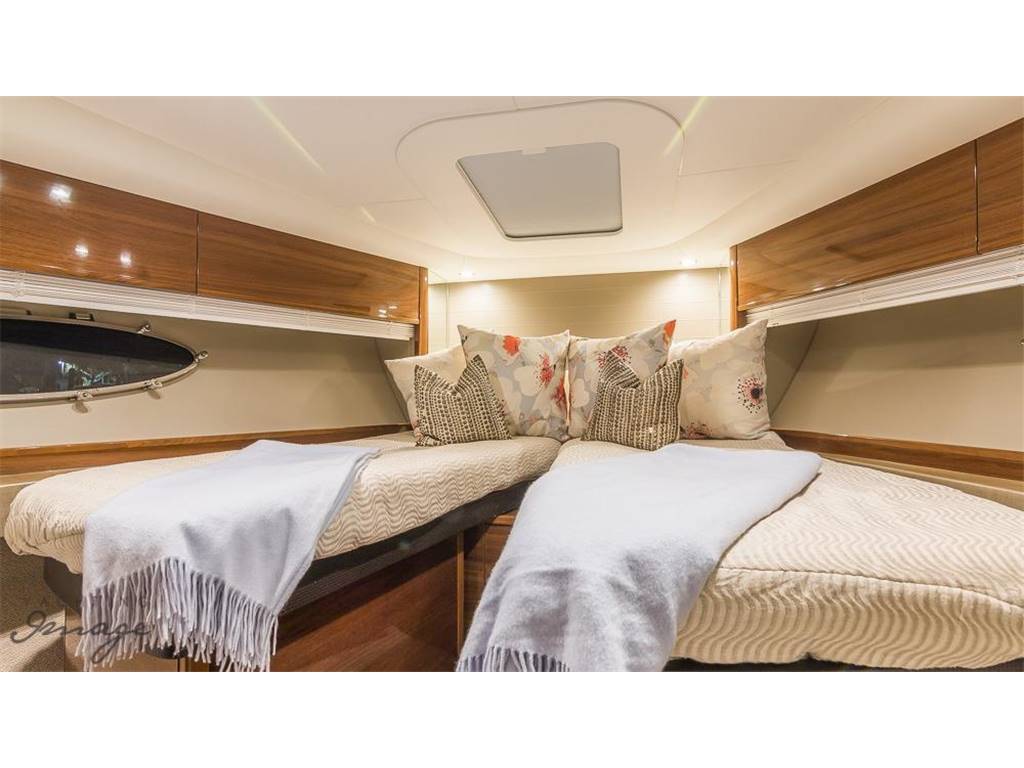 Notas internasNumber of cabins: 2 Number of heads: 2 Number of bathrooms: 2 Master Stateroom-Full Beam • Queen berth w/storage below • Hanging locker & shelves • Drawers and storage lockers • Love seat • Panoramic trapezoidal windows w/opening ports • 29” TV with DVD • En Suite head w/shower VIP-Forward • V-Berths • Hanging locker • Overhead hatch w/screen • Storage lockers • Opening portlights • 22” TV with DVD • En Suite head w/shower Notas de la instrumentaciónHelm• Helm station w/2 person helm chair (S) • Joystick control • Garmin GPS, sounder w/additional back-up Mechanical • Twin Volvo IPS 600 @ 435hp each, extended warranty to 4/2019 • Pod drive • Power- steering • Electronic engine controls • Joystick maneuvring system • Volvo active corrosion protection system • Interceptor trim tabs with indicators • Central vacuum • Onan 13.5 KW generator • Oil change system for engines and generator Electrical 24 Volt • 4 x heavy-duty batteries for engine starting • 4 x heavy-duty auxiliary batteries • Engine alternators charge via split charge relays to isolate engine start batteries from auxiliaries and ensure efficient charging of both battery banks • 40 amp 24v float battery charger • Battery paralleling system (for engine start back-up) • Remote battery master switches with control switch at main panel 220/240 Volt • Shore power inlet • Polarity check system • Earth leakage safety trip Notas de armamentoCockpit• U-shaped settee w/folding teak table • Ice maker & BBQ grill • Overhead & low level courtesy lights • Transom dual color lighting • Cockpit cover • Engine room access hatch • Life raft locker • Hydraulic swim platform w/ integrated swim ladder • AB10 VSX tender on swim platform • Hot & cold water shower • Storage lockers Upper Salon • U-shaped settee w/fixed top table • Cocktail bar • Refrigerator • Electric sun roof • Triple SS framed sliding doors to cockpit • Radio/CD/MP3 w/salon & cockpit speakers • KVH SAT TV w/3 receivers for 4 TV's • 32” TV with DVD Lower Salon • 29" TV with DVD Galley • 3 Burner cooktop • Stainless-steel sink w/Monobloc mixer tap • Combination microwave/conventional oven w/grill • Full size refrigerator/freezer • L-settee w/table (S) Deck • Reversible electric anchor winch w/foredeck & helm controls • 44 lb Delta anchor w/40m chain • Foredeck hatch • Remote control searchlight • Twin electric horns • Fuel and water fillers |