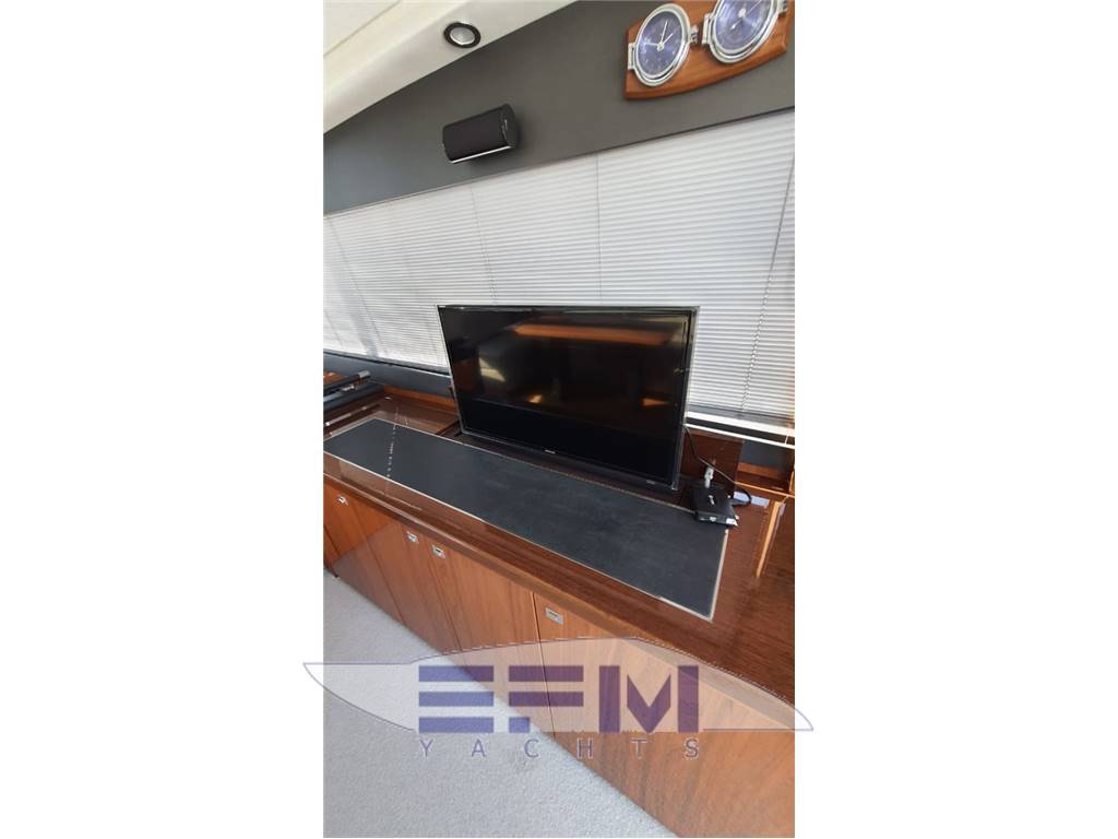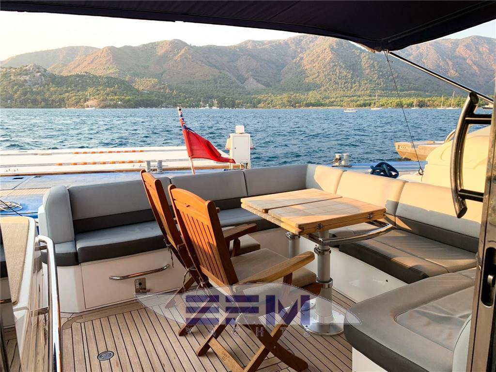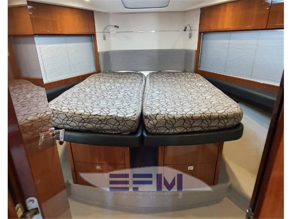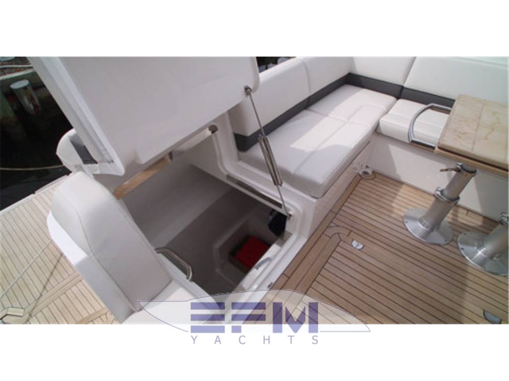 Notas internas· Teak bathing platform, cockpit and steps to side decks · Hydraulic bathing platform · Reversible electric anchor winch in the bow of the yacht and Delta anchor 20 kg · Extended anchor chain (total length 50 meters) · Stainless steel mooring cleats and handrails · Remote controlled floodlight Interior Decoration · Wooden floor in saloon, kitchen area and main helm area · Metal blinds for all windows · Interior trim in glossy dark walnut · Leather upholstery of the helm seats · Leather upholstery sofas in the lower and upper salon Upper Deck Salon · Opening doors between cockpit and saloon · U-shaped sofa and dining table · Chest of drawers with glass and storage space for bottles · Electric opening roof · Stereo radio / MP3 with speakers in saloon and cockpit · TV with a diagonal of 32 'with a system of descent and ascent Cockpit · U-shaped seat with folding teak table (table on telescopic leg with height adjustment) · Instead of the crew cabin, there is a place for storing equipment · Shower with hot and cold water on the bathing platform · Wetbar including sink, refrigerator, storage lockers and ceramic hob · · Liferaft storage box · Shore power inlet, 240V · Locker with remote fuel taps · Aft awning Lower Deck Lounge · L-shaped sofa and dining table (table with height adjustment to create an extra bed) · 32 '' LED TV, DVD, Radio / MP3 Electrical control panels 24 V and 220/240 V · Lockers for storing things Galley · 3-zone ceramic plate · Combined microwave / oven · Stainless steel sink · Fridge-freezer · Garbage container · Storage cabinets, drawers and lockers Cabins · Openable portholes in all cabins and bathrooms · All cabins are equipped with 220/240 V sockets · Spring mattresses · All bathrooms are equipped with showers, electric toilets, extractor hood and 240 V sockets Master Cabin · Large double bed with drawers downstairs · Wardrobe with shelves · Sofa on starboard side · Lockers and storage boxes. · Overhead and individual bed lighting · Bathroom · 26 '' TV VIP Cabin · Two single beds with the possibility of combining into a double · Wardrobe · Lockers for storing things · Top hatch with integrated curtain · Overhead and individual bed lighting Notas de la instrumentaciónNavigation & PowerFuel System :· Dual fuel tanks 1665 · Fuel filters Power and Drive Systems: · 4-bladed propellers made of nickel-aluminum bronze · Bow and stern thruster · Electronic engine and gearshift control · Waterless shaft seals · Engine room exhaust fan with electronic time setting Navigation Equipment · Double steering seats ·Electric opening window · Engine controls: including fuel level indicators, engine control sticks and rudder position indicator · Navigation system including VHF / RT, depth sounder with warning system and magnetic compass · Control system for wipers, bilge pump, anchor winch and trim tabs (with indicator) Raymarine Advanced Navigation Package: Raymarine i70 display (for speed, distance, depth, temperature, etc.), Raymarine p70R autopilot, Raymarine e125 chartplotter with GPS, Raymarine HD color radar with 48 ”4Kw structure scanner · Remote controlled floodlight Notas de armamentoGenerator & Electrical220/240 Volt Generator ONAN Diesel generator with increased power 11 kW in its own soundproof casing with water-cooled exhaust with special noise reduction · Inlet for shore power in cockpit locker with storage for cable · Polarity check system 24 Volt Electrical System · 4 batteries for starting the engine · 4 heavy duty auxiliary batteries · LED lighting · Reversible air conditioner (hot / cold) · Anti-fogging system for windows in front of the helm station Fire Safety Fire extinguishers · Automatic / manual fire extinguishers in the engine room with manual control · Hand-held fire extinguishers in cabins, kitchen area and saloon Water System Water heater with a volume of 50 · Water level indicator Bilge Pumps · Automatic electric bilge pumps · High performance manual bilge pump with valve |