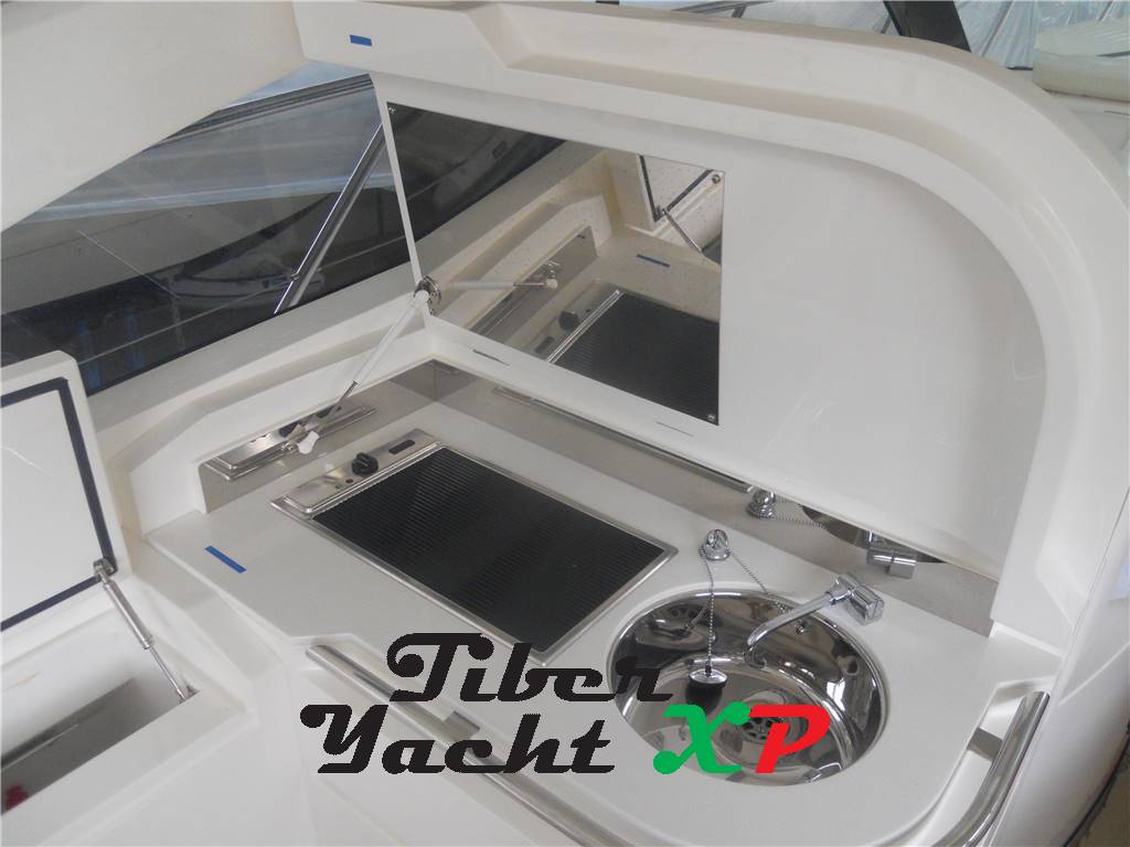 Notas internasA dritta è collocato la zona pranzo con divano a "C" con televisore di fronte. A prua troviamo cabina armatore con letto matrimoniale, con armadi e cassettiere, servito da toilette con box doccia. Cabina ospiti a centro barca con due letti in piano, con armadio e cassettiere. La cabina ospiti è dotata di toilette con box doccia. Notas de la instrumentaciónGPS Plotter Furuno NAV NetRadar Interfacciato Autopilota Raymarine ST6002 VHF Garmin 10i Strumentazione Volvo Penta Bussola EVC Motori Manette elettroniche Notas de armamentoAncora e catenaAria condizionata tropicale Generatore MASE 7 Kw Passerella idraulica a scomparsa Elica di prua Prendisole di poppa Prendisole di prua Grill nel pozzetto Stereo Impianto TV Apertura hard top elettro idraulica Frigorifero pozzetto Grill pozzetto |