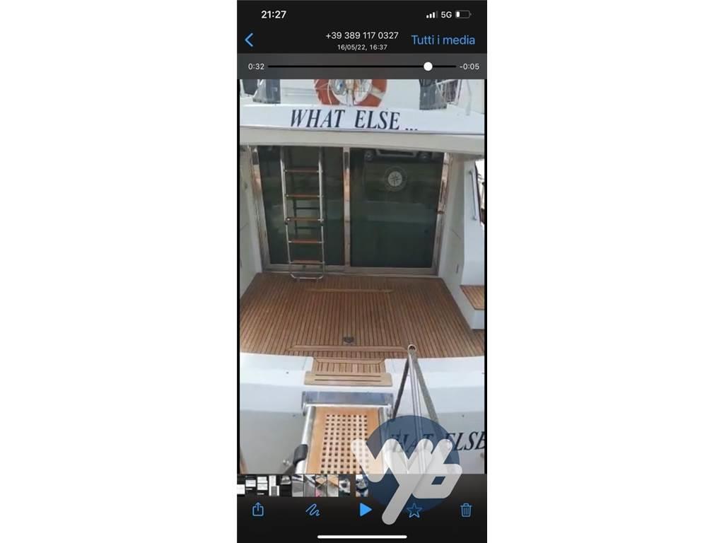 Notas internasNotas de la instrumentaciónAngolo barra, Bussola, Contametri catena, Contamiglia, Ecoscandaglio, Gps, Pilota, Vhf.Notas de armamentoAntenna Satellitare, Aria condizionata, Boiler, Cucina, Cuscineria completa, Digitale Terrestre, Frigorifero esterno, Frigorifero interno, Fabbbricatore di ghiaccio, Impianto TV, Lavastoviglie, Prese interne 12v, Prese interne 220v, Stereo, Tendalino, Allarme motore, Allarme sentina, Autoclave, Batterie, Caricabatterie, Doccia esterna, Doppia timoneria, Elica di prua, Faro orientabile, Flap idraulici, Impianto antincendio, Passerella, Pompa di sentina elettrica, Pompa di sentina manuale, Porta ingresso, Pozzetto Teak, Presa 220V banchina, Salpa Ancore Elettrico, Scaletta da bagno, Tavolo pozzetto, Tender, Winch tonneggio di poppa |
