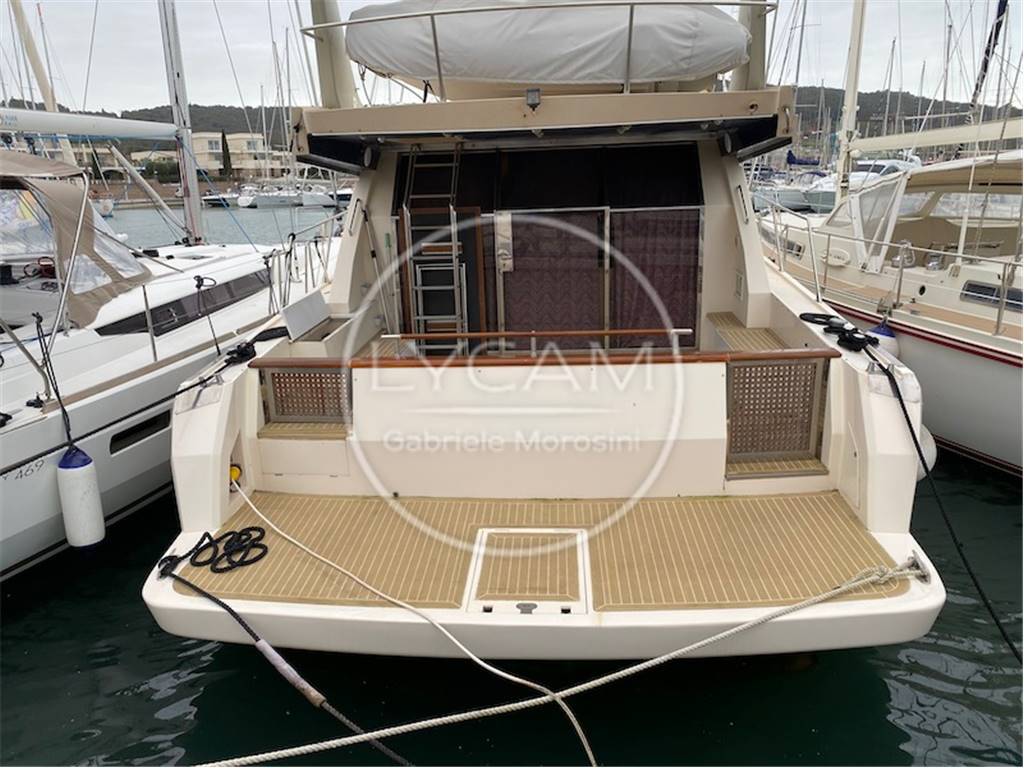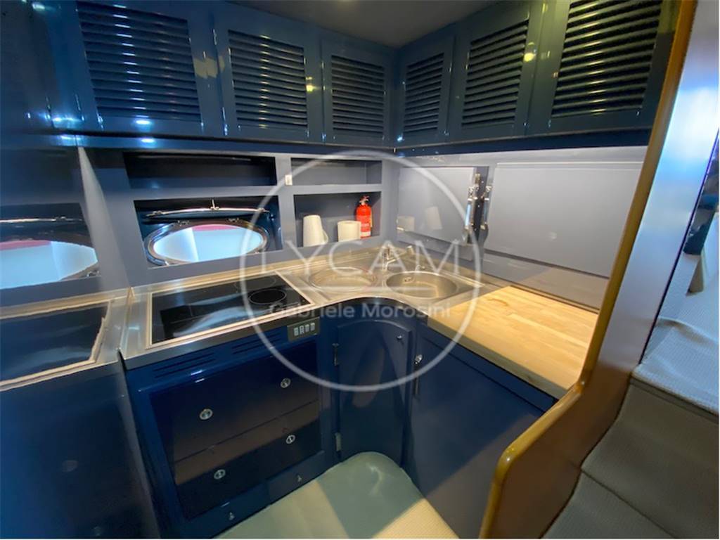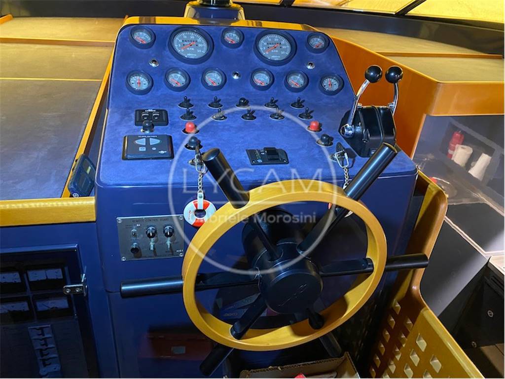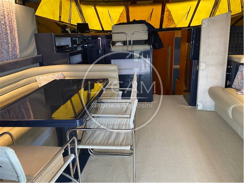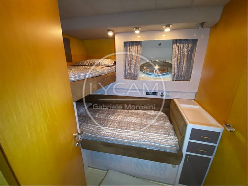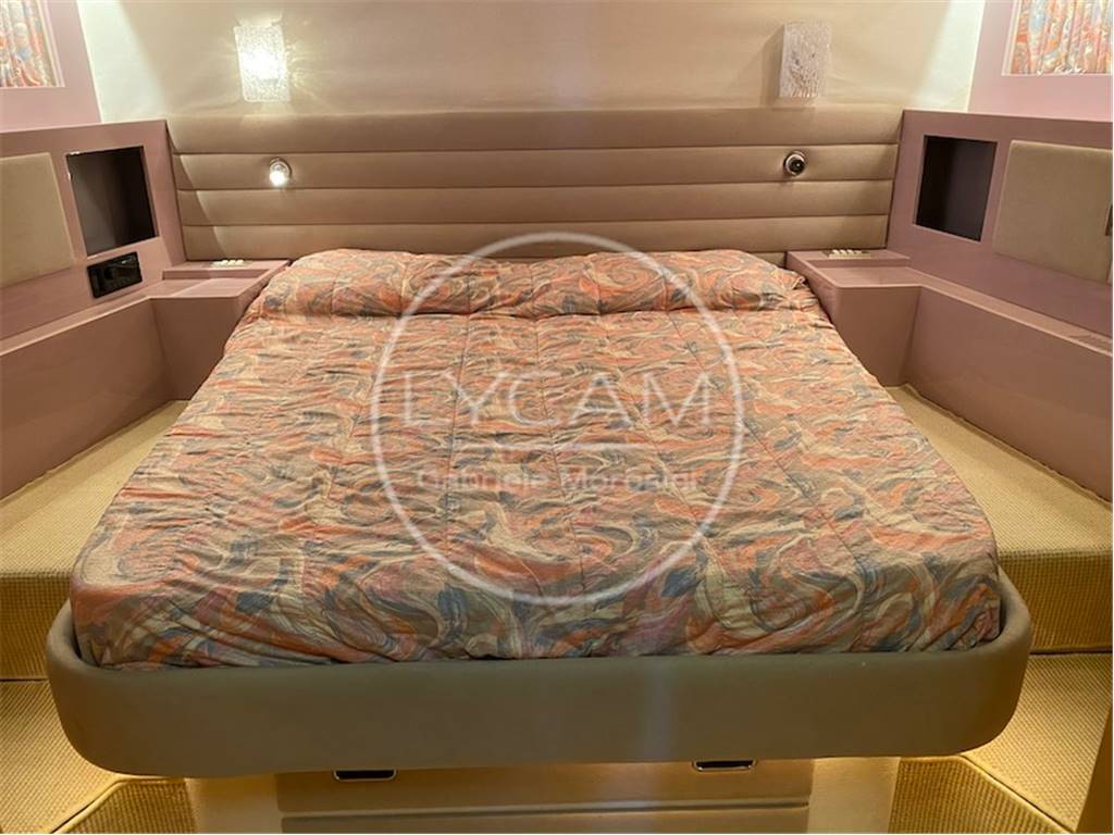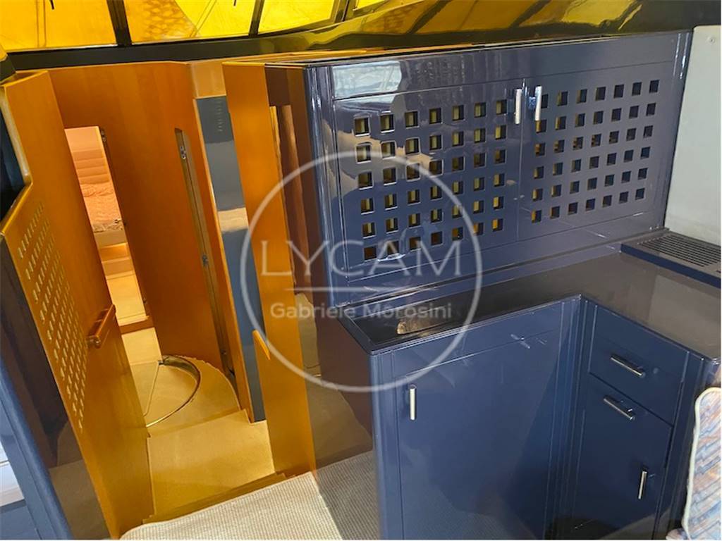 Notas de armamentoLa barca è equipaggiata con: Luci di navigazione; Luce di fonda; Faro orientabile; Flaps idraulici; Aria condizionata; Boiler; Congelatore; Fuochi ad induzione; Cuscineria di poppa/prua/fly; Impianto acque nere; Teli copertura finestrature; Telo copertura fly; Tendalino; TV; Frigo interno; Autoclave; Batterie; Caricabatterie; Passerella idraulica; Pozzetto teak; Raddrizzatore; Scaletta bagno; Doccetta pozzetto; Tender; Winch tonneggio poppa/prua. Autogonfiabile; Dotazioni sicurezza entro 50 miglia.