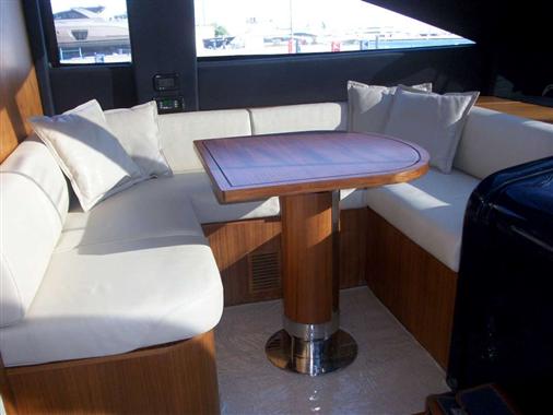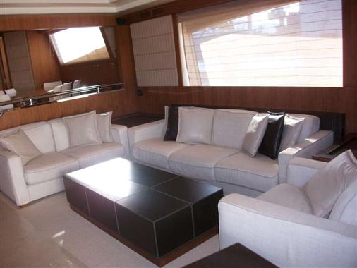 Notas internasEn nogal canaletto con inserciones de cuero. Cubierta principal: amplio salón comedor con sofás y separar comedor, cocina separada con puerta de salida en la Pasarela lateral, Caseta con comedor, cuarto de baño. Cubierta inferior: cabina de armador en el centro de la embarcación con vestidor y baño completo, cabina VIP en el arco con baño, dos camarotes con dos camas en cada plan. Ãrea del equipo popa con un único y una cabina doble, un baño.