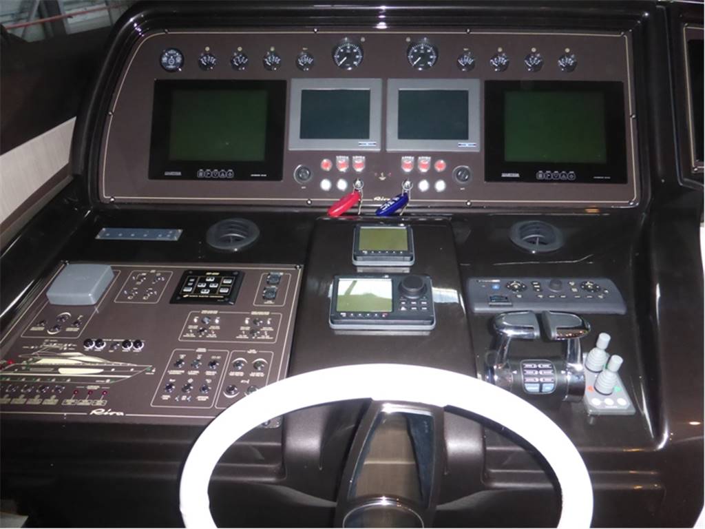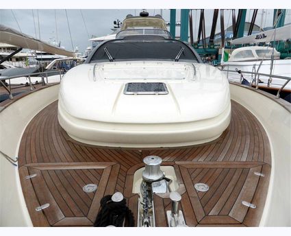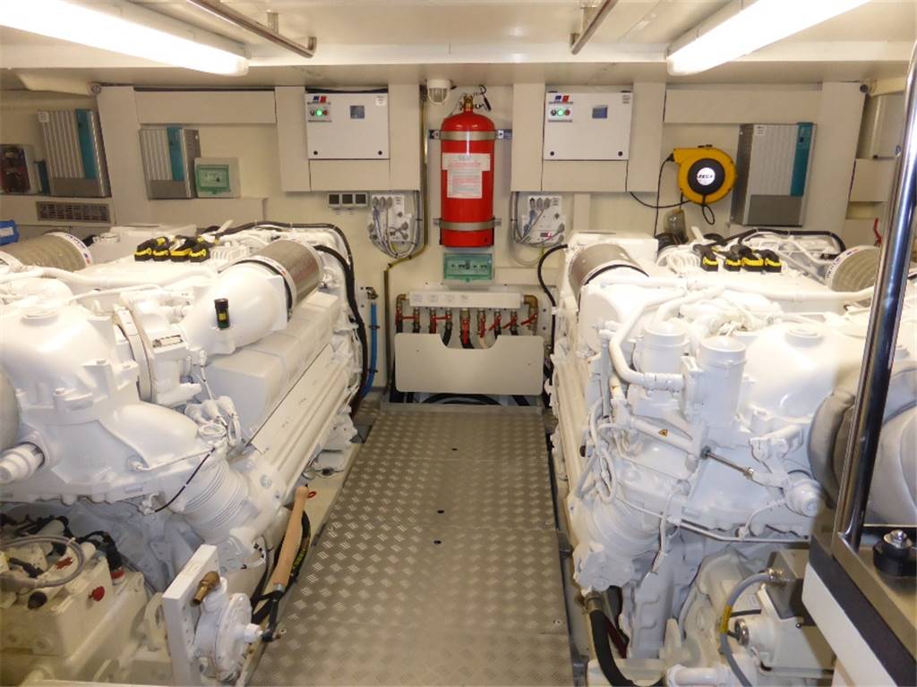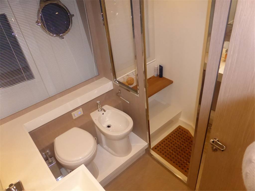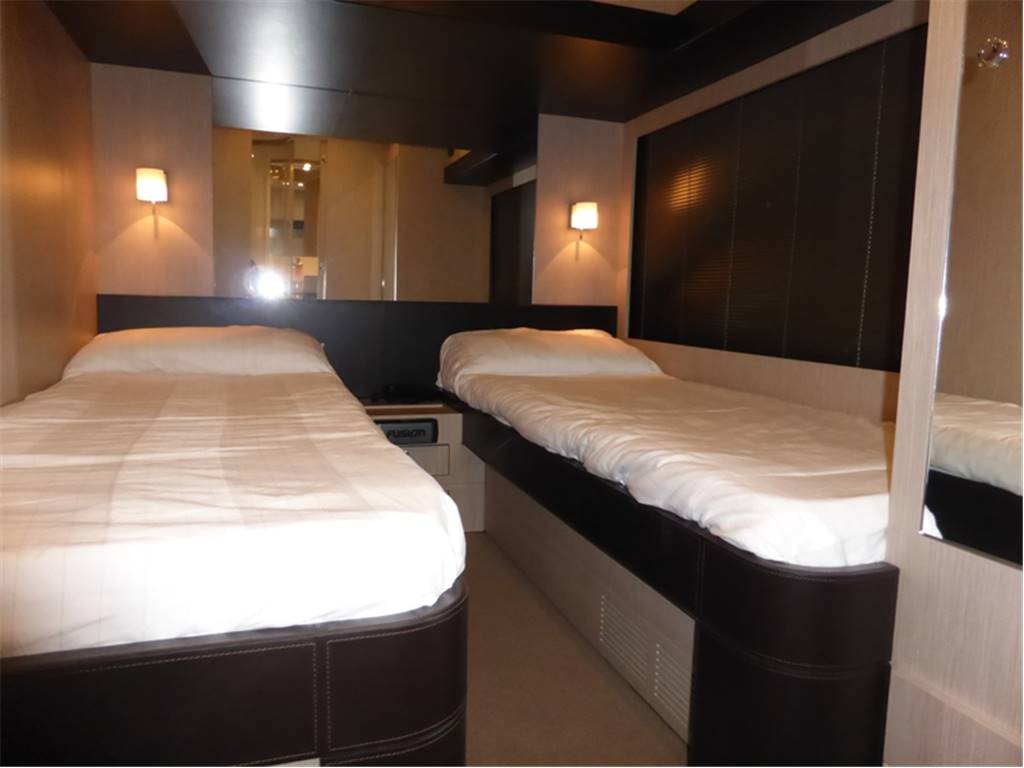 Notas internasVIP cabin in the bow with queen size bed, closets with doorstep lamp and mirrors shutters. 20” LCD TV, stereo with cd, mp3. Bathroom with lucid washbasin plate, glass washbasin with mixer, electric WC with bidet in ceramics, shower with teak grating, Plexiglas doors and stainless steel and seat fold in teak. 2 Guest cabins with twin beds, closet with drawers and doorstep lamps, 15” LCD TV, bathroom with lucid washbasin plate, washbasin in glass, wc with bidet electrical combined (the other guest bathroom has the bidet in ceramics) Crew area Complete kitchen, with sink, hotplates in pyroceram, extractor hood with external draining Dining area with crystal and stainless steel table for 8 people, chairs, leather sofa, furniture for the cutlery Salon with leather sofa, 2 armchairs, leather magazine rack, service mobile with drawer fridge, ice maker, plasma TV with lifting device, Bose stereo device with cd, mp3 leather and speakers in the salon, bridge, cockpit and fly. Notas de la instrumentaciónAdditional DescriptionPasserelle Teak flybridge Teak side decks Second generator Bimini hard top Teak laid cockpit floor Self draining Moulded staircase to flybridge Stern seating Stern safety door Engine room access hatch 2 x stern capstan winches 24v and fairleads Cockpit speakers Overhead cockpit lights 24v Low-level courtesy lights aft cockpit 24v Twin engines Soundproofing throughout engine room 2 x aluminium cross balanced fuel tanks with electric sending unit Separate fuel filters/water separators Automatic fire extinguishers Engine room and forward bilge flood alarms 2 x automatic bilge pumps 2 x automatic flood pumps 4 x extractor fans 24v Manual bilge pum Notas de armamento• Hull color: DARK BLUE• ARG Mitsubishi zero-speed stabilizer system (Anti-Rolling-Gyro) • SAT receiver KVH M7 • Teakdecks • Besenzoni Gangway hydraulic • Besenzoni crane hydraulic on fly bridge • Tender 340 + FB. • Hydraulic swim ladder • Stern thruster electrical 15 HP • Bow thruster electrical 15 HP • Electric stove Tecma • Air conditionTropical 144.000 BTU/h • Battery charger Mastervolt 100A 24V and Inverter • 2 Generators 1x20 1X16 kW Kohler • Bosch dish washer • Microwave and ofen • Miele washer/dryer • Fridge 221 ltr and freezer 93 ltr • PLASMA LCD TV in salon, 32“ LCD TV in master cabin • WI-FI system router on board • Third control station on aft • Full Raymarine electronics instruments • Crane on fly • Teak cockpit, bath platform , side walk and flybridge |