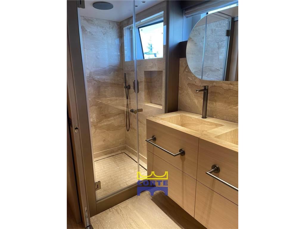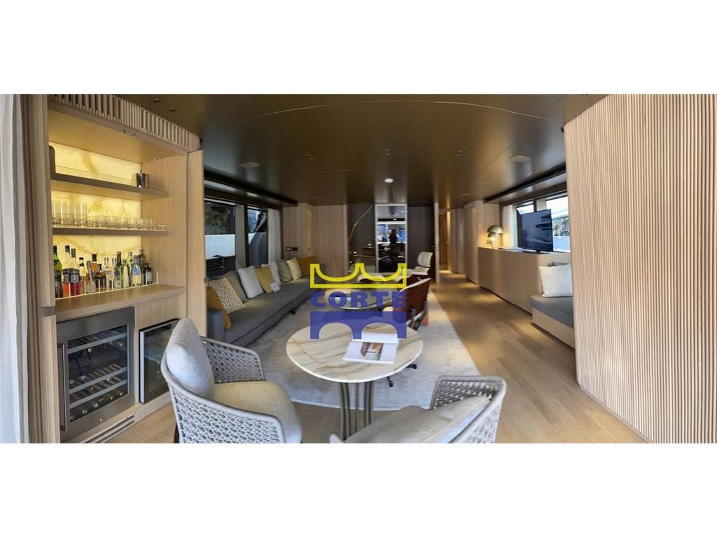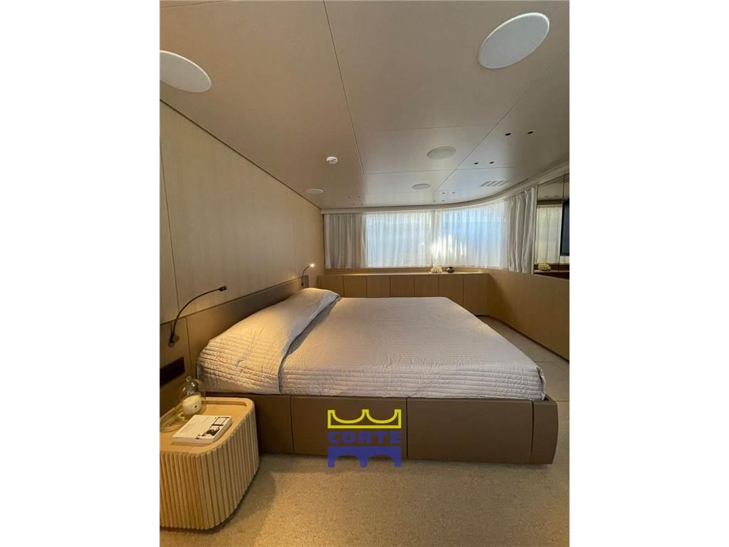 Notas internasNotas de la instrumentaciónAntenna radar, Bussola, Comando motori elettronico, Computer di bordo, Contametri catena, Contamiglia, 2 Display (monitor a colori 17' per CCTV (n° 1 in cucina e n° 1 in dinette equipaggio)), Ecoscandaglio, Pilota automatico, Plotter con antenna GPS, Radar, Radio VHF.Notas de armamentoAllestimento tecnico e di coperta:Allarme fumo/gas, Allarme motore, Allarme sentina, Ancora, Camminamenti laterali in teak, Doccia esterna (con colonna in inox), Doppia timoneria, Elica di poppa - stern thruster (idraulica), Flap elettrici, Impianto antincendio, 6 Luci subacquee (led), Passerella, Pompa di sentina automatica, Pompa di sentina elettrica, Pompa di sentina manuale, Porta ingresso, Porta laterale, Pozzetto Teak, Presa 220V banchina, Presa acqua banchina, Salpa Ancore Elettrico, Scaletta da bagno, Tavolo pozzetto. Dotazioni domestiche di bordo: Aria condizionata, 5 Cassaforte, Dissalatore (Idromar 250 l/h), Pavimento interno in legno, Prese interne 12v, Prese interne 220v, Riscaldamento, 5 Telecamera (CCTV IP Panasonic (con DVR) 2 telecamere fisse in pozzetto, 1 telecamera pan &tilt, 2 fisse in sala macchine), WC marino elettrico. Intrattenimento: Antenna Satellitare TV (KVH TV8), Decoder satellite, Digitale Terrestre, Impianto TV, Radio AM/FM. Cucina ed elettrodomestici: Congelatore, Forno (Gaggenau/Miele da 90 cm), Frigorifero esterno (in upper deck), Frigorifero interno, ICE Maker (Vitrifrigo), Lavatrice, Piastra in vetroceramica (Gaggenau/Miele da 90 cm), Winecooler. Tappezzerie: Cuscineria di poppa, Cuscineria di prua, Cuscineria fly, Tendalino (per la zona full beam davanti alla timoneria e per la zona upper deck). |