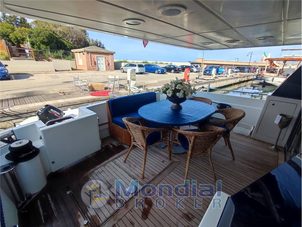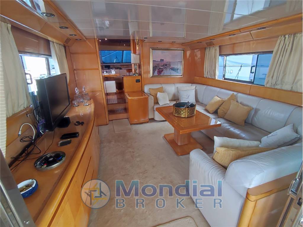 Dal pozzetto, attraverso una robusta porta scorrevole con vetro oscurato si entra in un elegante salone con a destra ampio divano e sulla sinistra zona intrattenimento con mobile TV - Dal Salone si accede direttamente al Fly attraverso una comoda scala - Cucina in ambiente separato con fuochi a induzione, forno, grande frigorifero, microonde, lavello inox, lavastoviglie - Portello laterale - Davanti alla cucina piccola dinette con divano in pelle, accanto alla dinette troviamo la timoneria interna e l'accesso alla zona notte con elegante scala servita da luci di cortesia notturne -